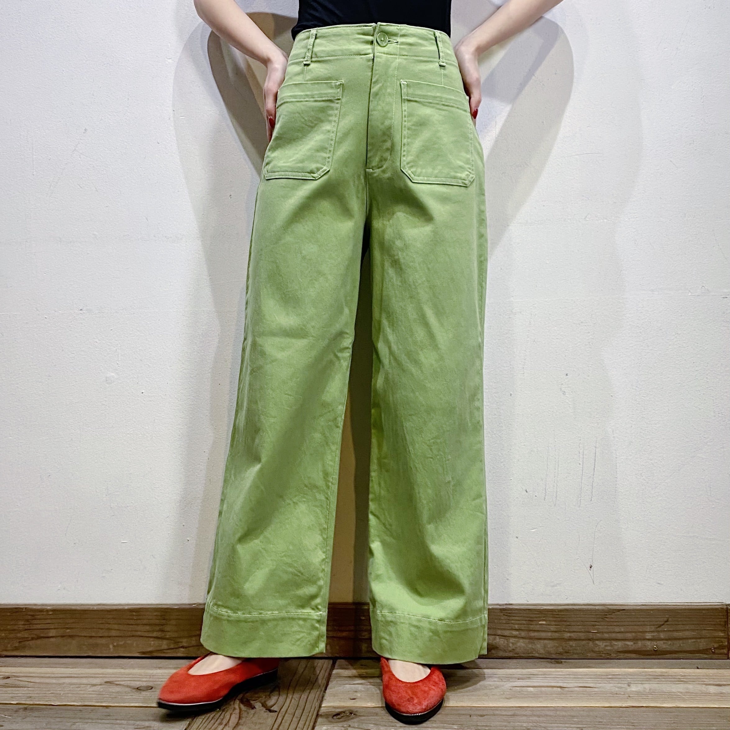 黄緑の色合いが可愛い、ワイドパンツです。