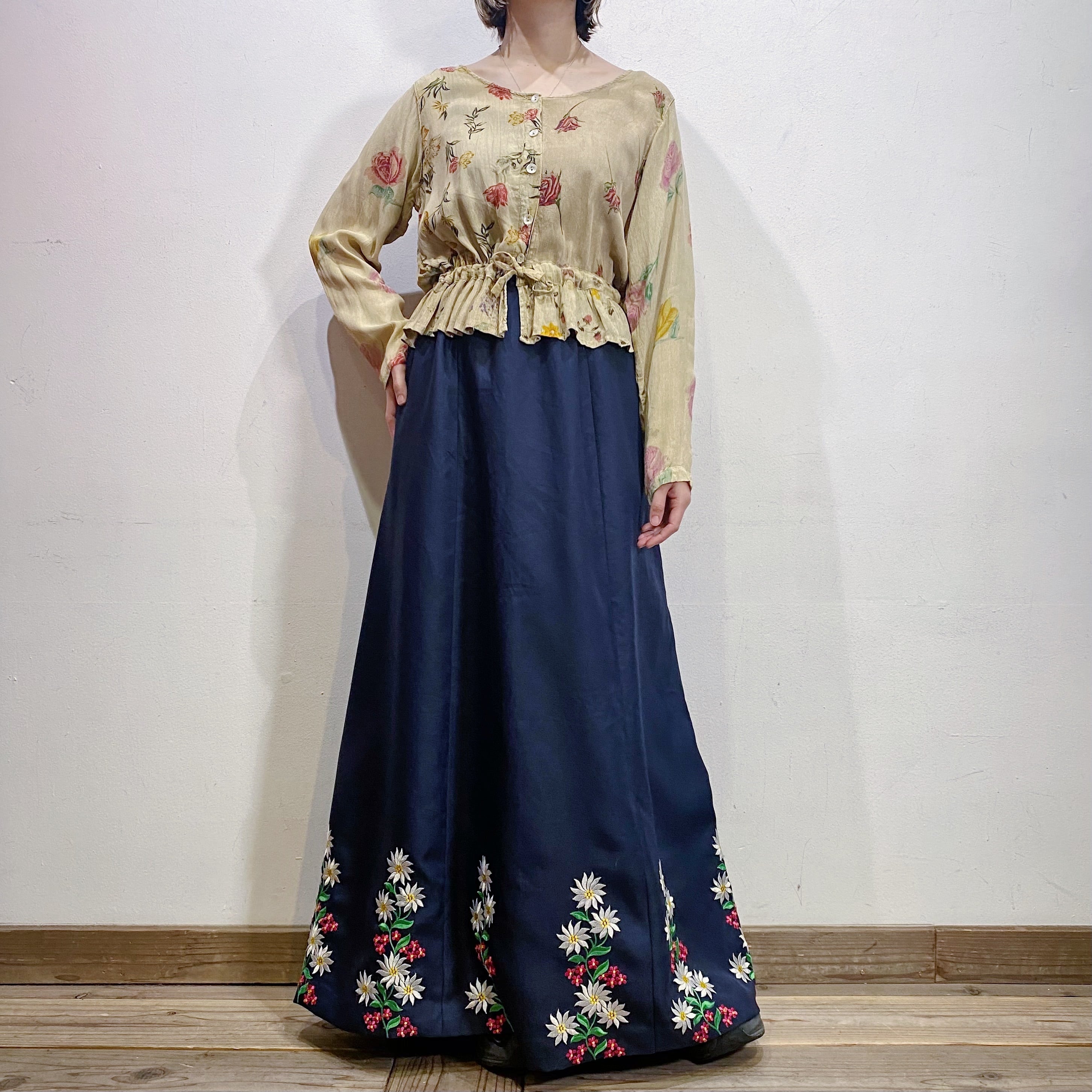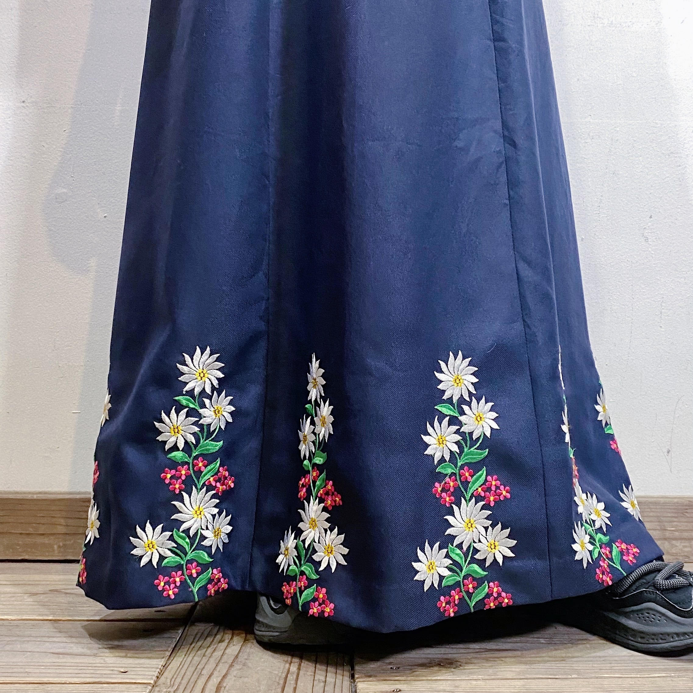 60s navy flower embroidery long skirt【198】