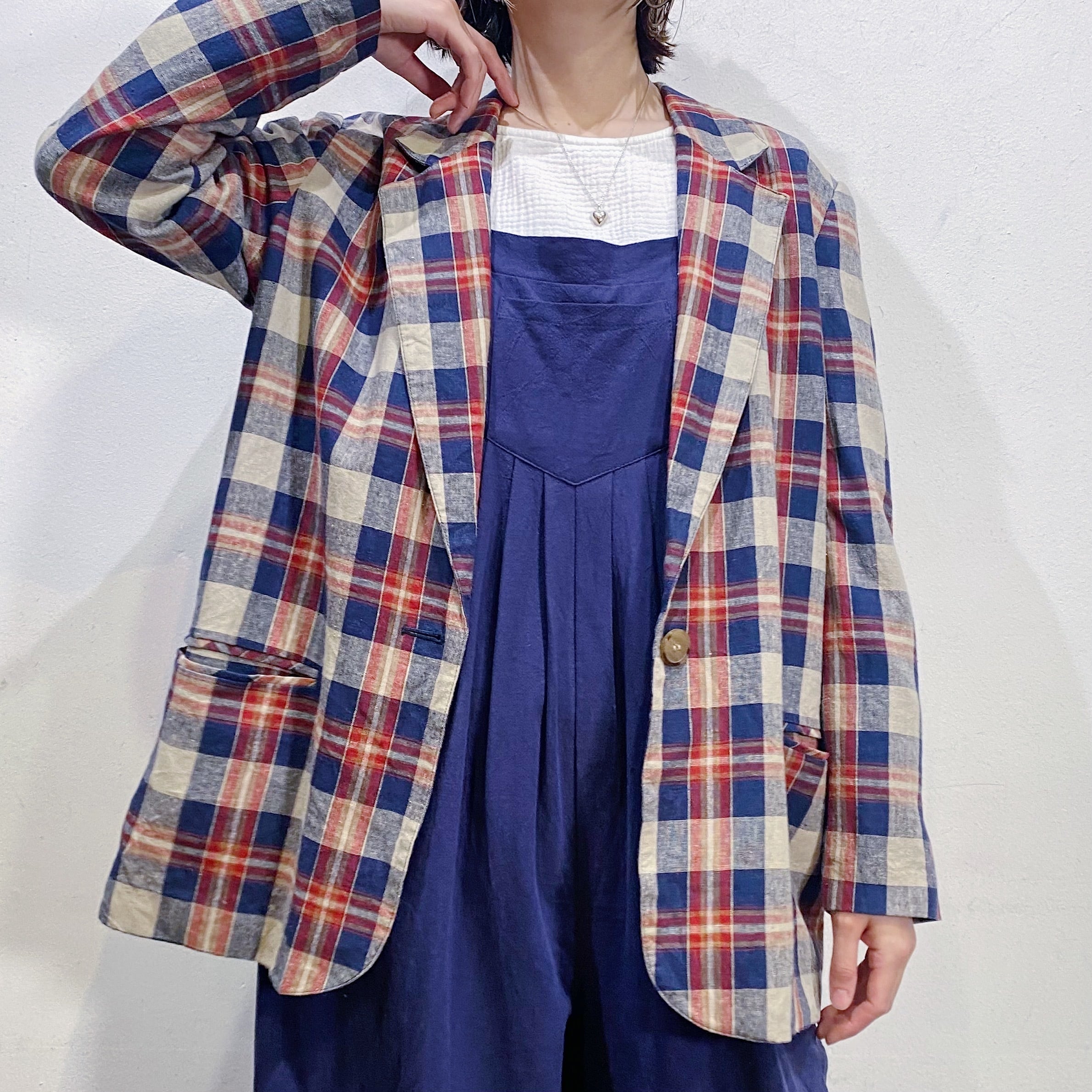 90s linen navy and red plaid jacket【554】