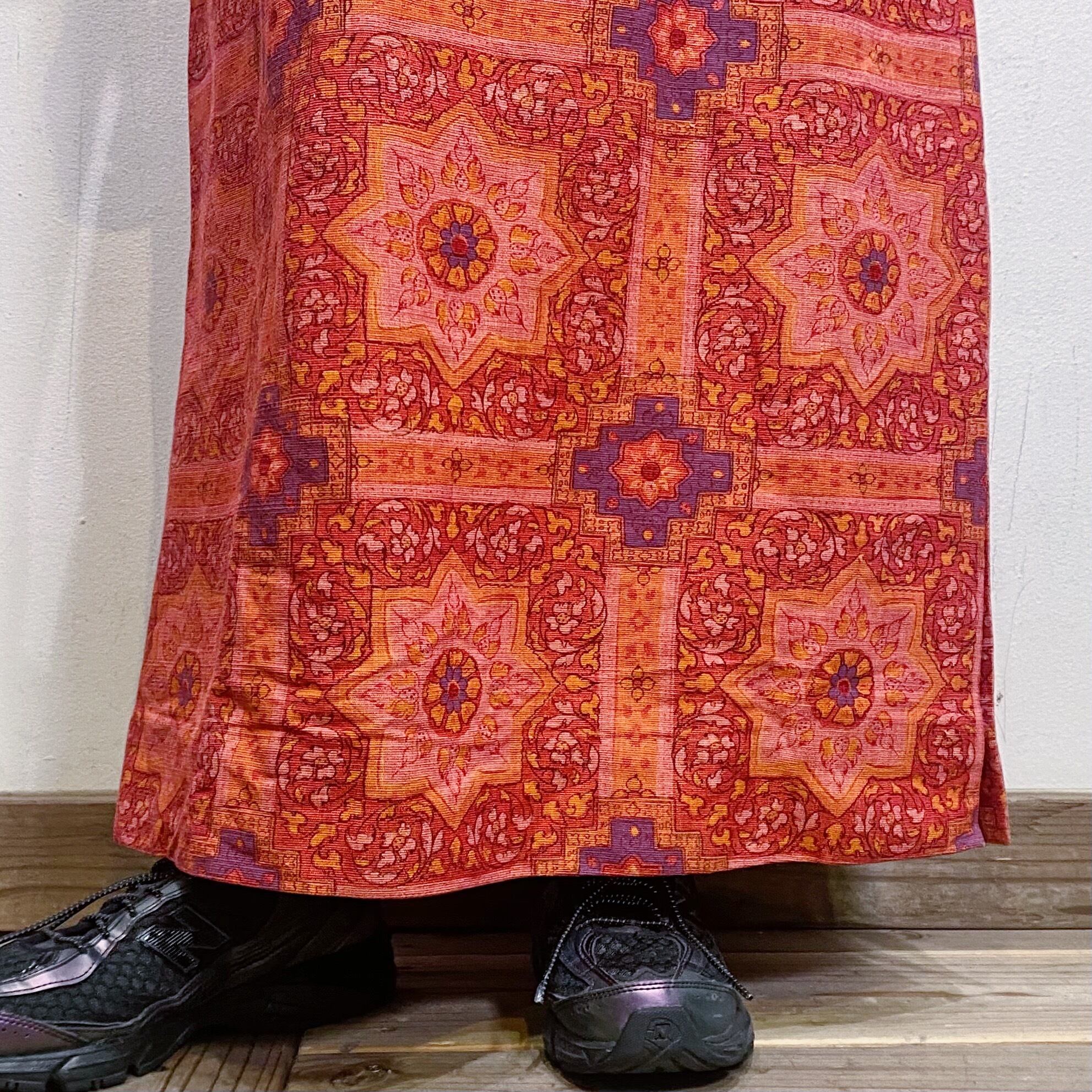 60-70s red cotton flower printed long skirt【109】