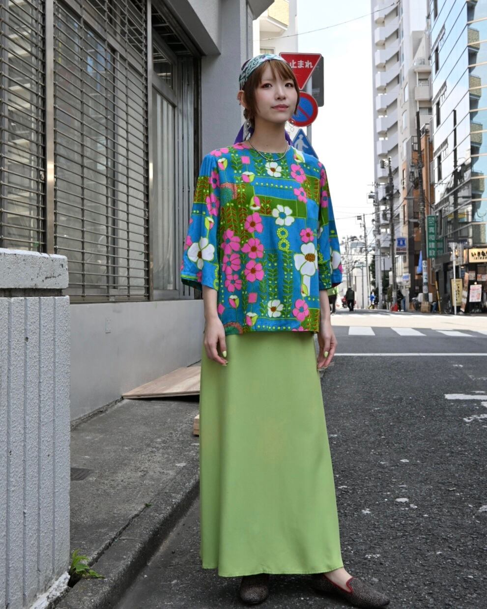 パープルやピンク、グリーンの色合わせが可愛い、花柄スカーフです。