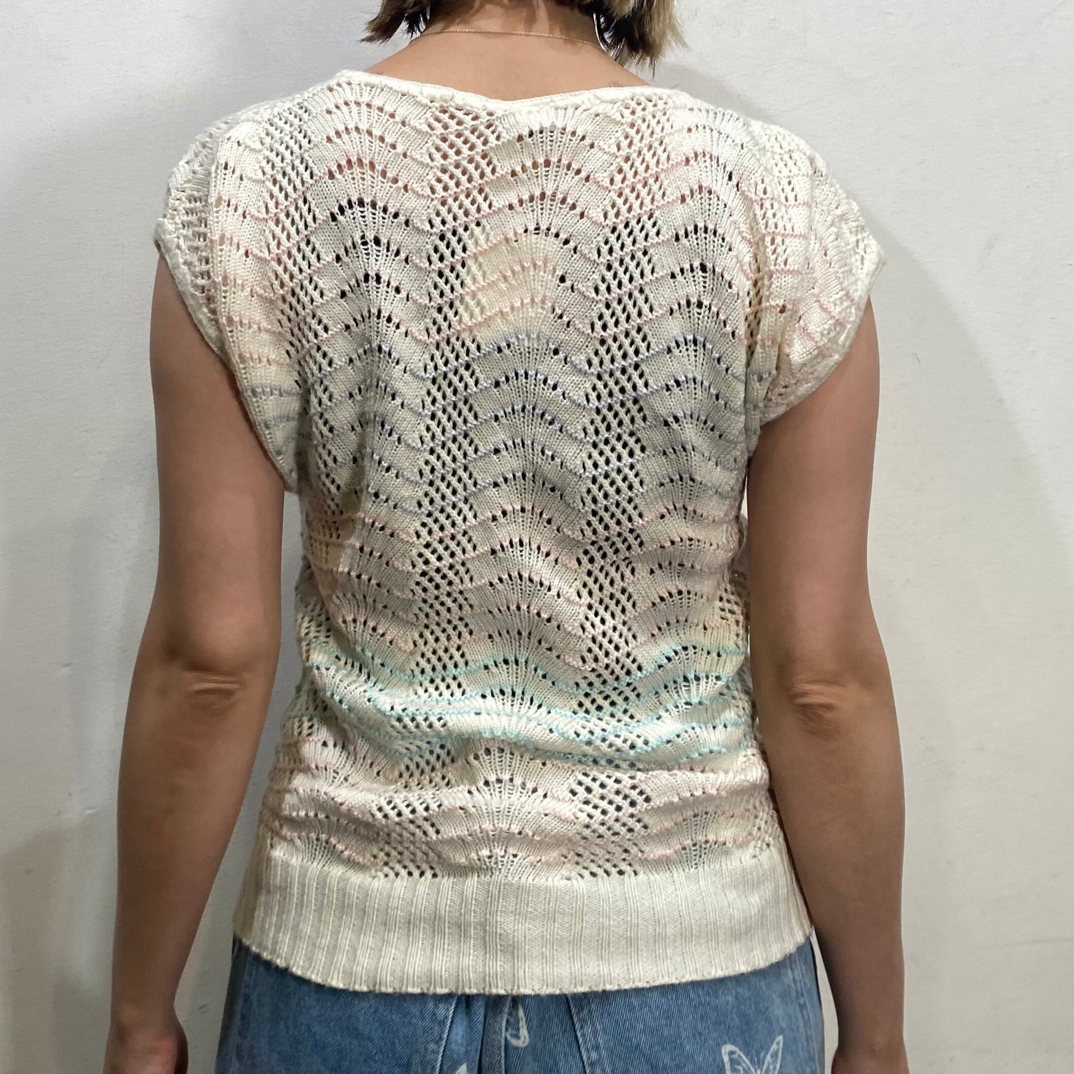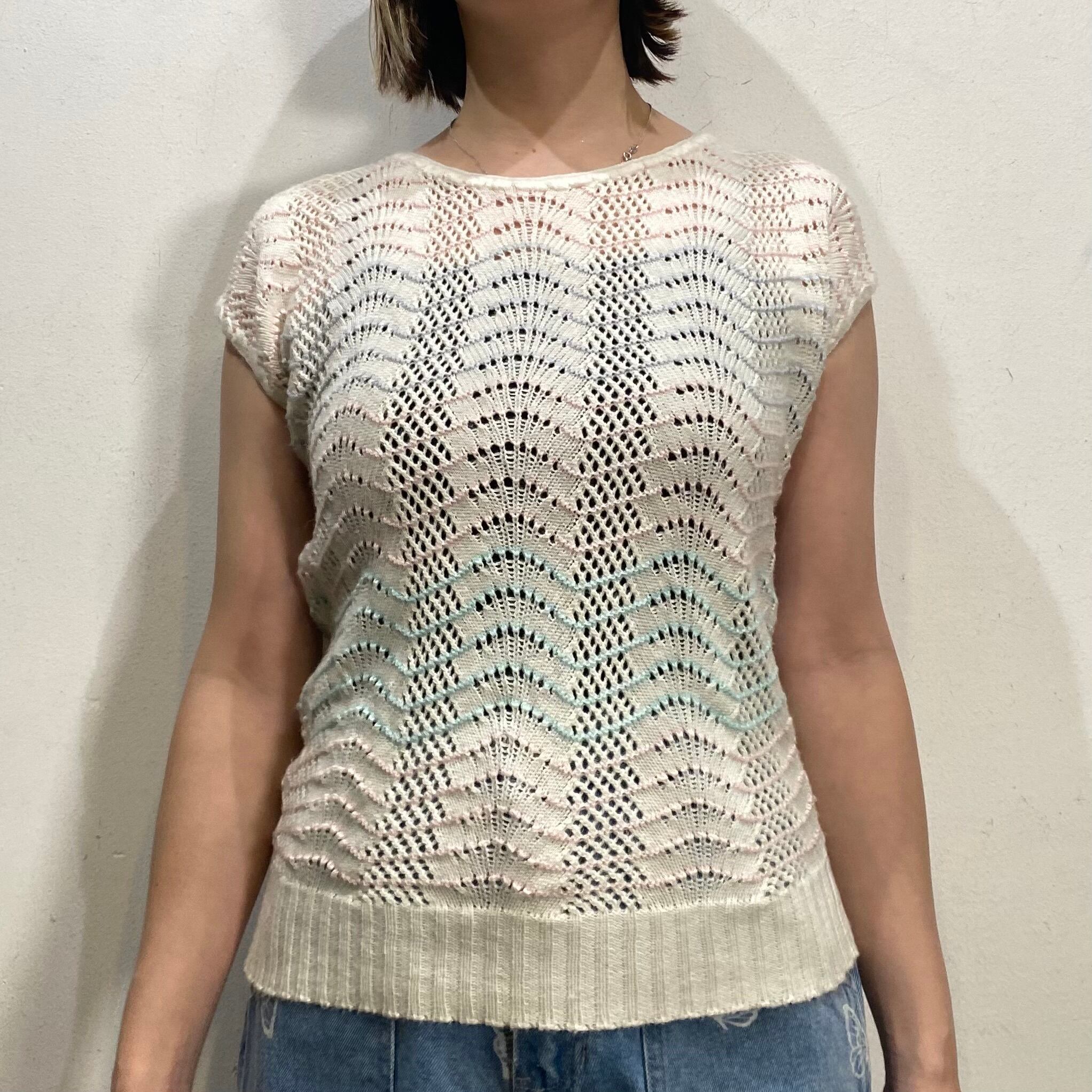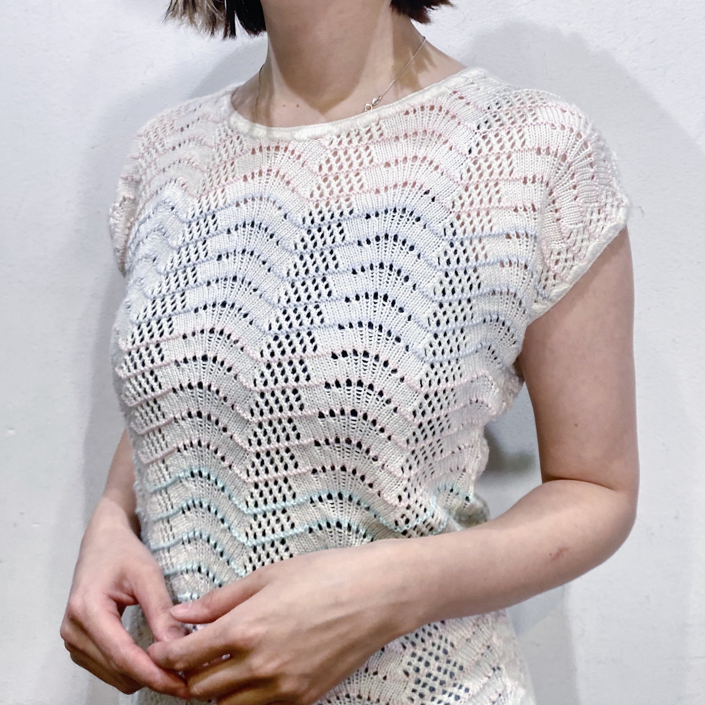 パステルピンクやラベンダー、水色のなみなみとした模様が可愛い、80年代のサマーニットトップスです。