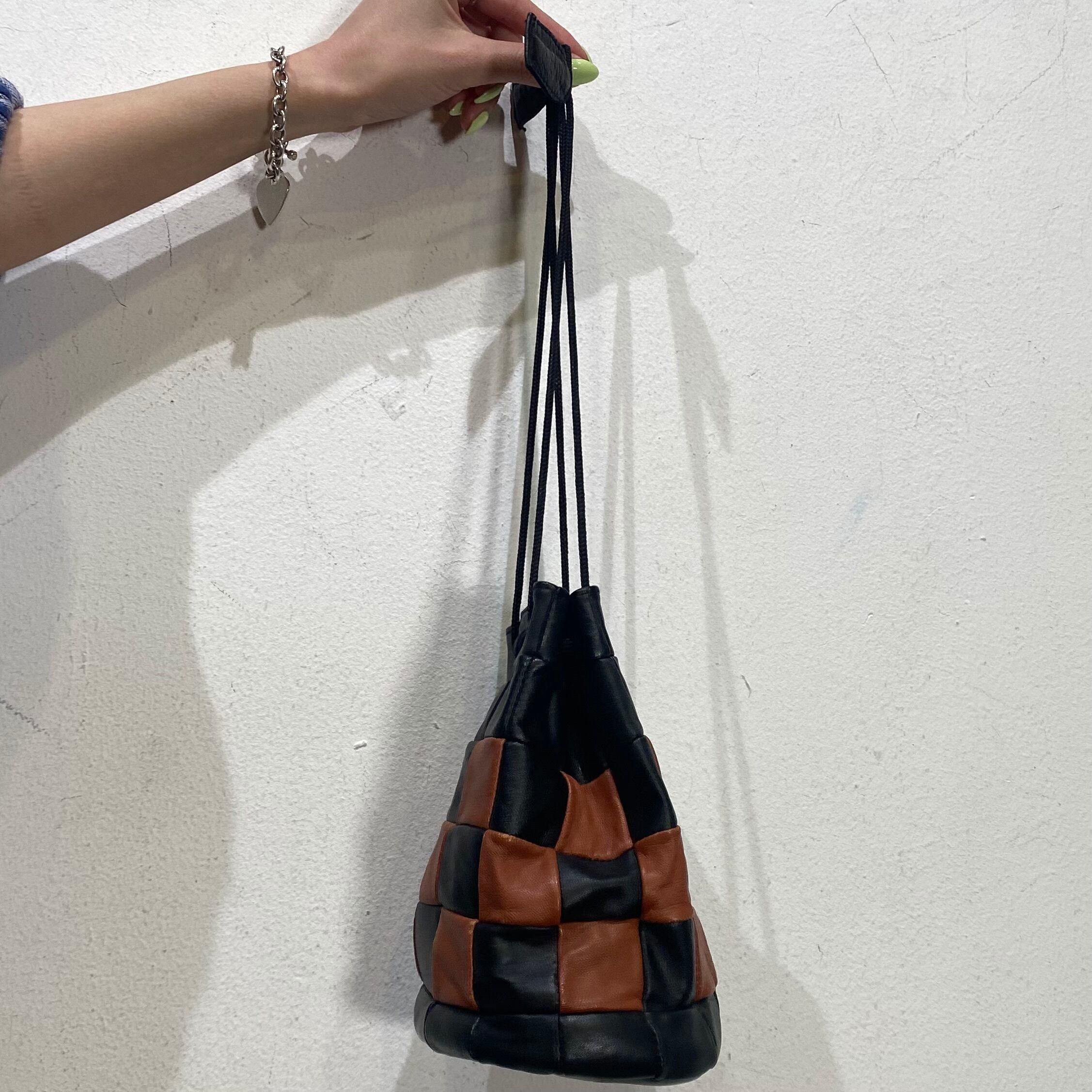 ブラック×ブラウンの色合わせと小さめのサイズ感が可愛い、70年代の巾着バッグです。