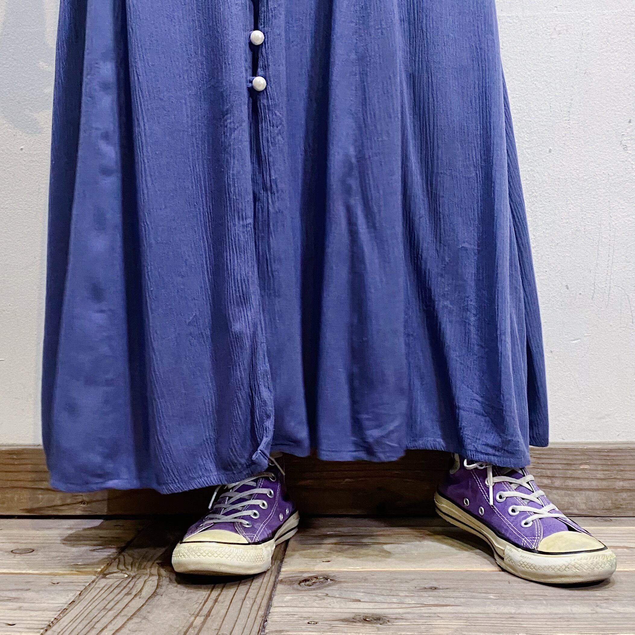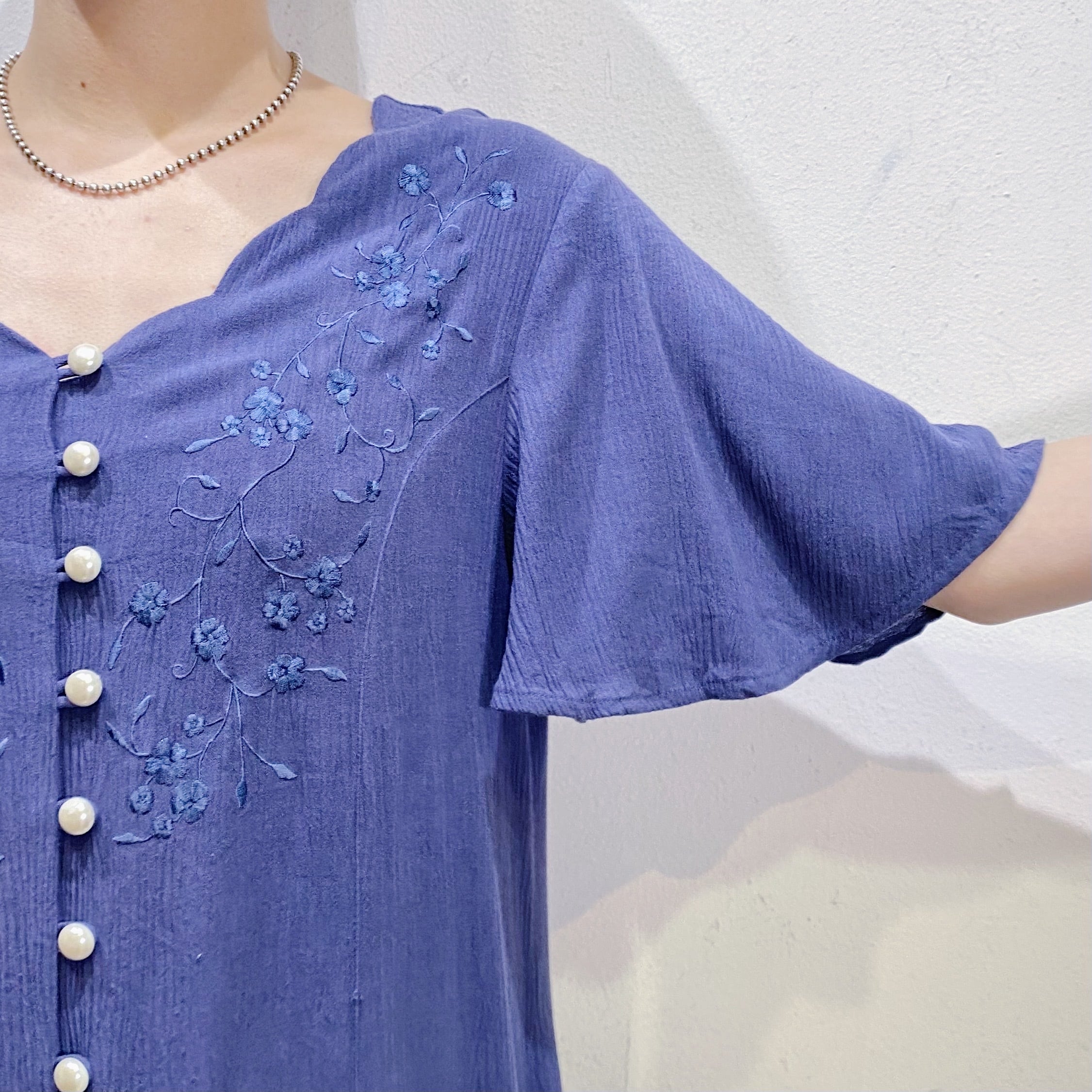 90s navy flower embroidery rayon dress【539】