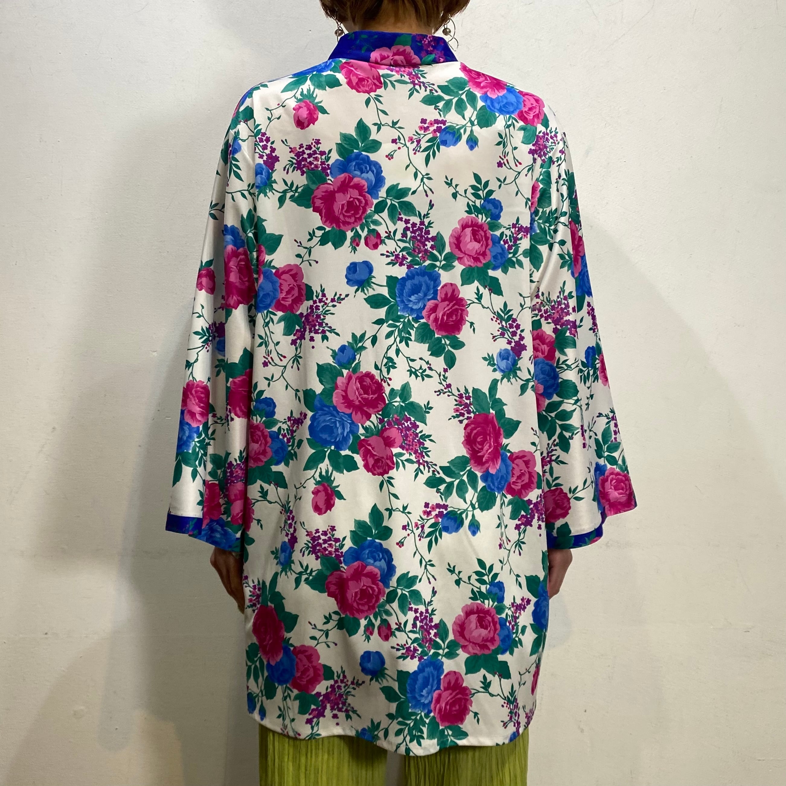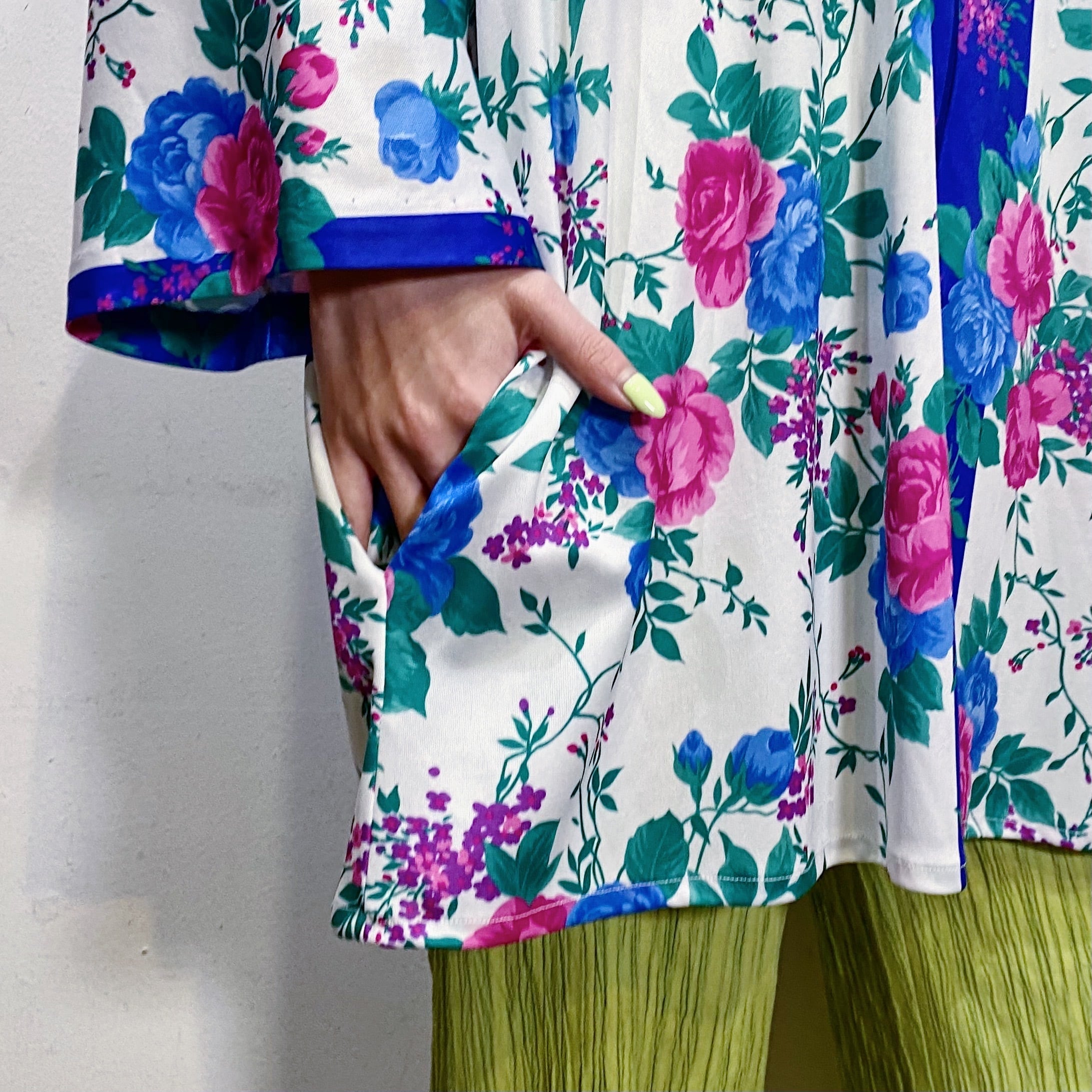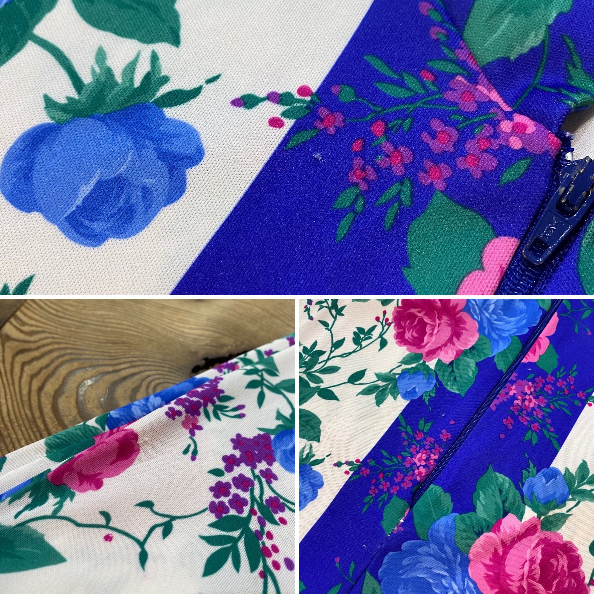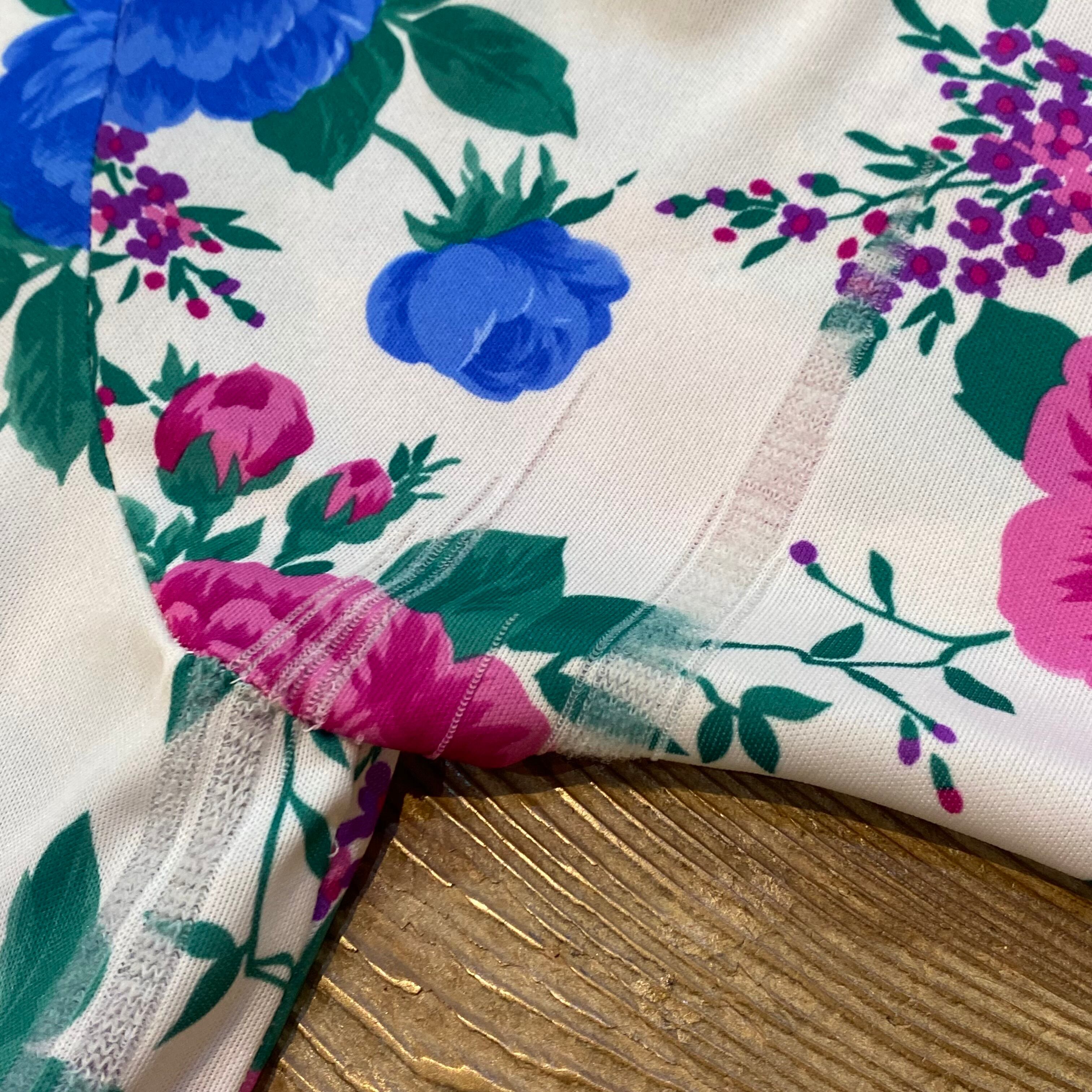 鮮やかなブルーとピンクの花柄が可愛い、70年代のミニワンピースです。