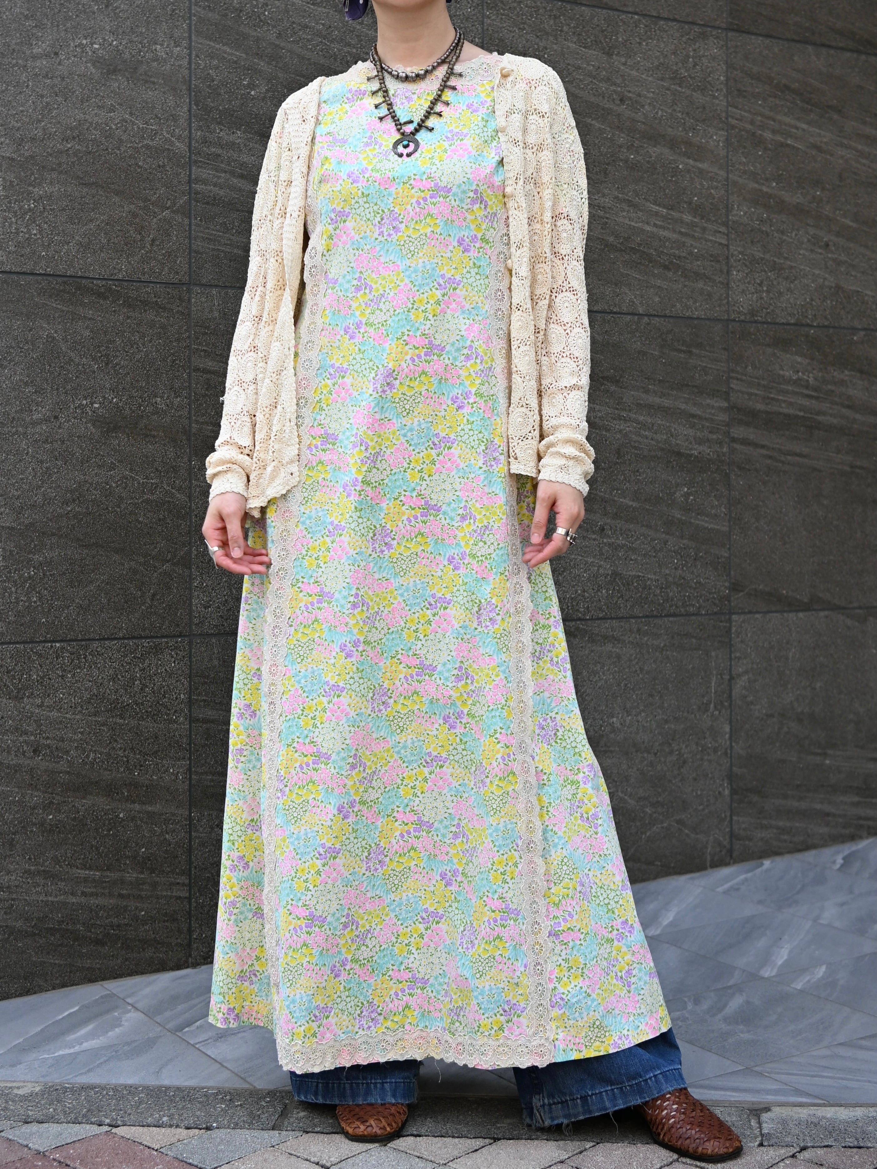 パステルカラーの小花柄にレースのデザインが可愛い60~70年代のコットンワンピースです。