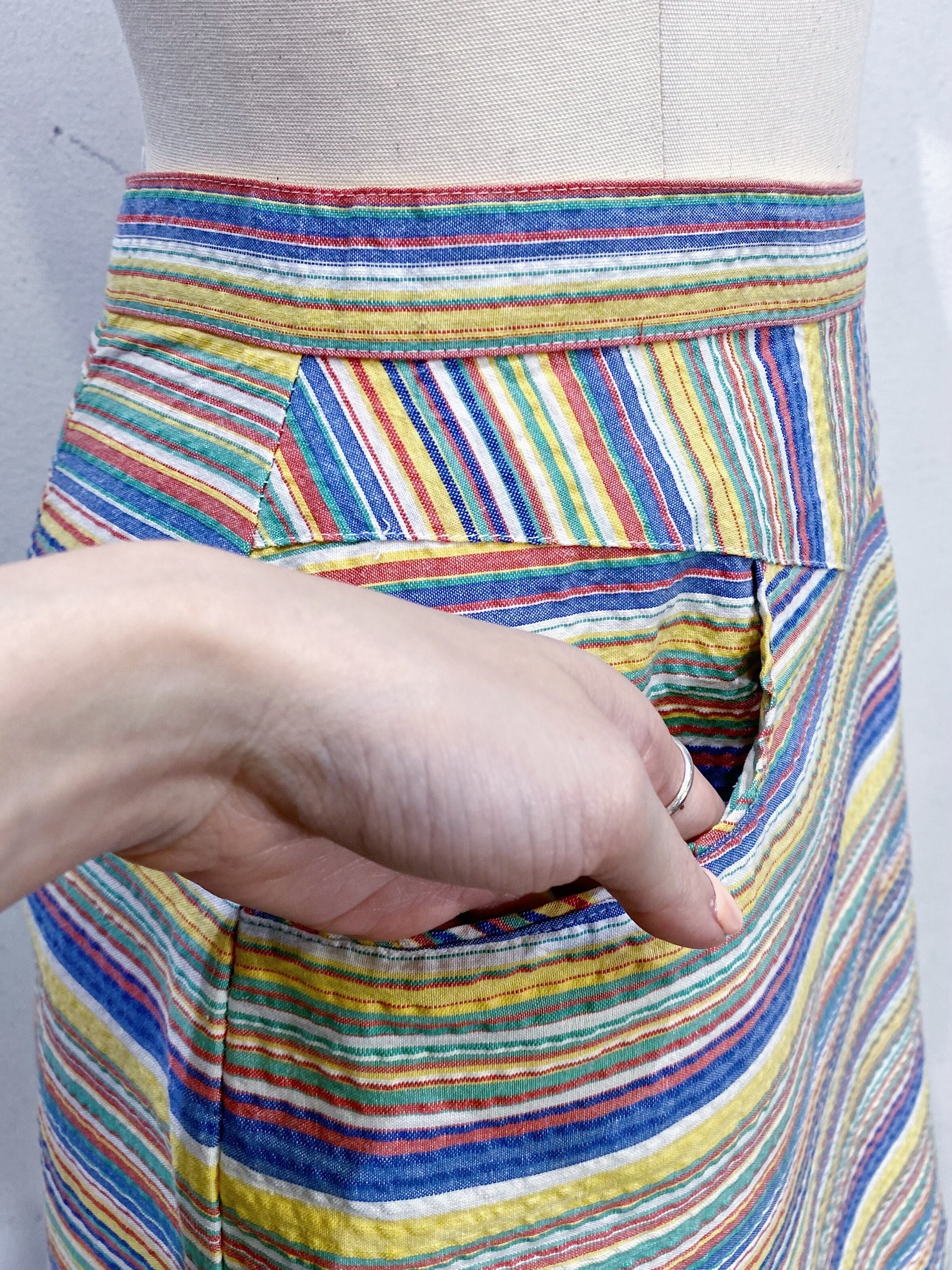 イエローやブルーなどのカラフルなストライプが可愛い、80年代のミニスカートです。