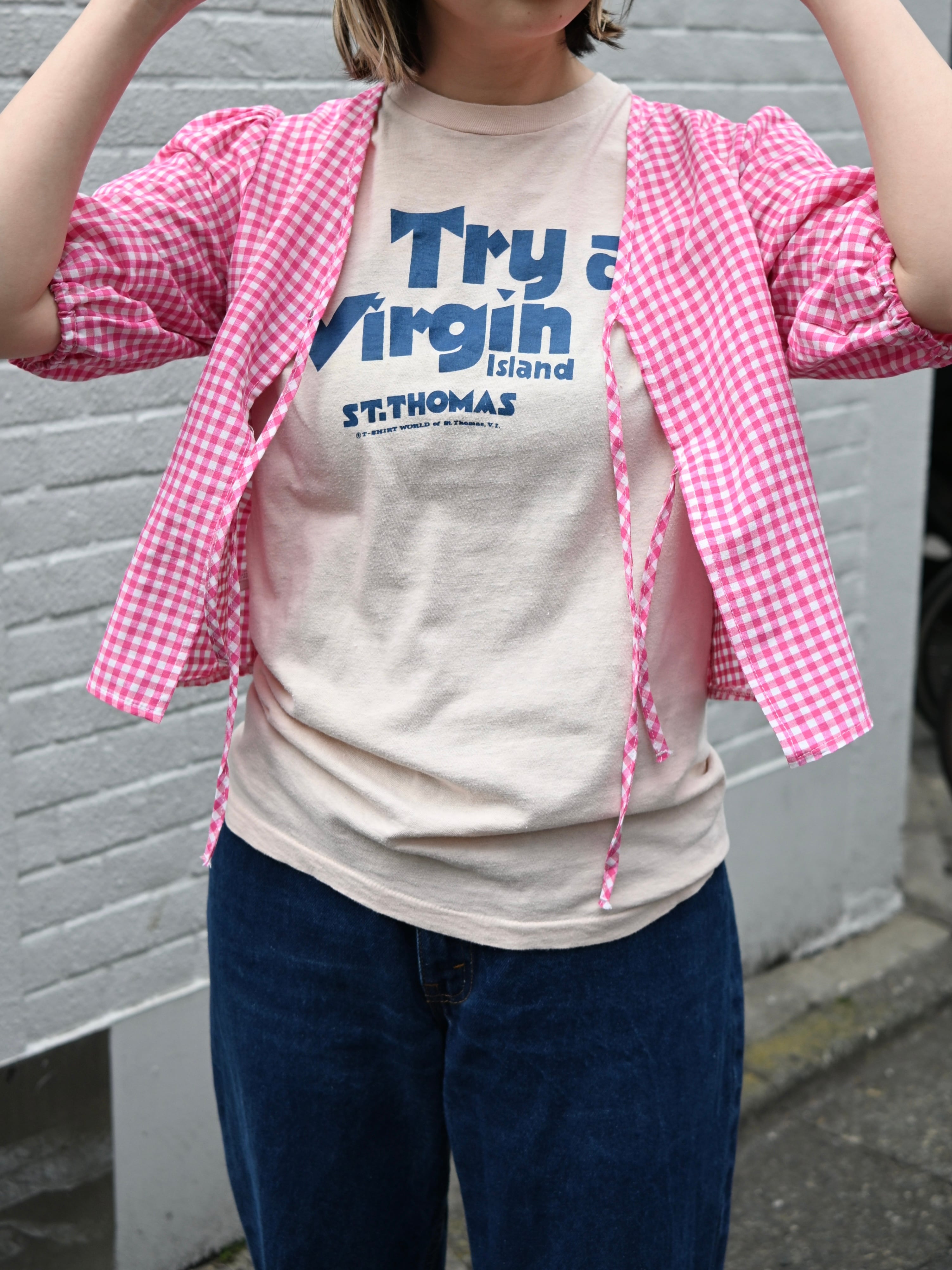 着用写真のようにTシャツと合わせたり、大きな襟の付いたブラウスを重ね襟を出した着こなしもおすすめ。