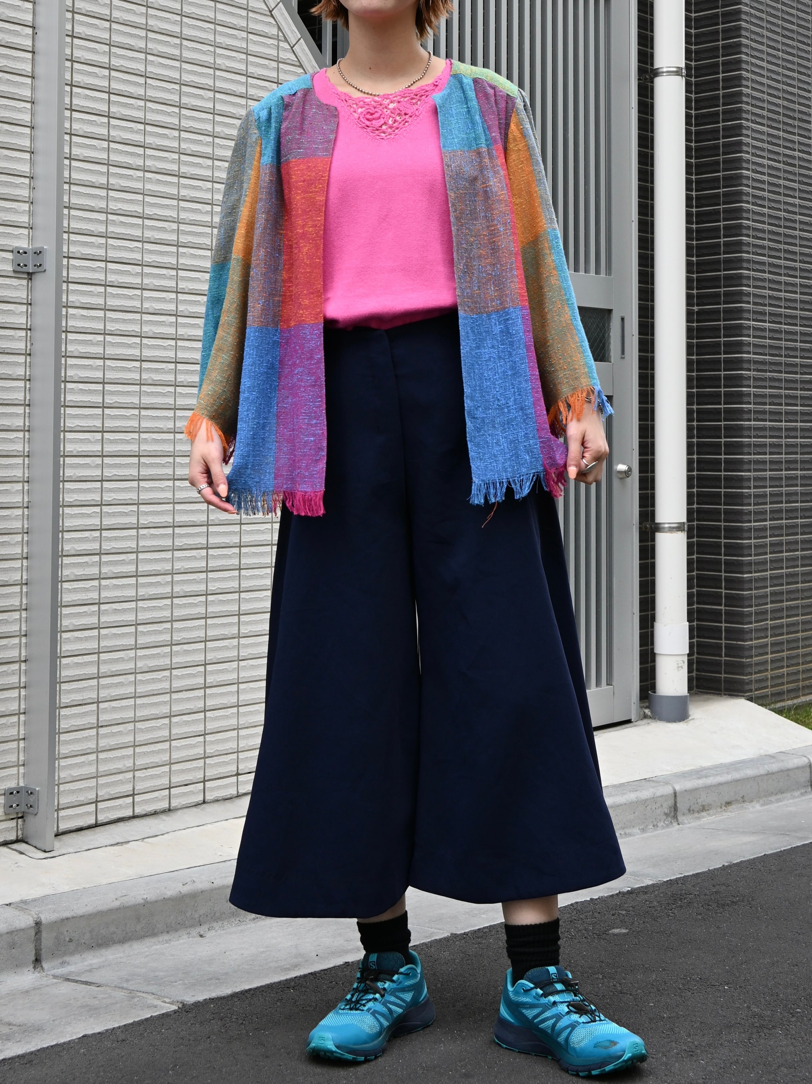 着用写真のようなスカートスタイルやパンツスタイルにはもちろん、ワンピースなどの上からサッと羽織っても。