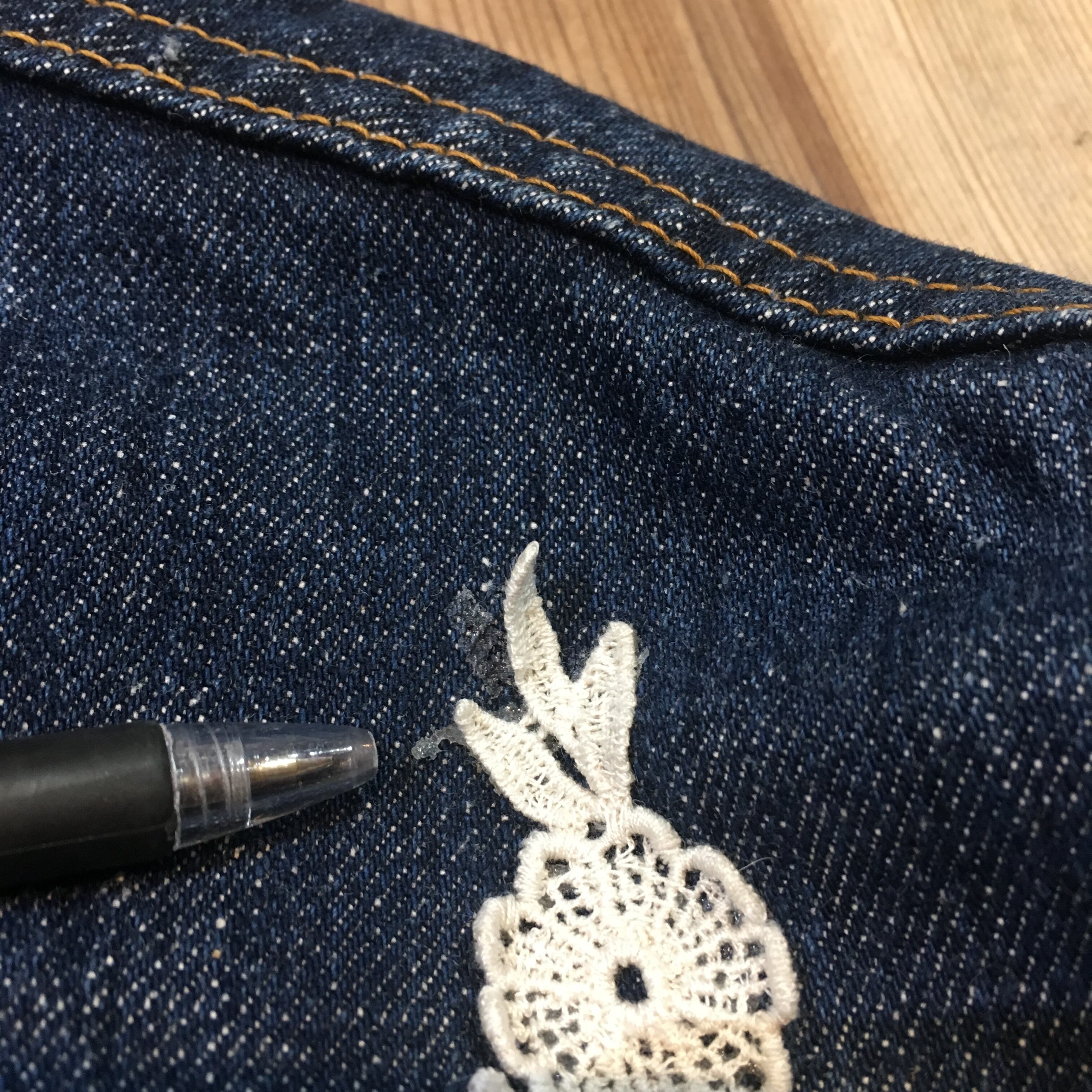 背中には花柄の布が張られていますが、全体的にデニム地がメインなのでどんな柄のお洋服にも合わせやすいかと思います。