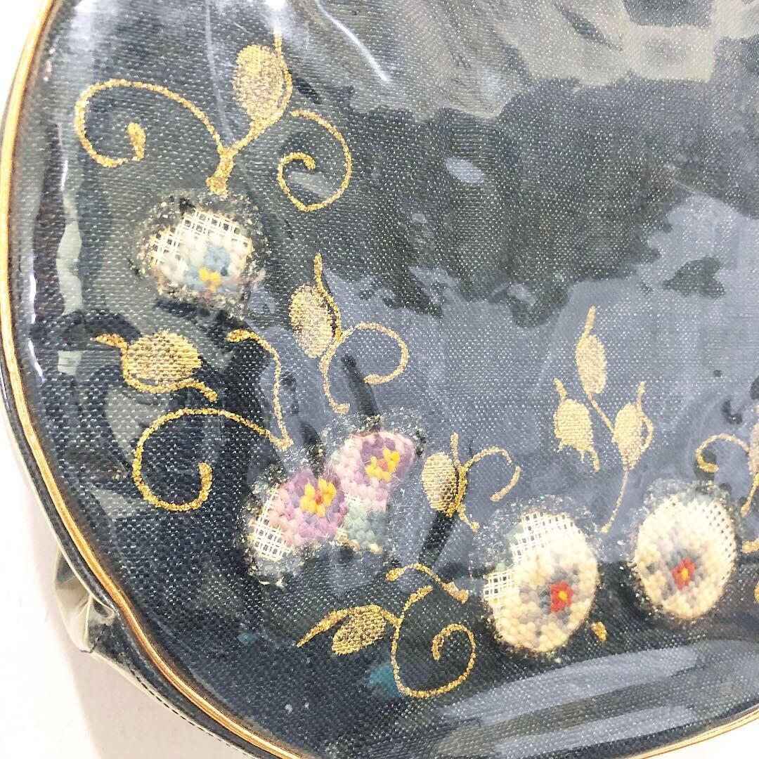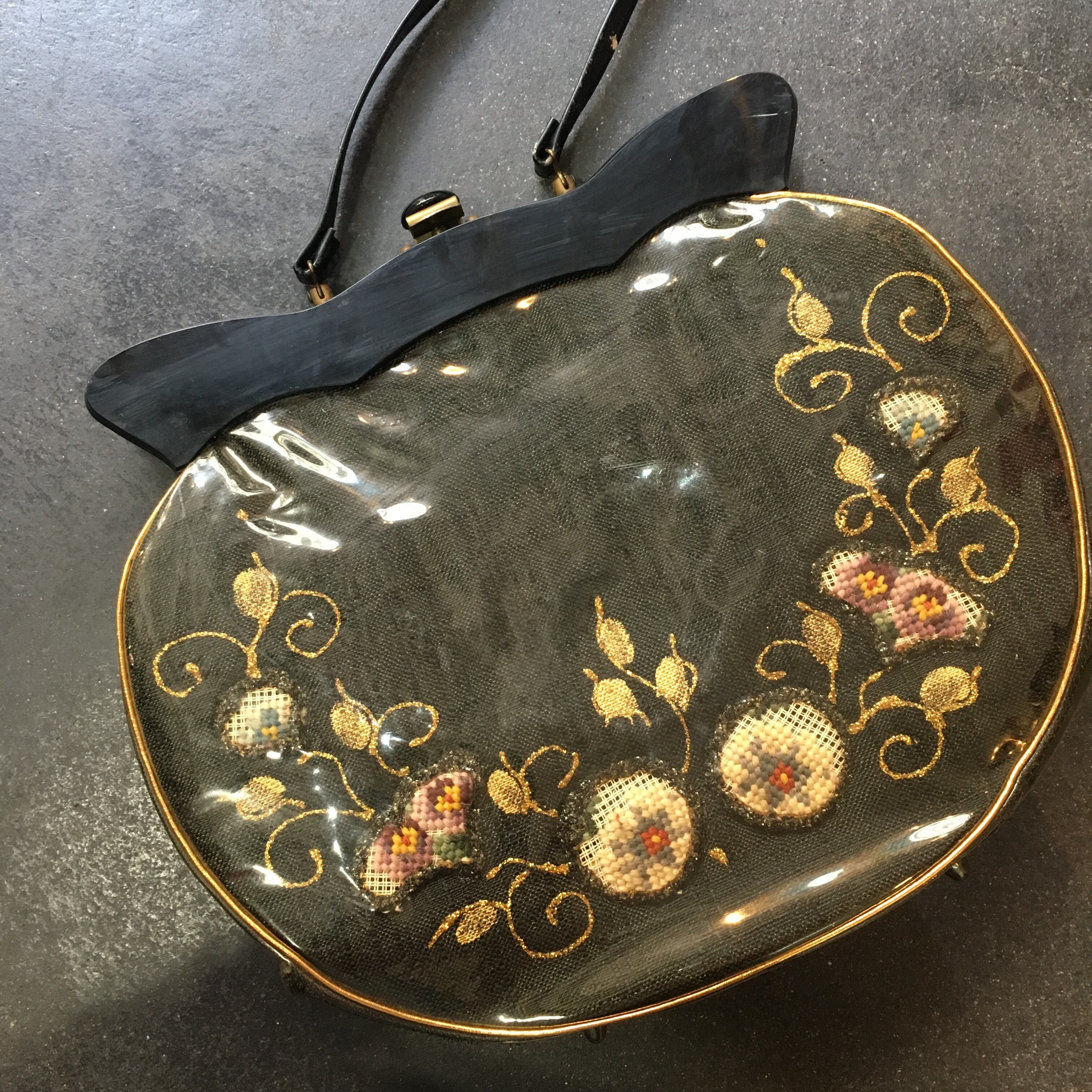 ビニールの中にハンドワークでお花などおモチーフがあしたわれた50年代のハンドバッグです。