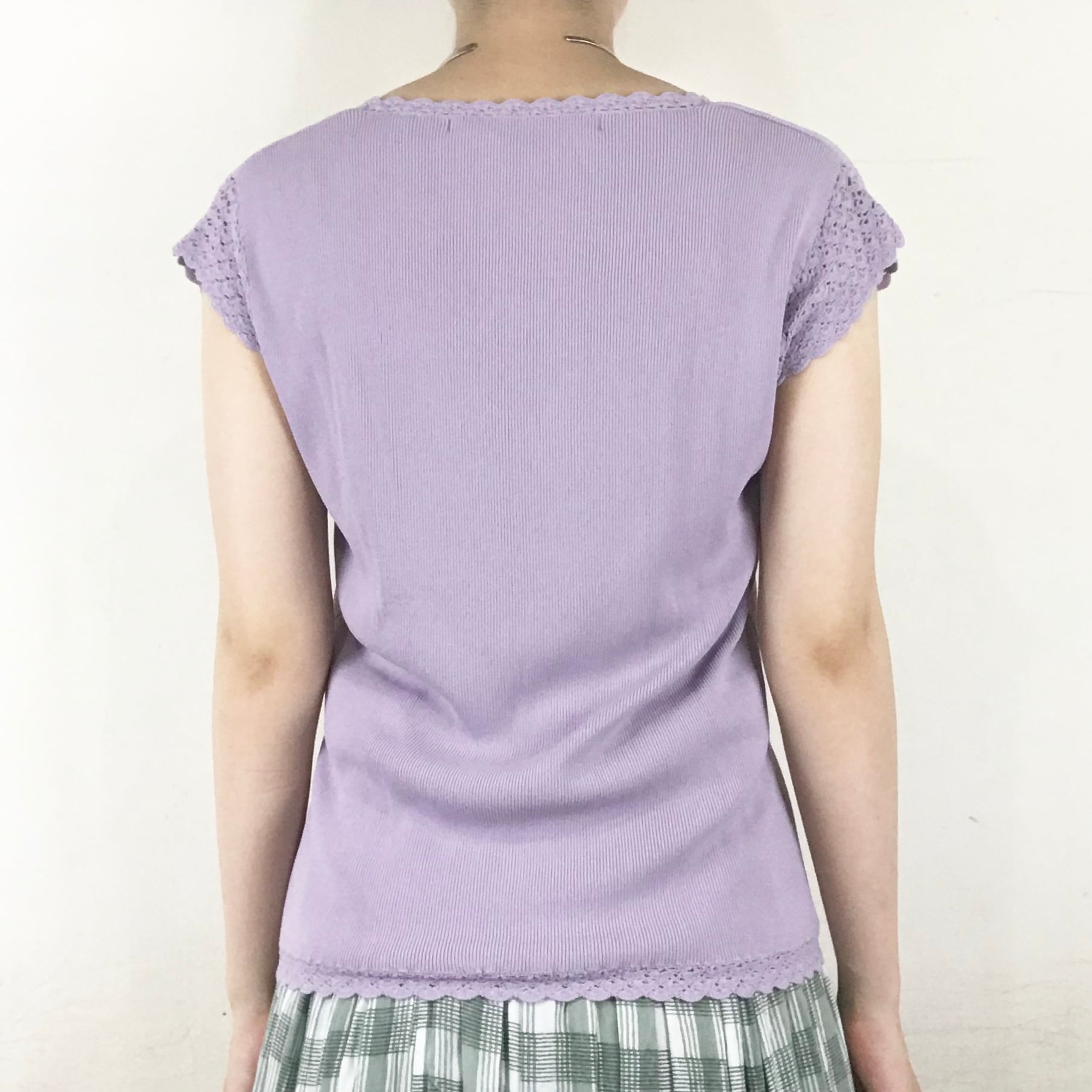 優しい色合い、そして端のレースが可愛いラベンダーカラーのトップスです。