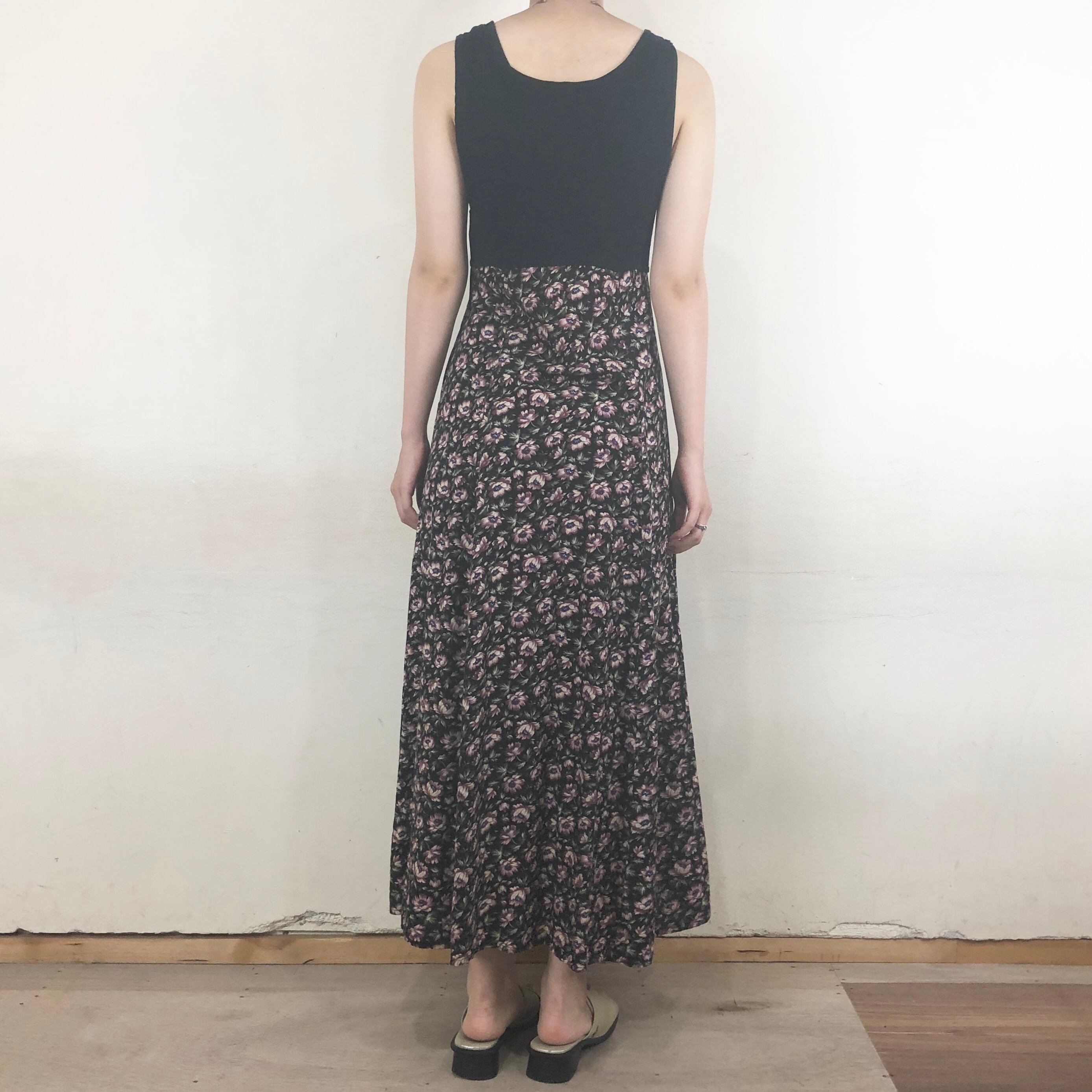ウエストがリブになっており、胸下からカットソー素材に切り替えられているノースリーブワンピース。