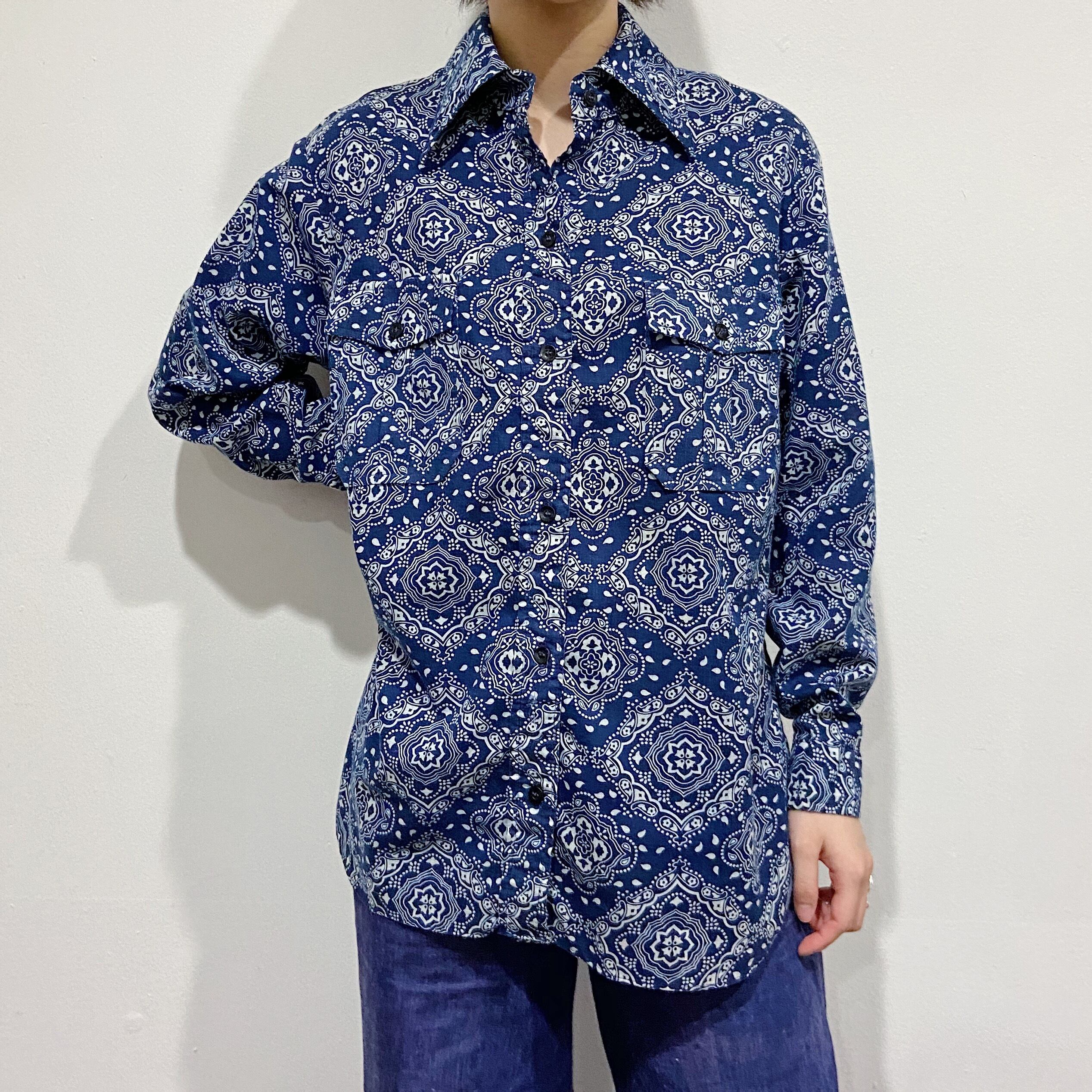 エディーバウアーのネイビーカラーが使いやすそうなバンダナプリントシャツ。
