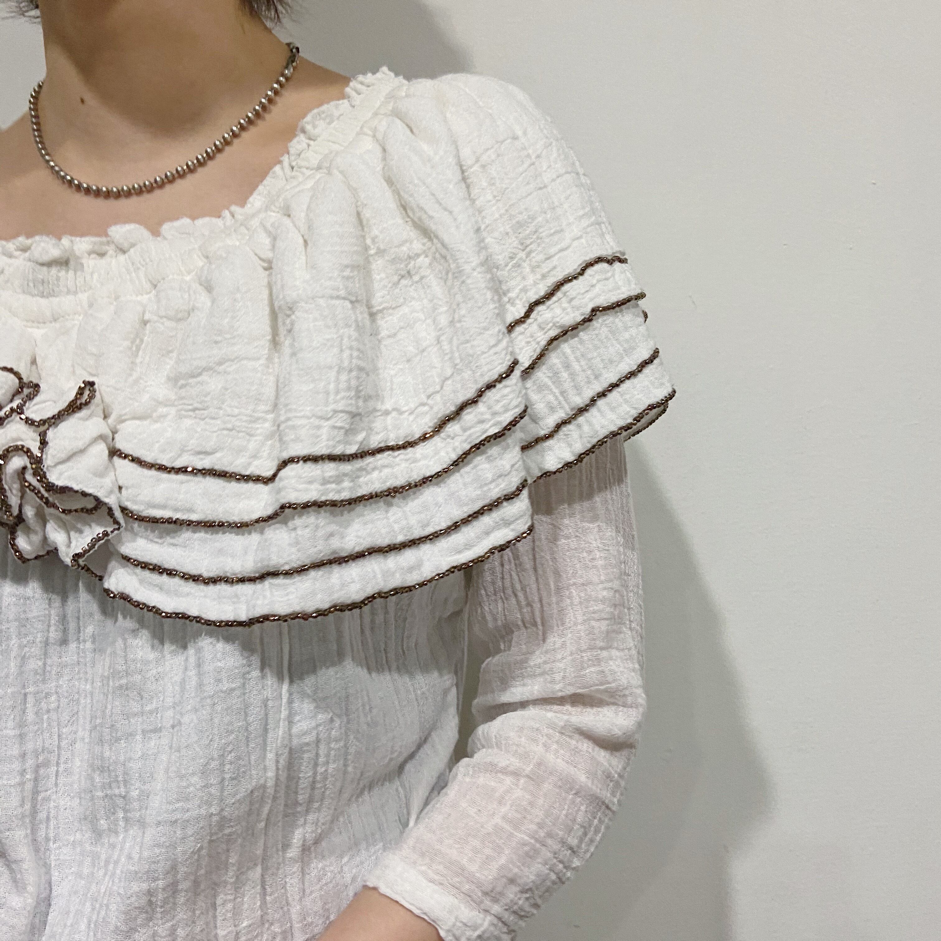 肩にはゴムが入っているので、おろしてオフショルダーのようにも着こませます。