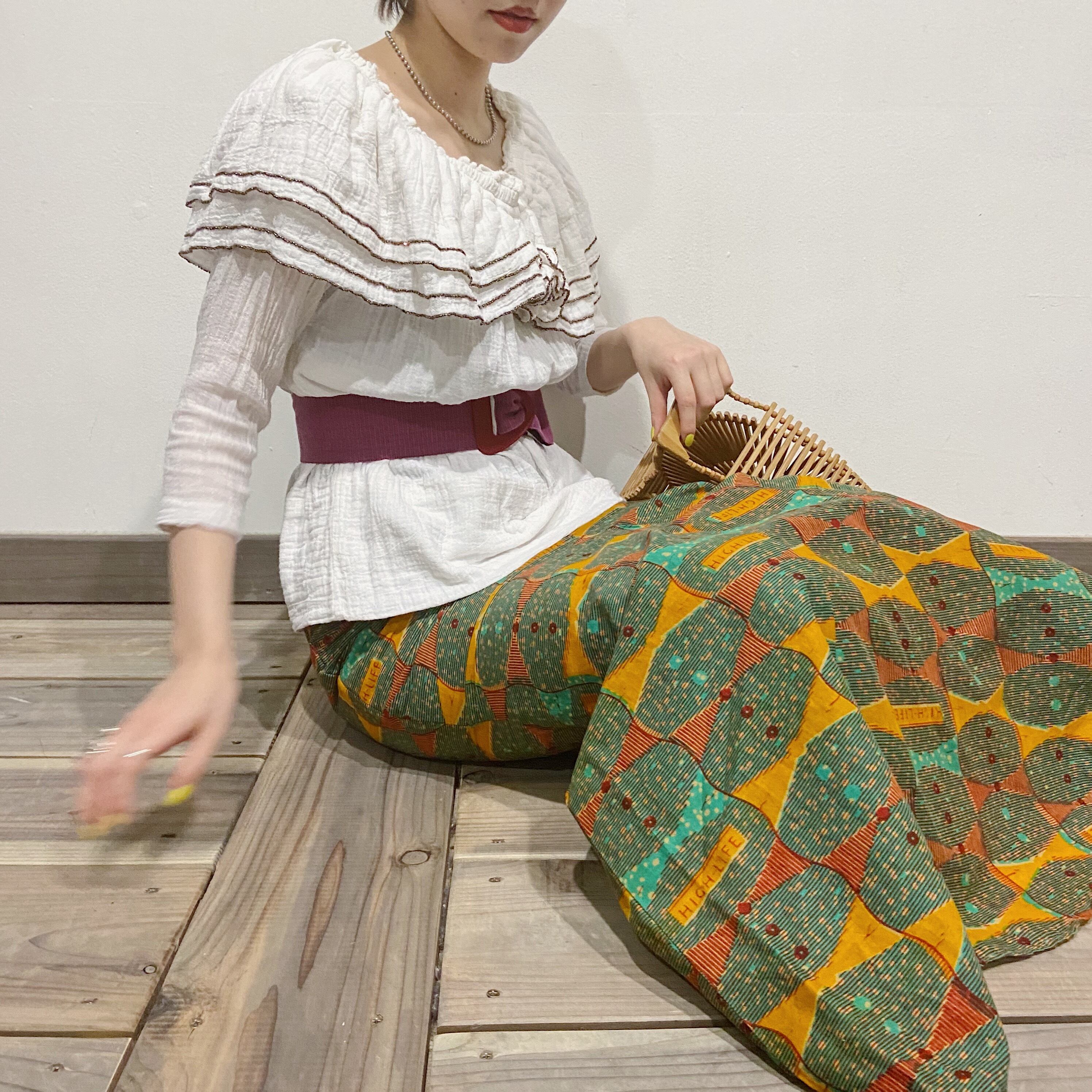 裾をボトムアウトしても、インしても可愛く着れる一枚ですが、トップスの上から写真のようにベルトで絞っても素敵。
