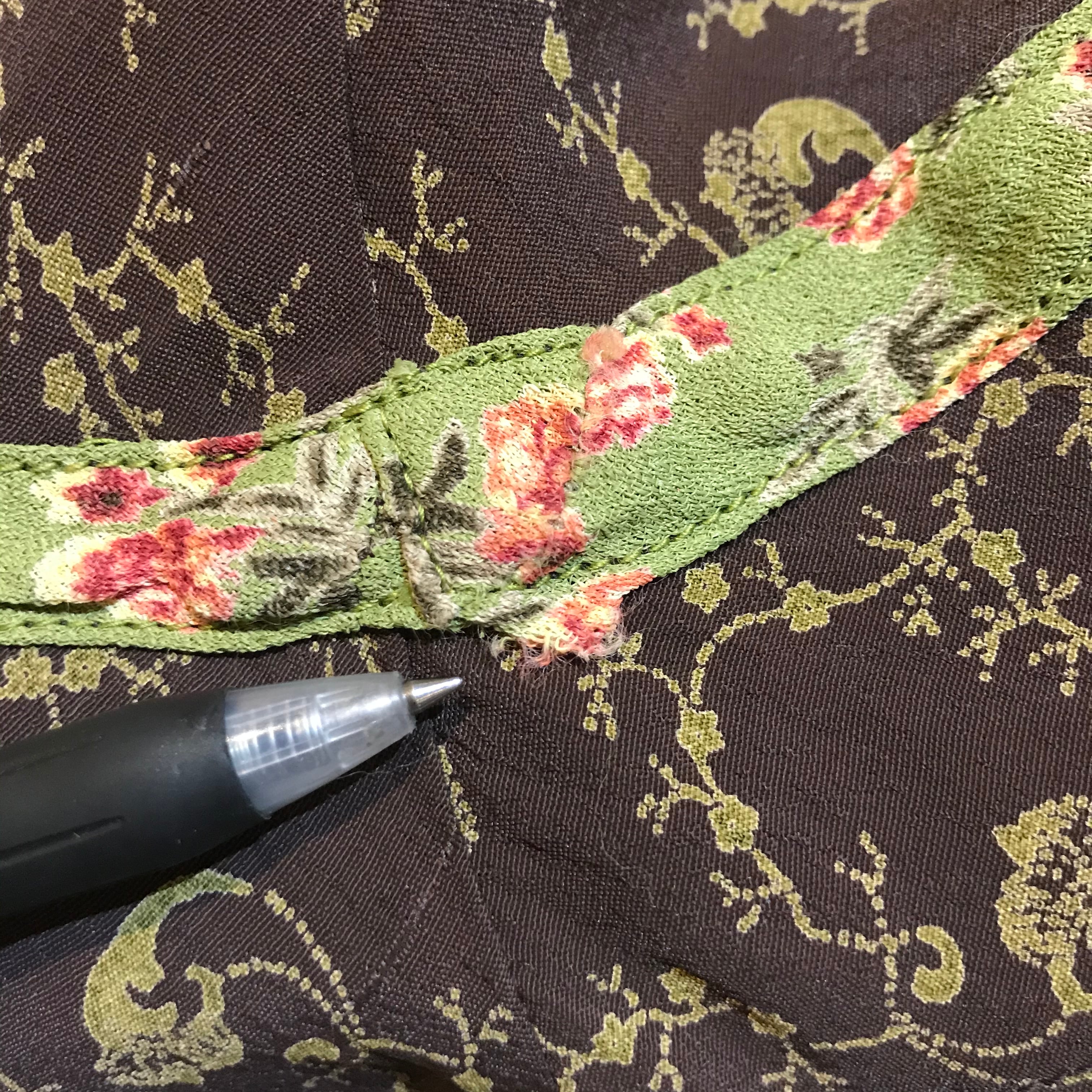 ブラウンの面は蔦のような柄で裾にパイピング、グリーンの面は小花柄が素敵なリバーシブルスカート。