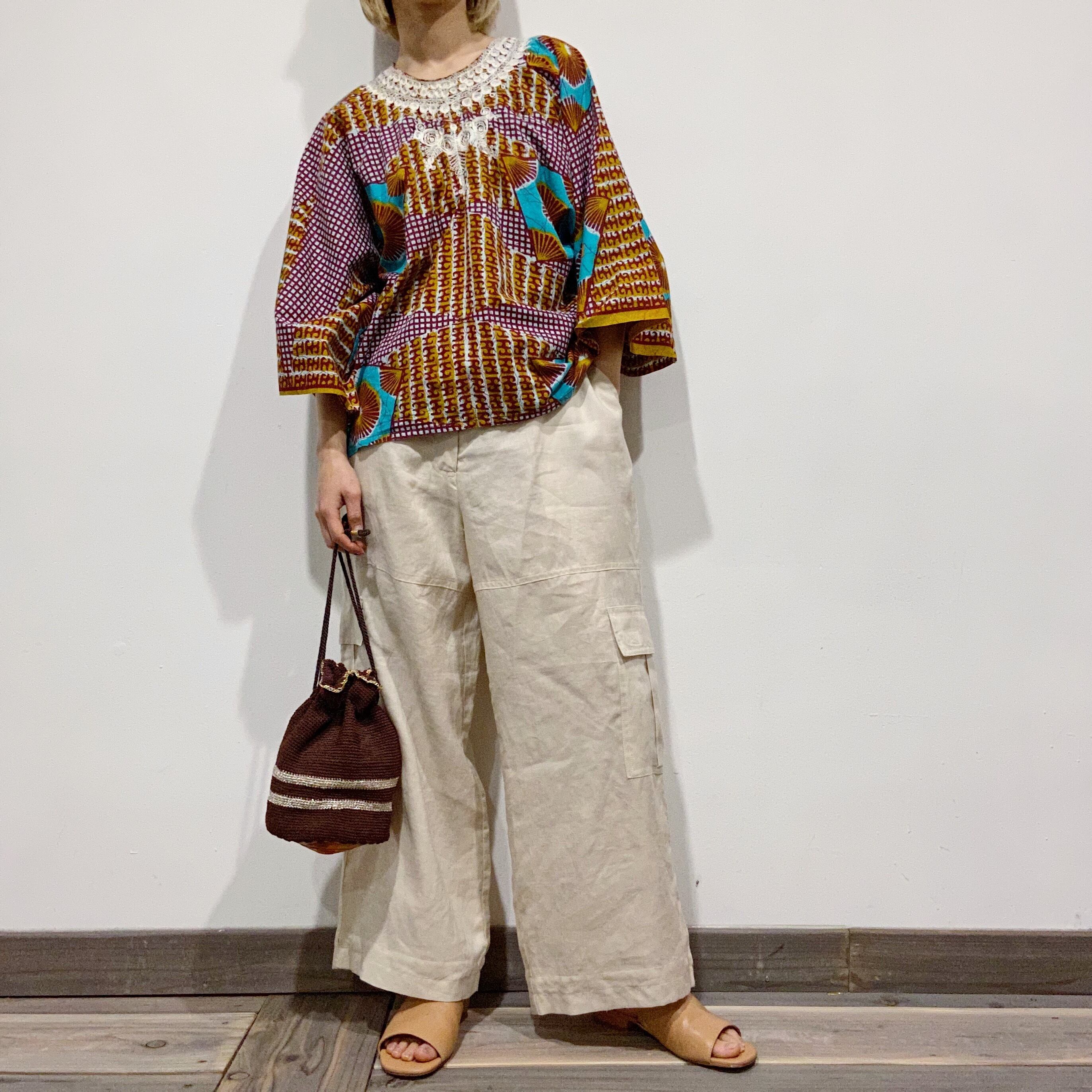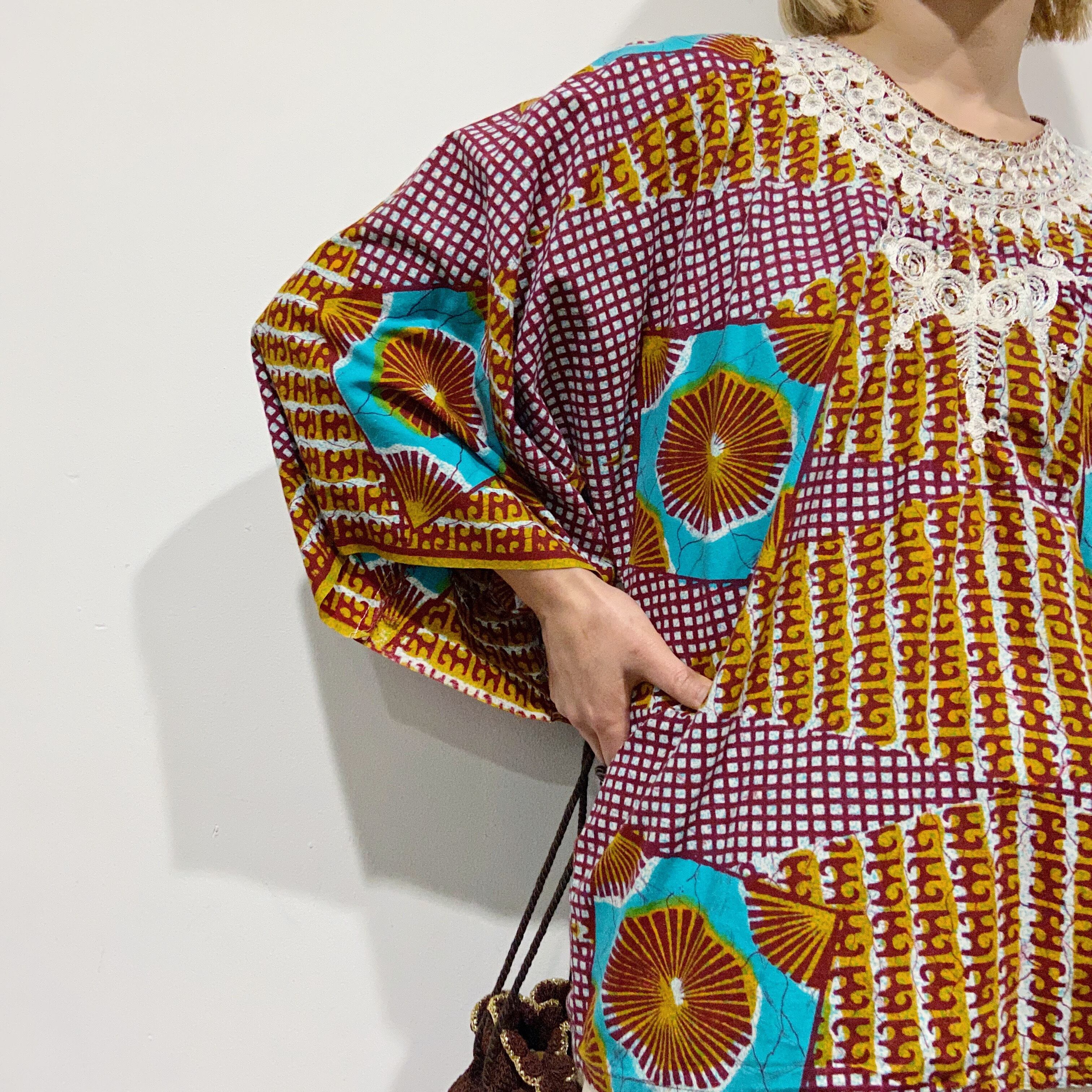 首元の刺繍が不思議な柄が可愛いアフリカンバティックのチュニックトップです。