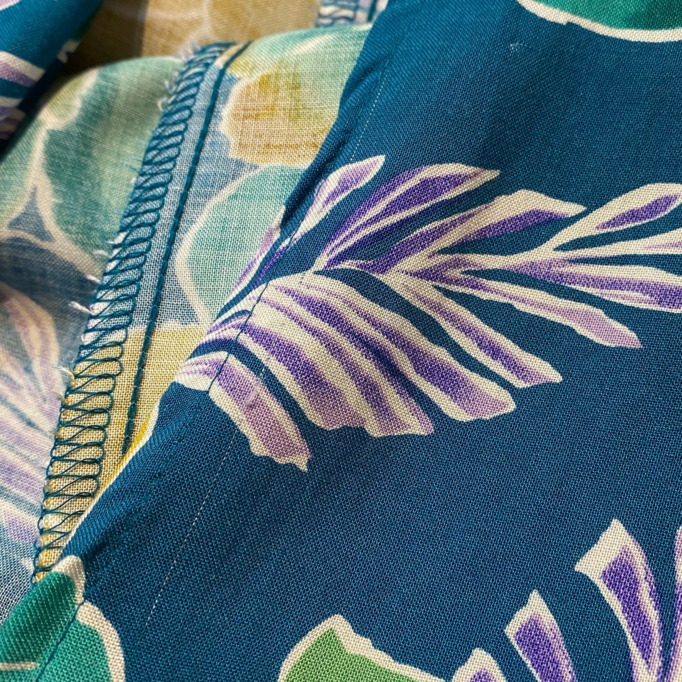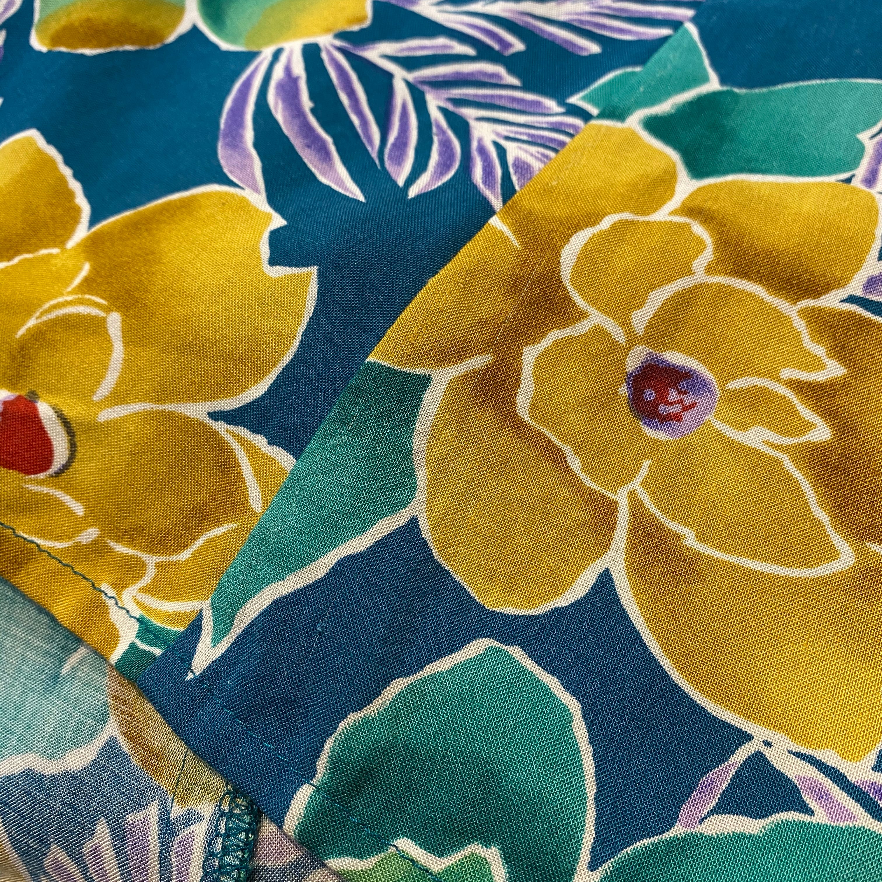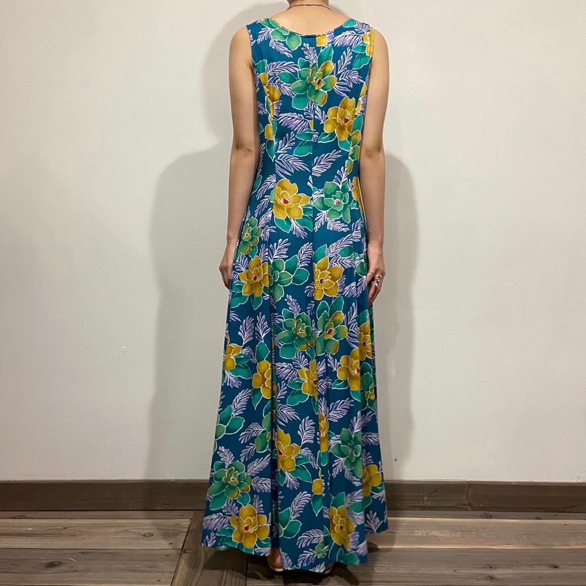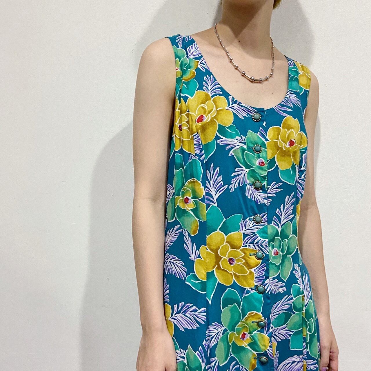 鮮やかなブルーとグリーンのボタニカルな柄が可愛いワンピース。