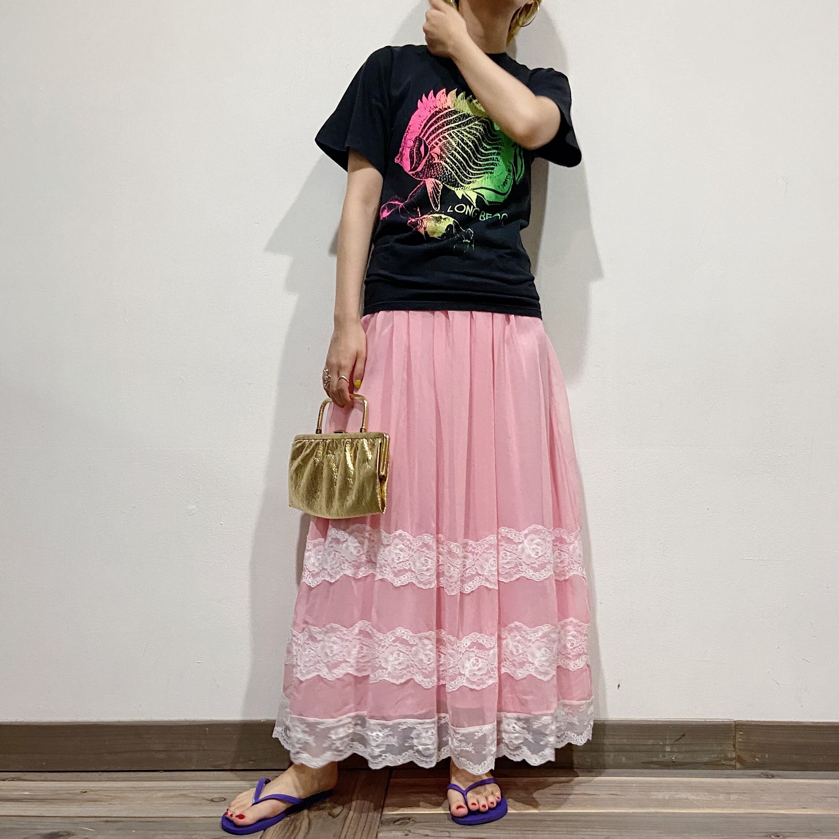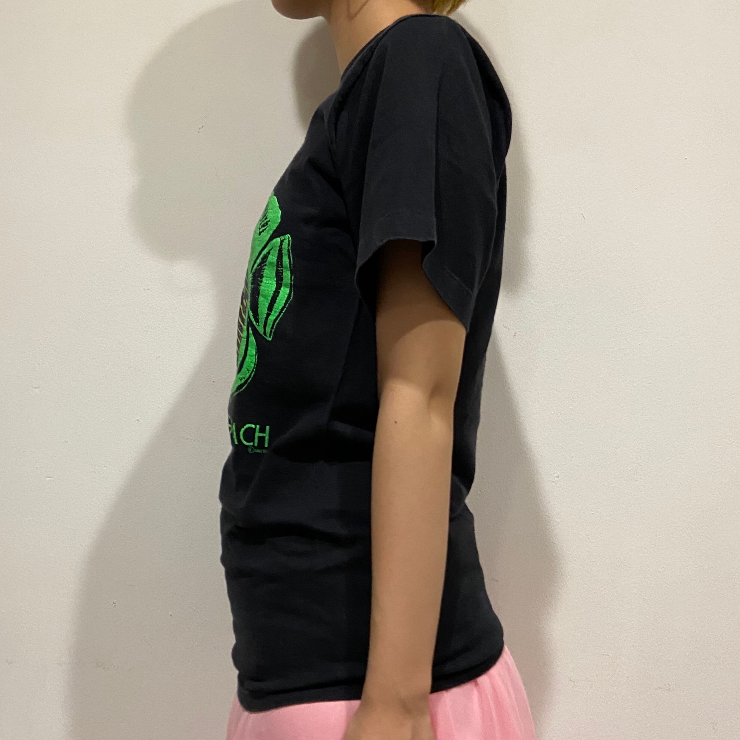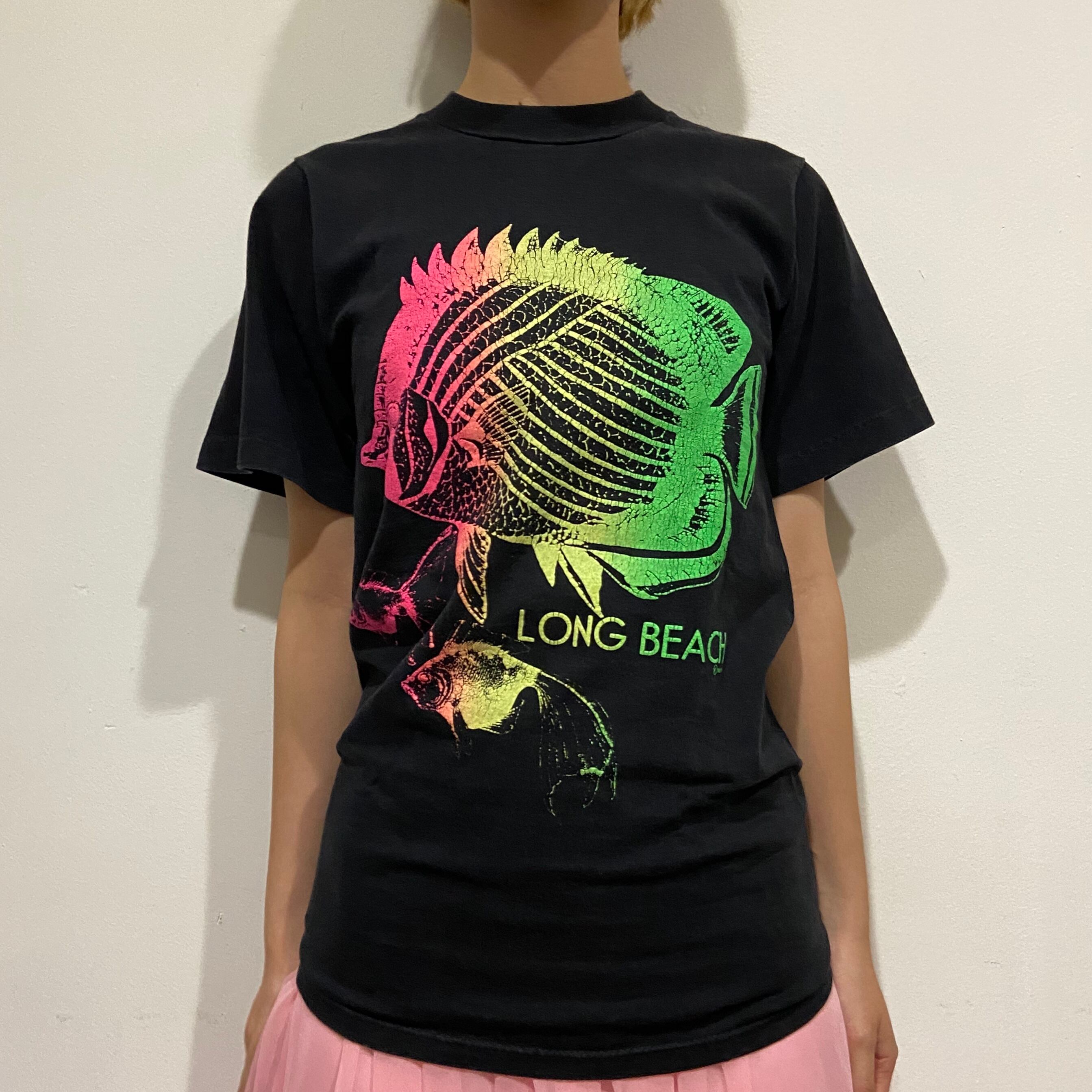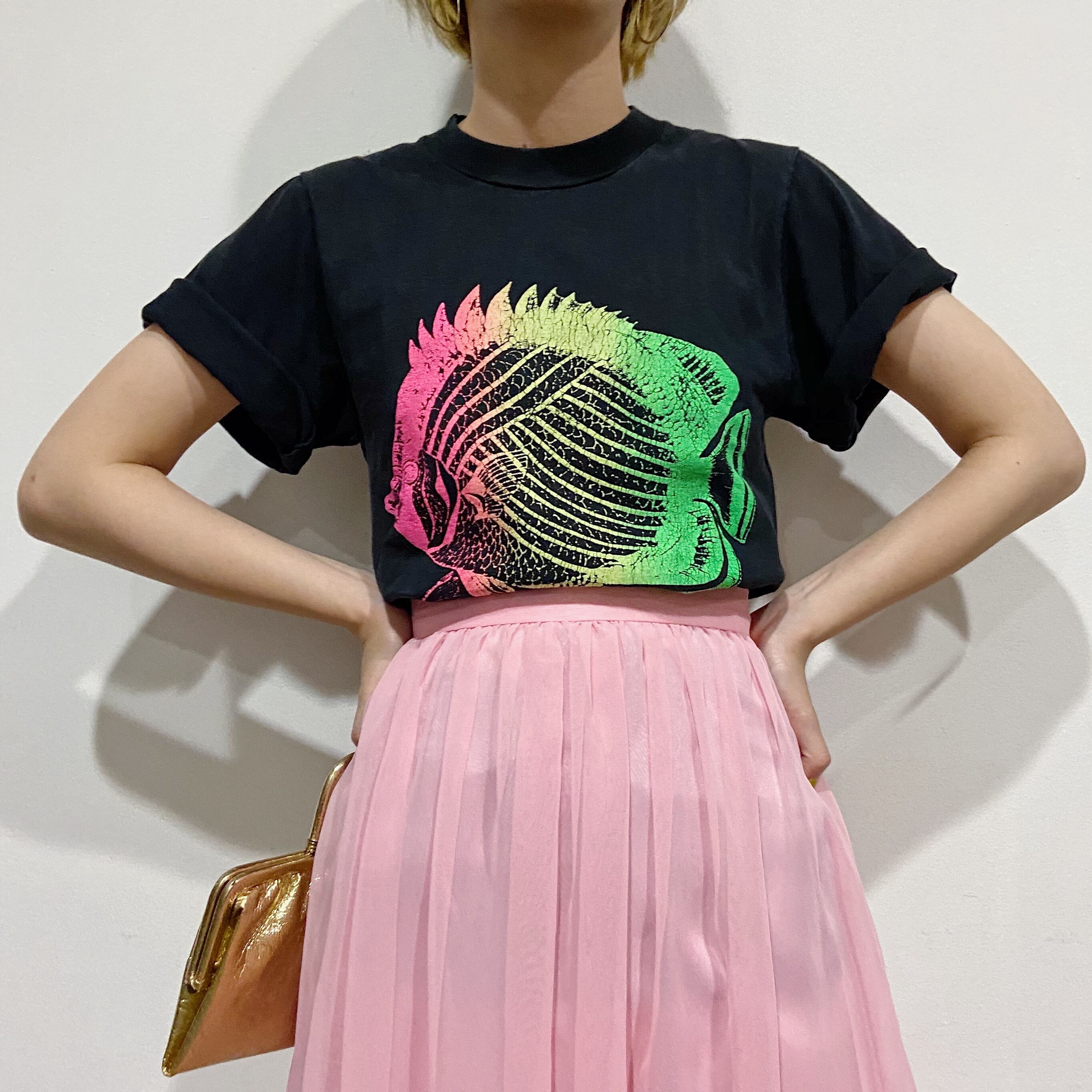 ネオンカラーのお魚プリントがシュールで可愛いTシャツです。