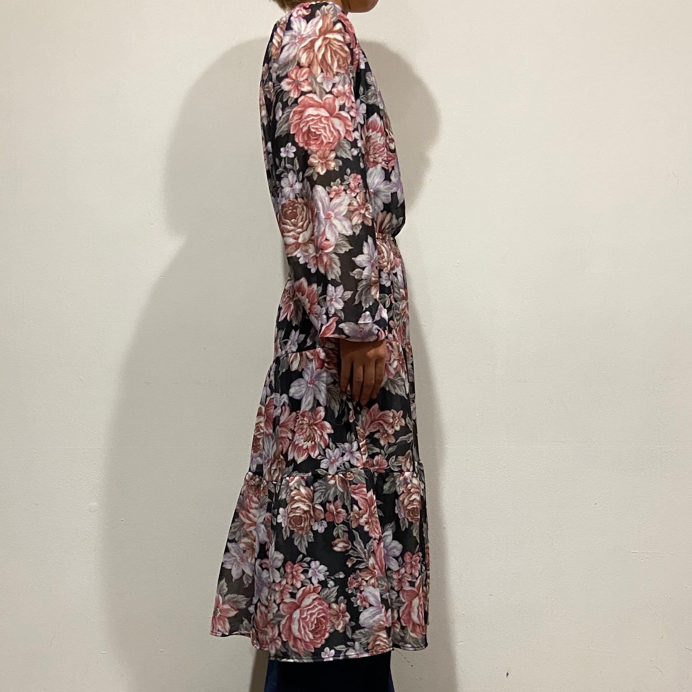 若干シアーになっている素材に大人っぽい花柄がプリントされた70年代のワンピースです。