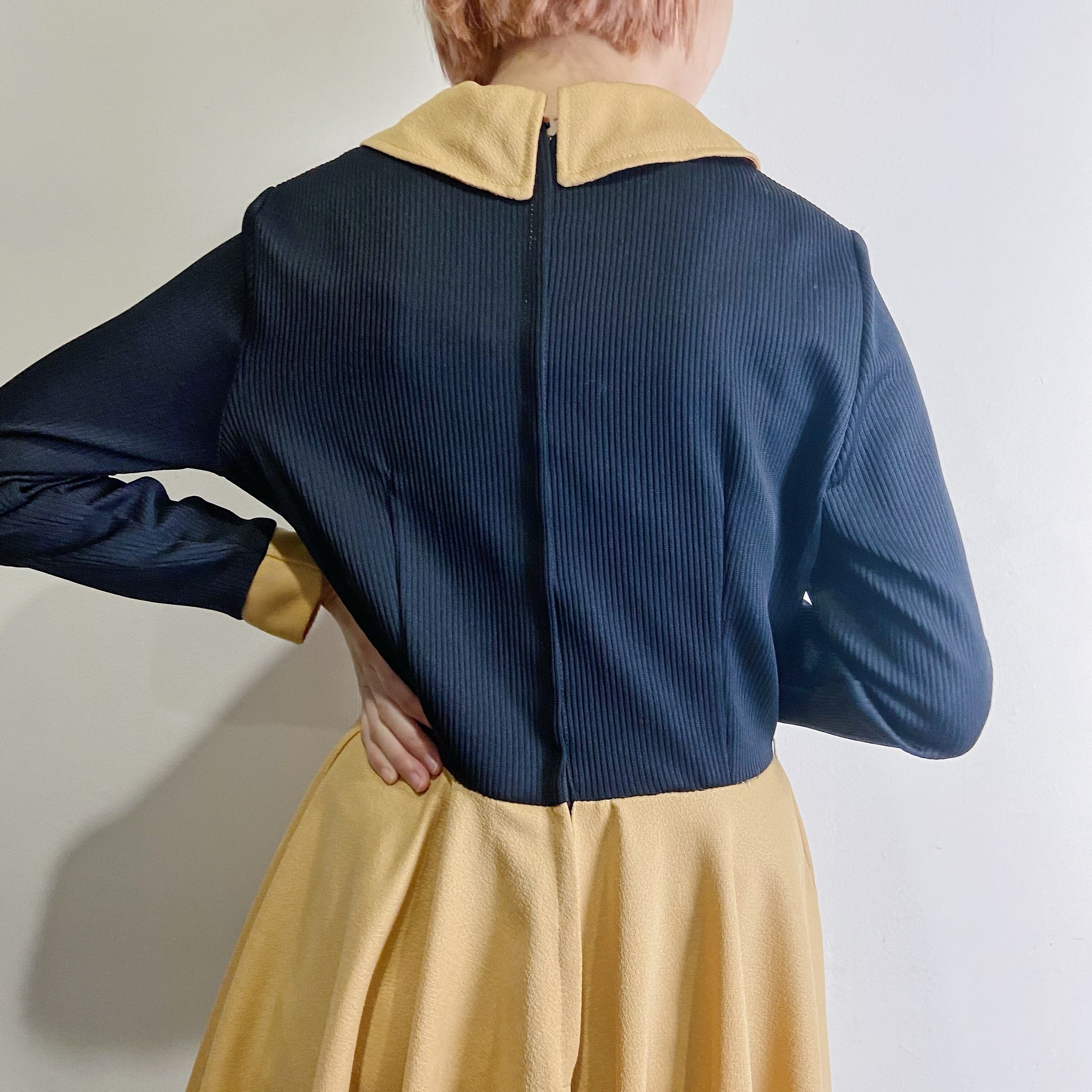 ベージュとブラックのバイカラーが可愛い70年代のみにワンピースです。