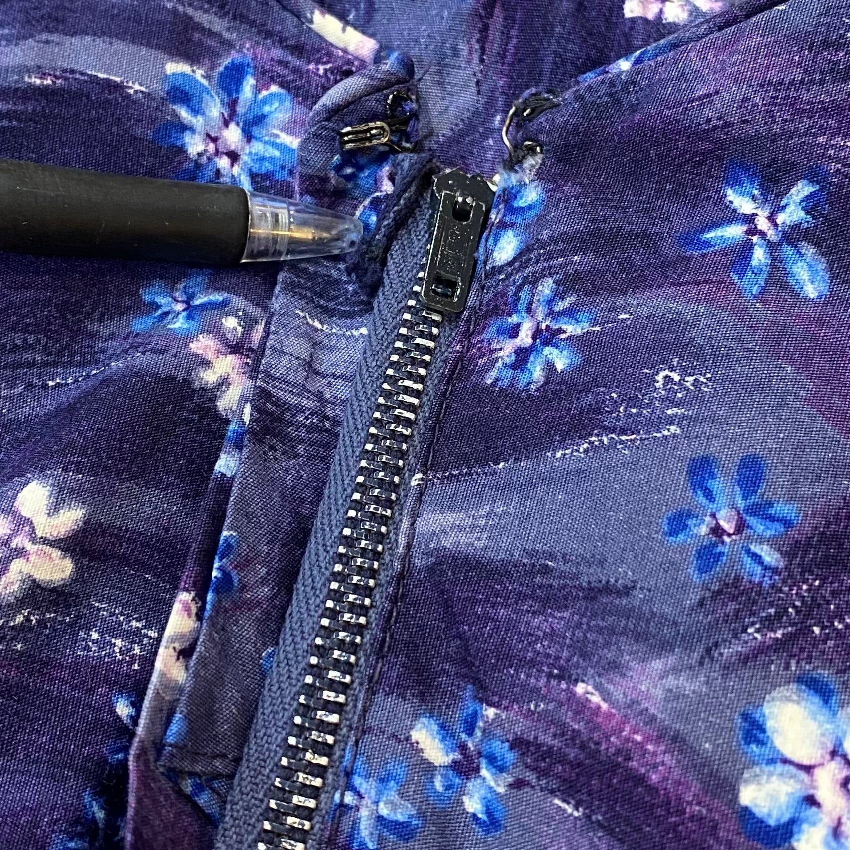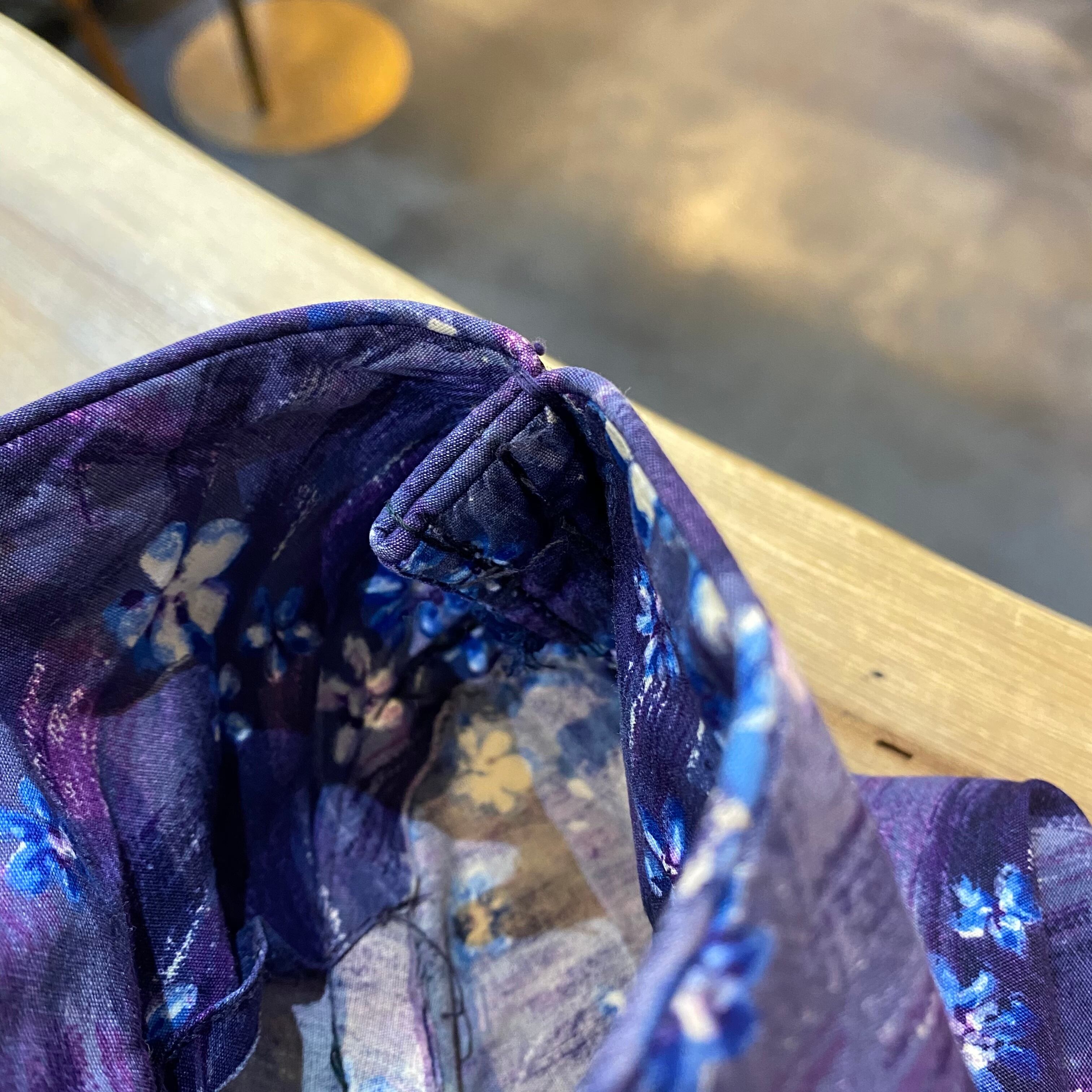 紫とネイビーの色合いが美しく、まるでモネの絵画のようなタッチの花柄が芸術的な一枚です。