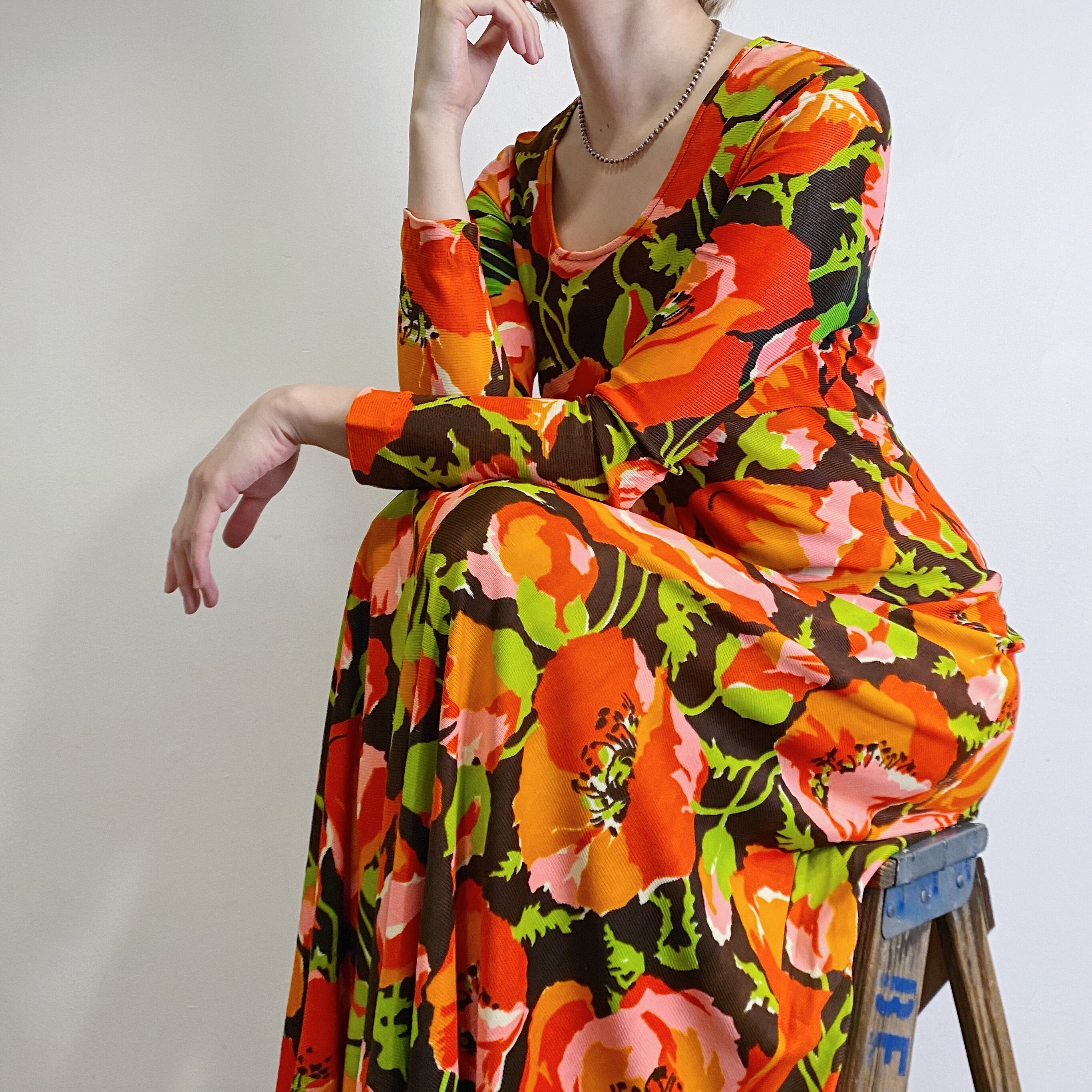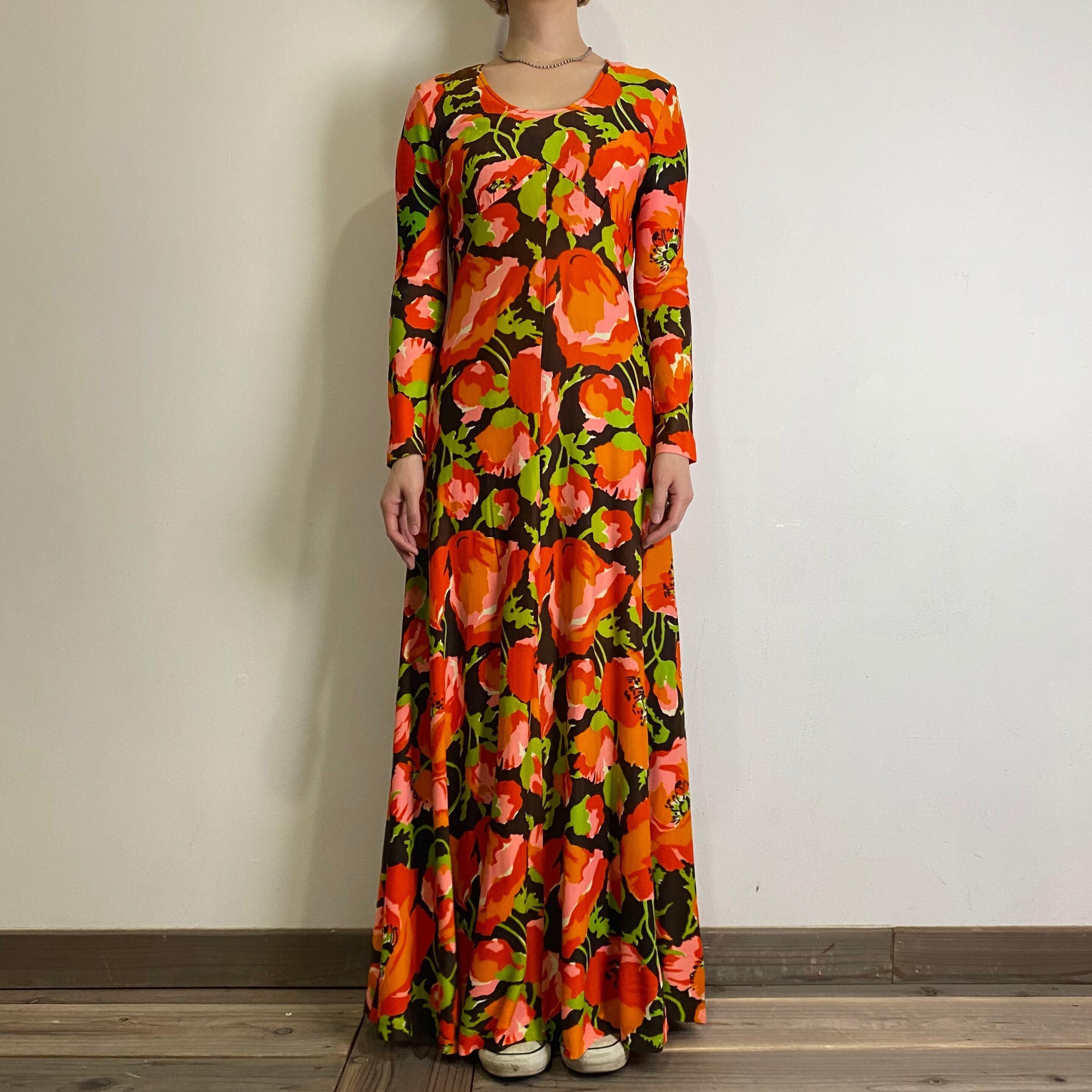 ポピーのようなお花が全体にプリントされた、大人かわいい60~70年代のヒッピーワンピースです。