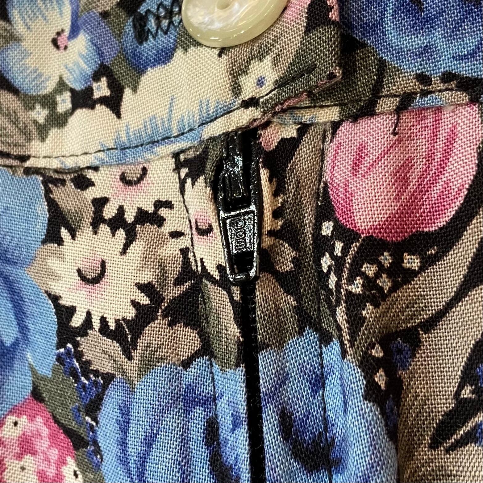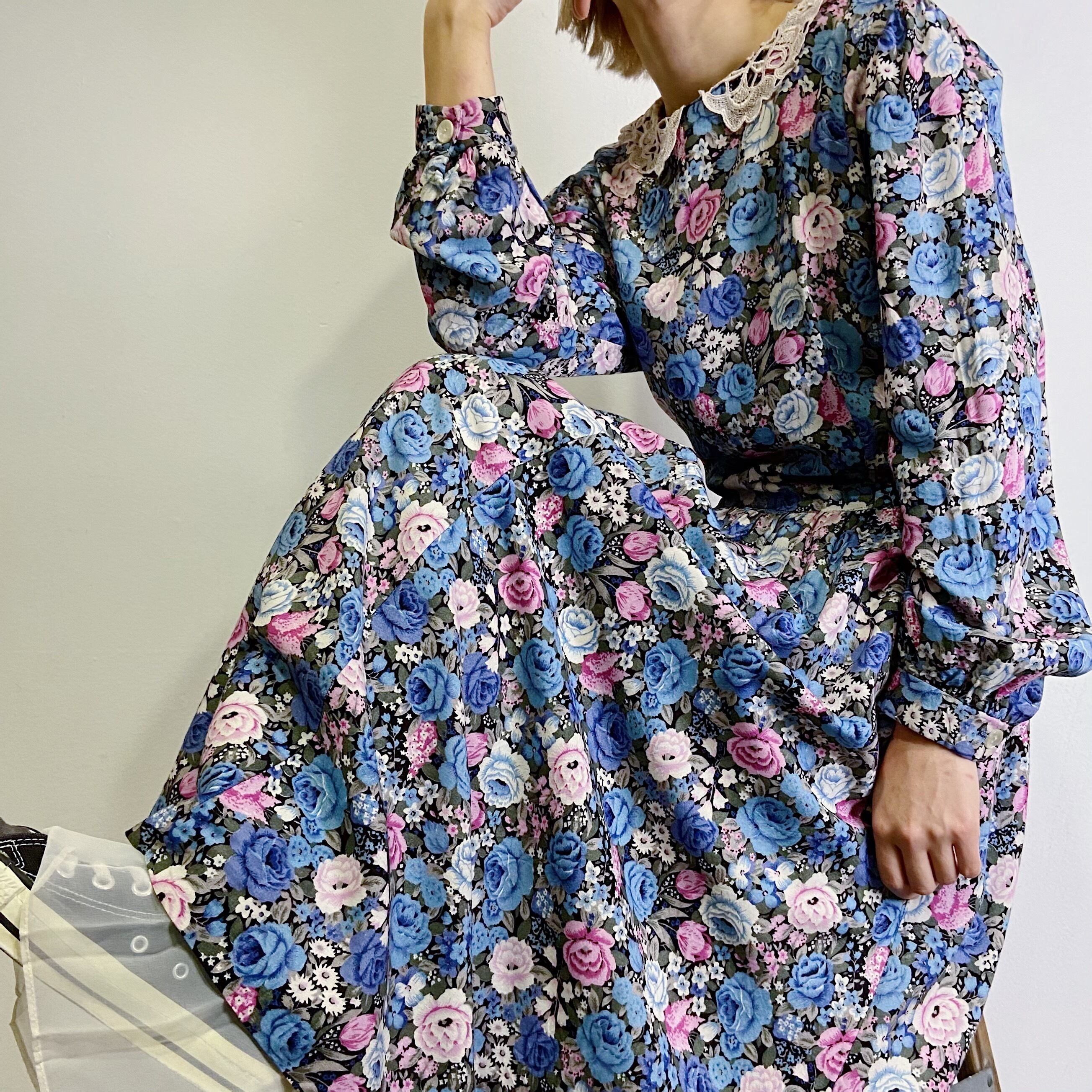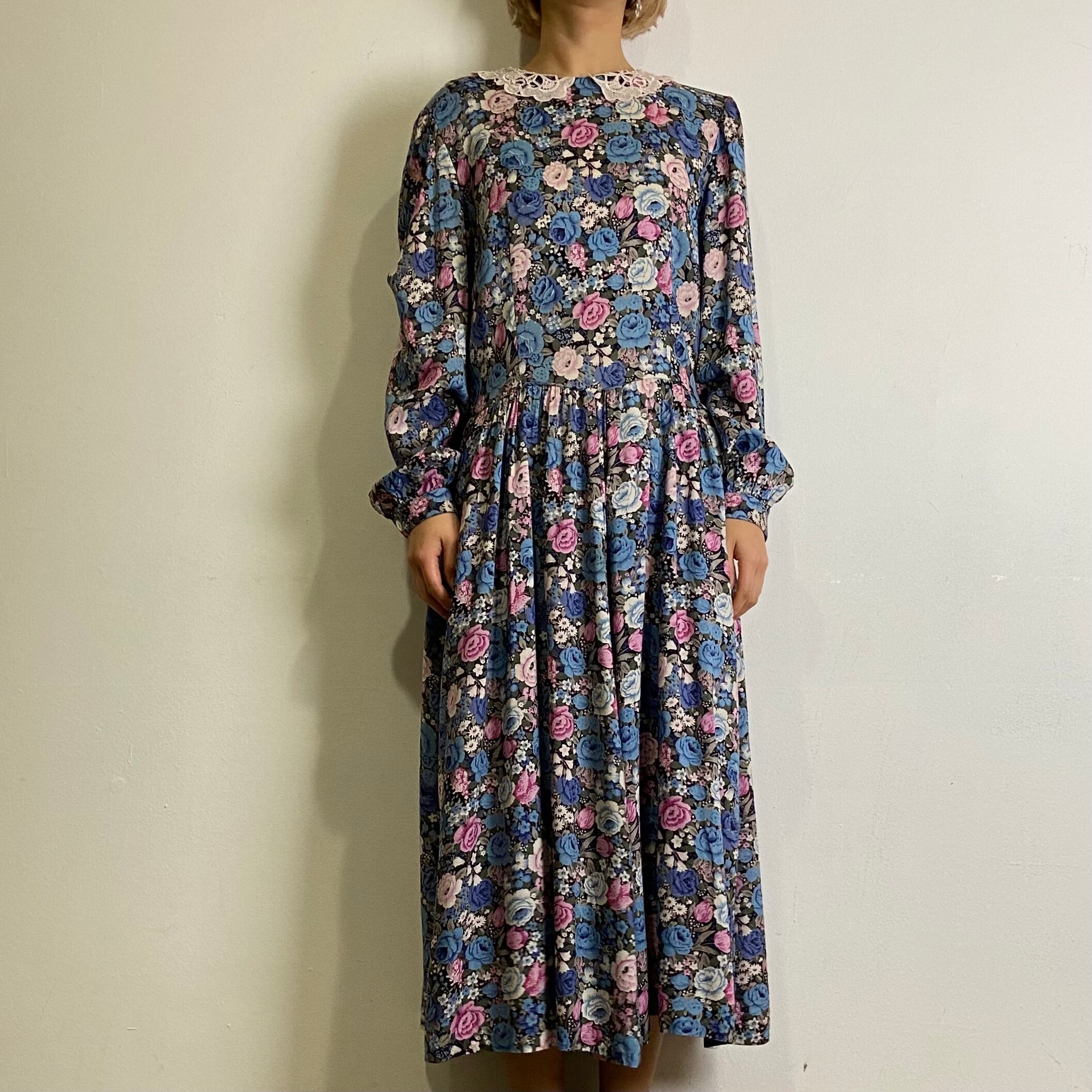 水色とピンクの色合いが80年代らしい、ロマンティックなレーヨンワンピースです。