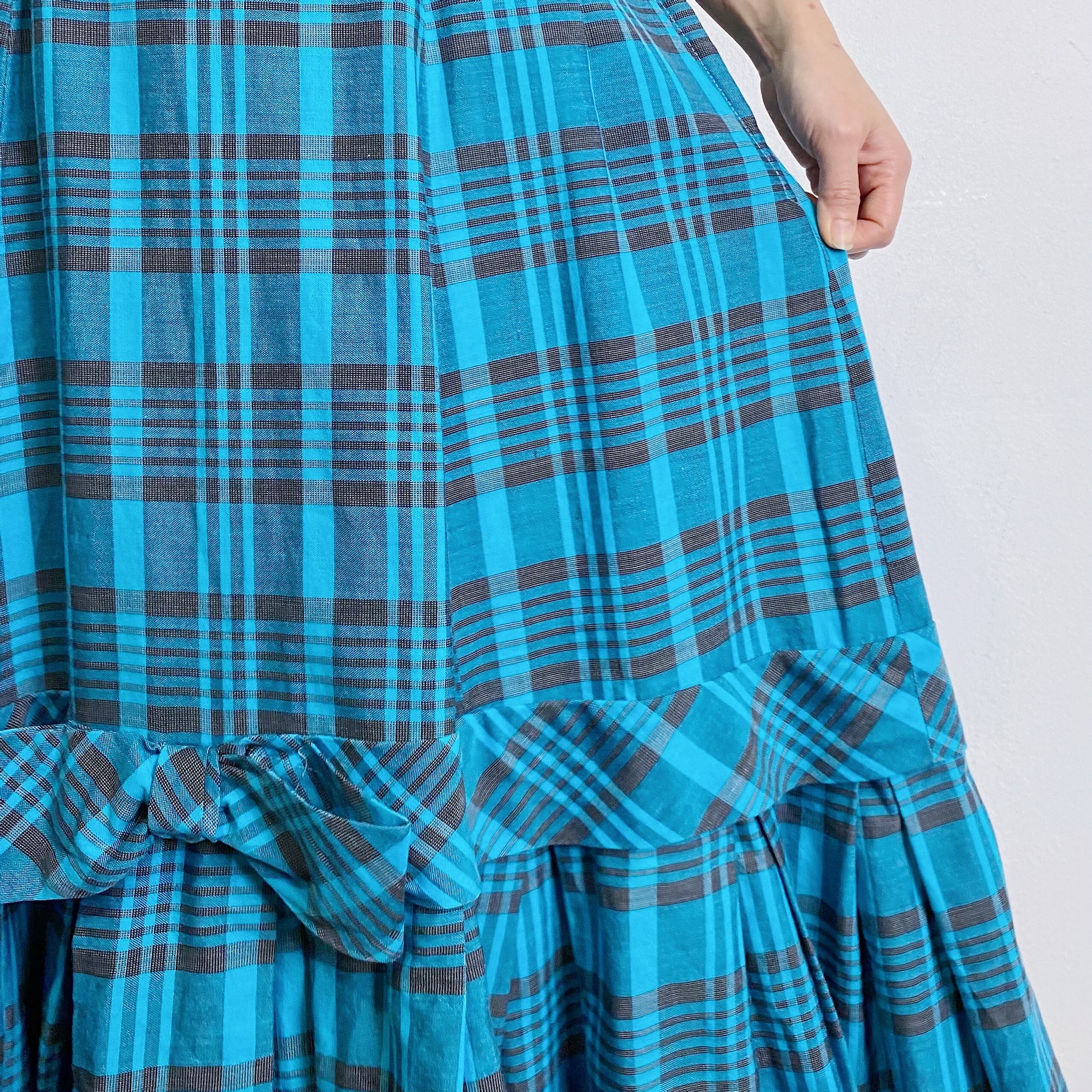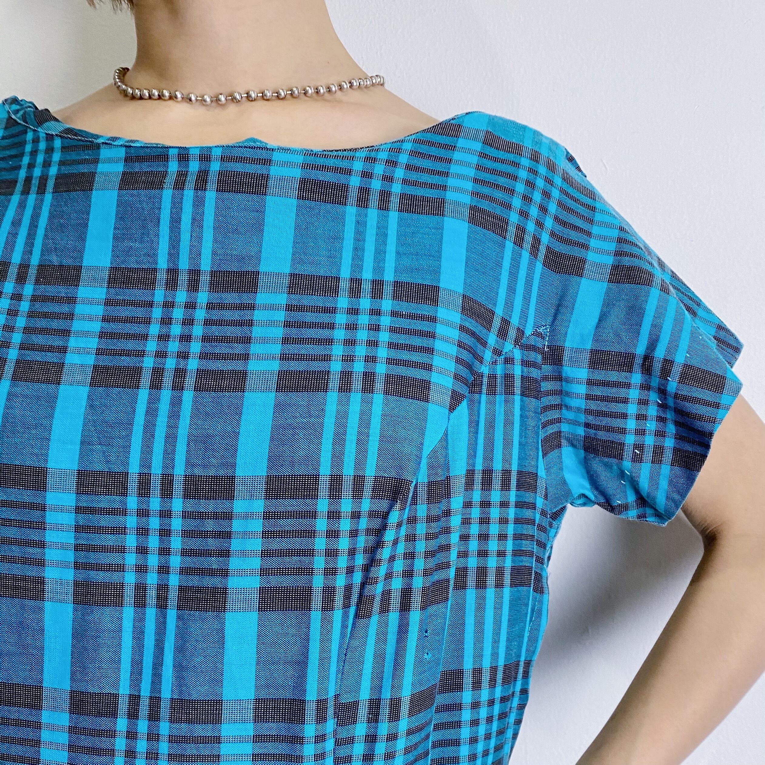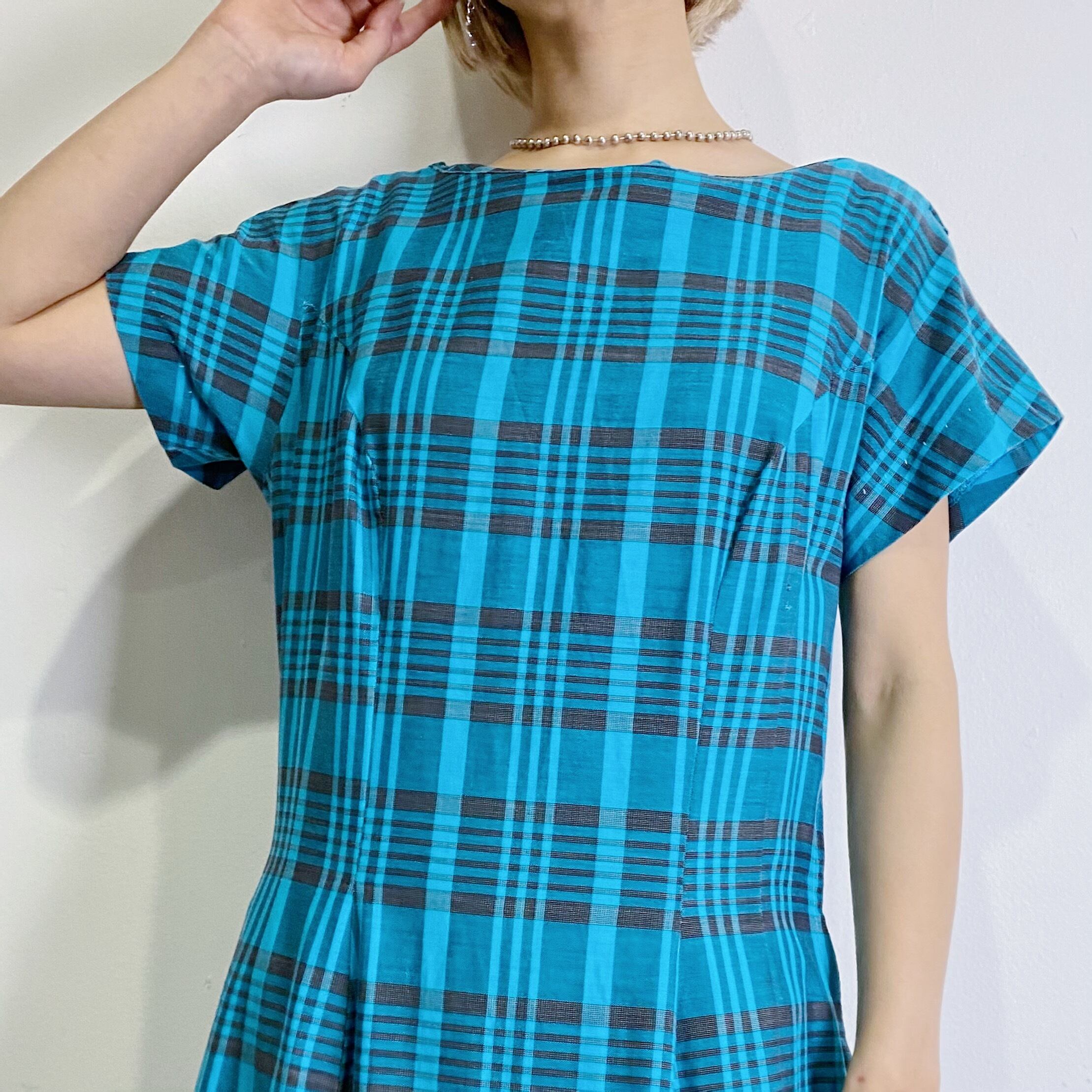 ターコイズブルーとブラックのチェックが可愛い50年代ワンピースです。