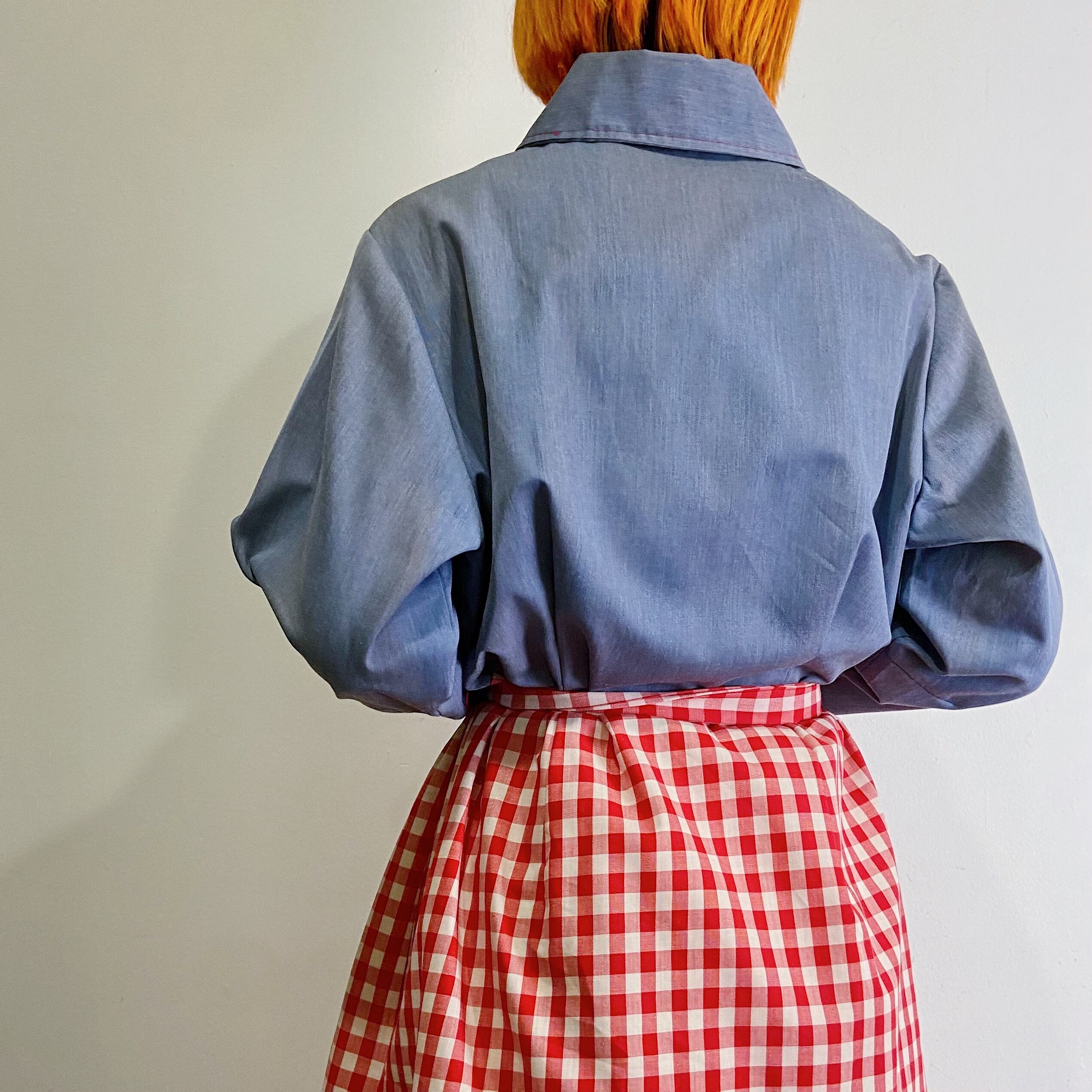 シャンブレーシャツとギンガムチェックの柄使いが可愛い70年代ワンピースです。