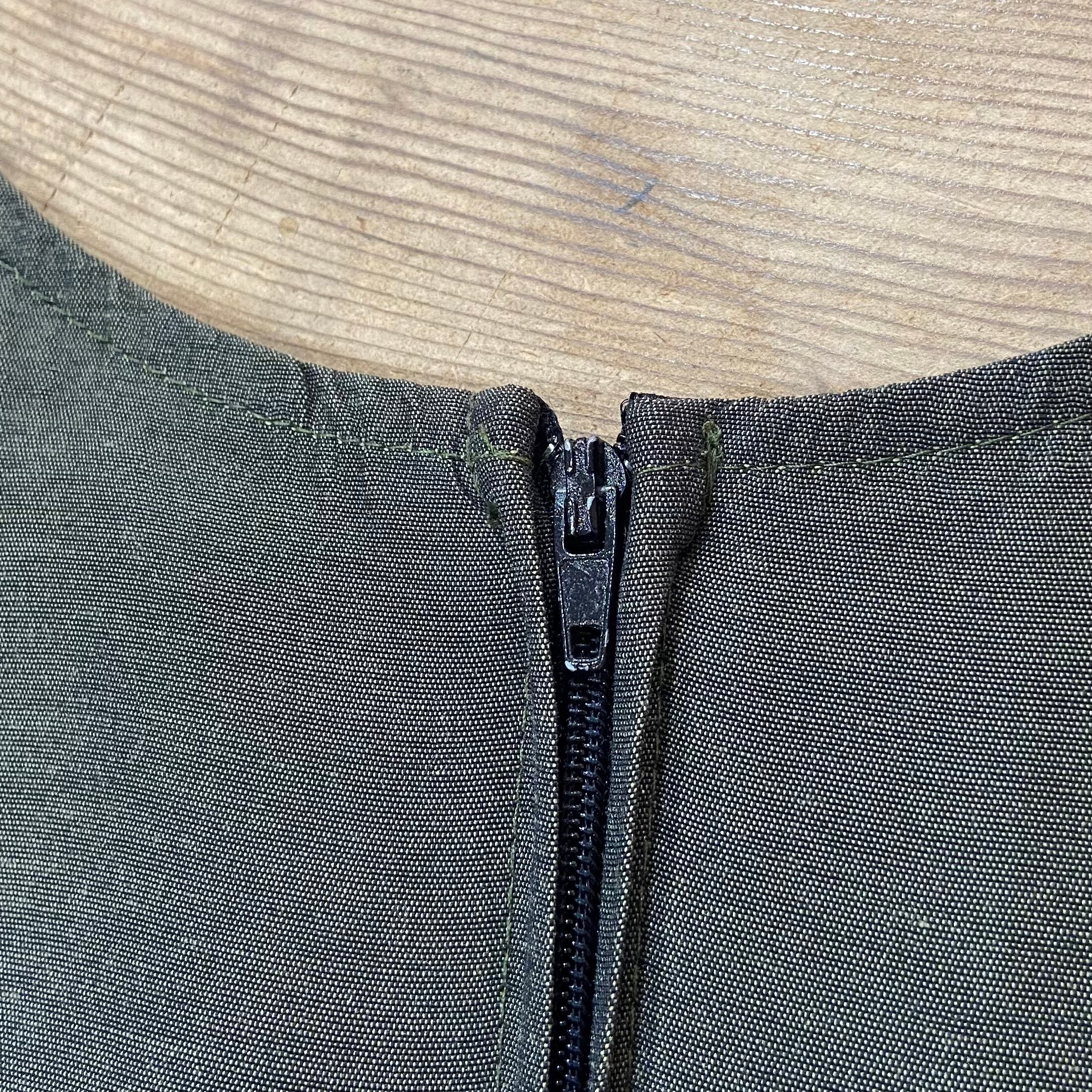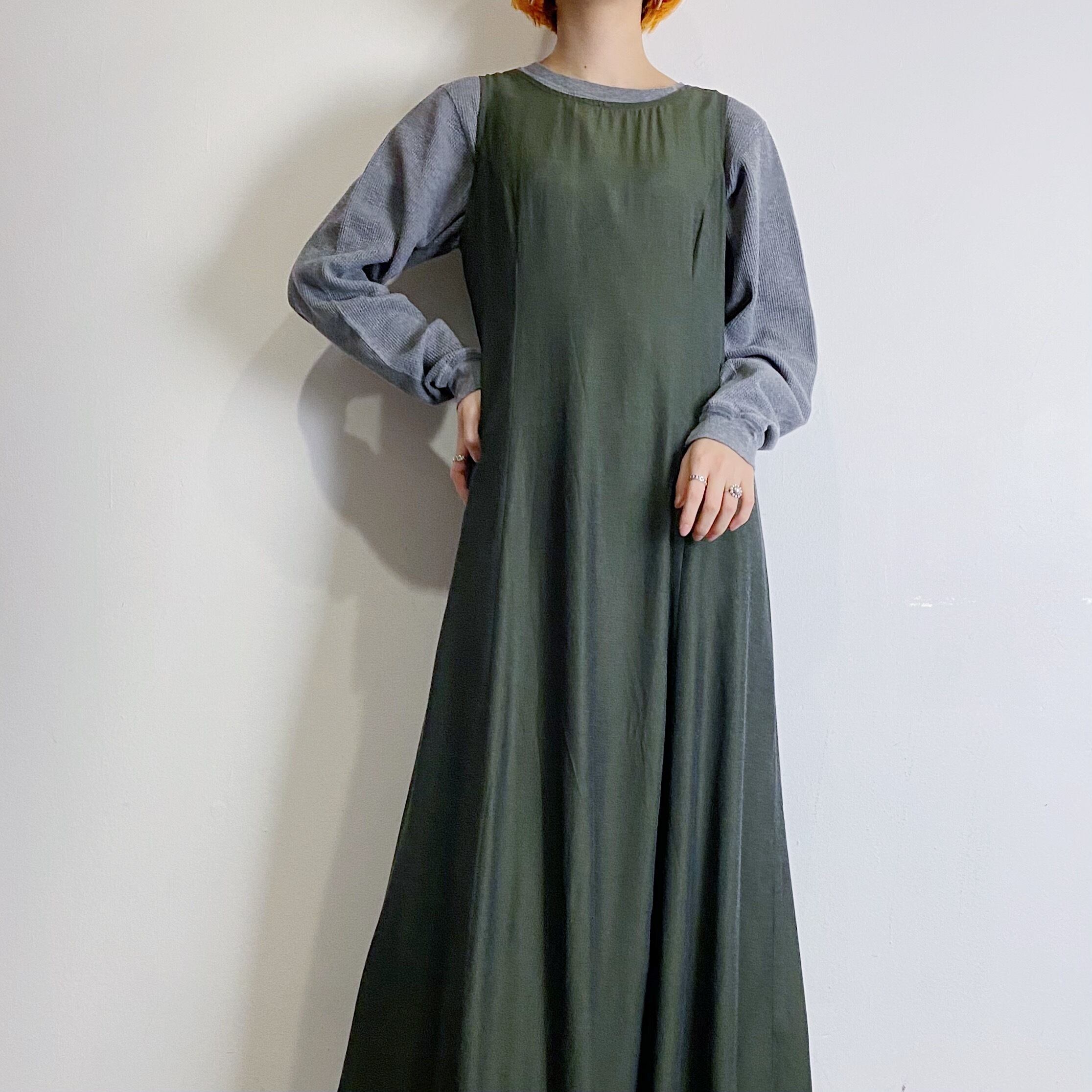 カーキ色が可愛いとろんとした質感のジャンパーワンピースです。