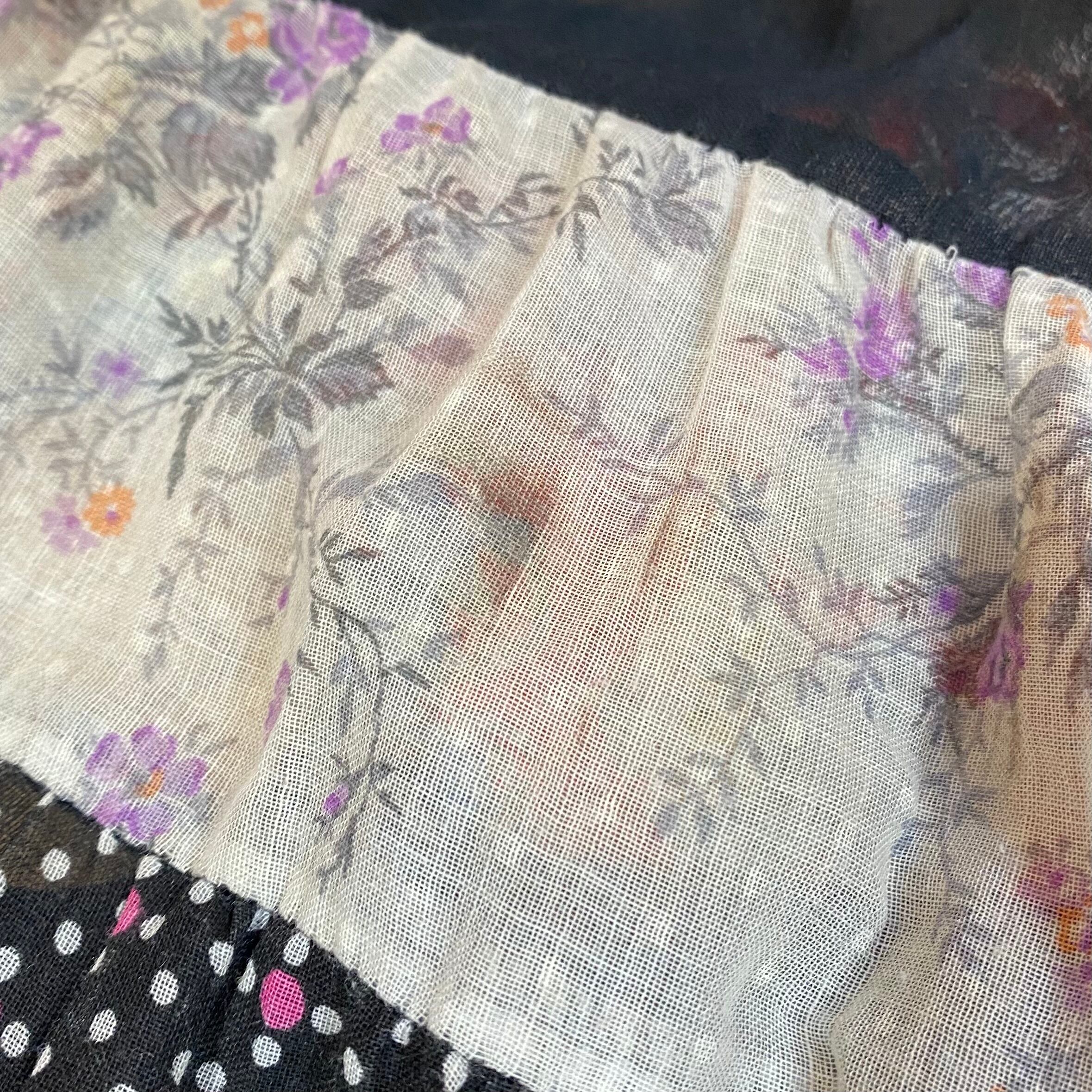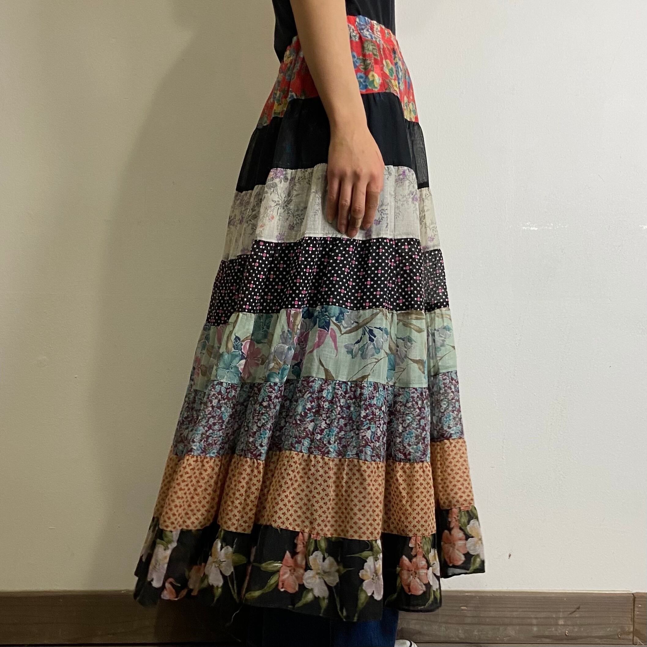 様々な柄の布が繋がって作られた、可愛らしいボリュームスカートです。