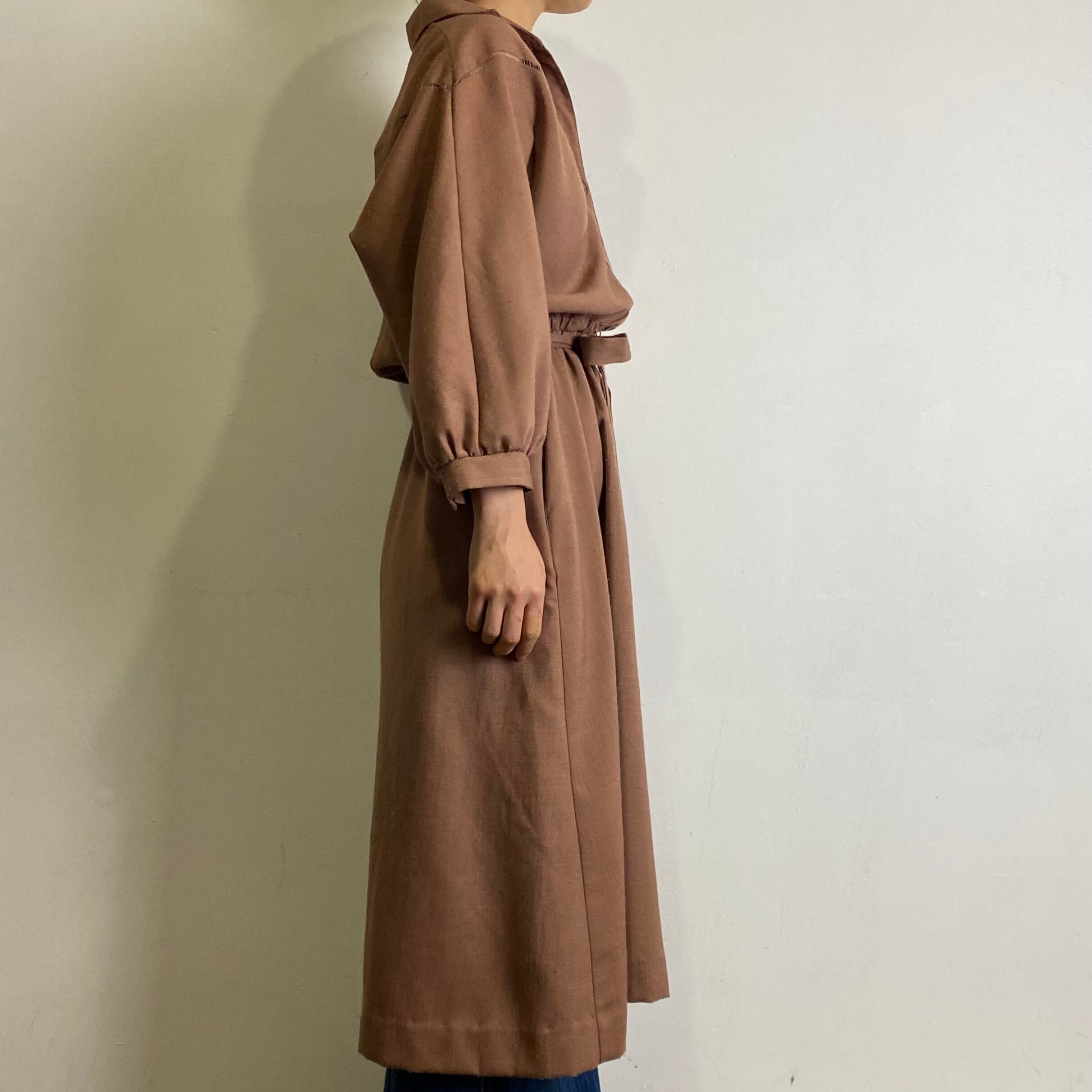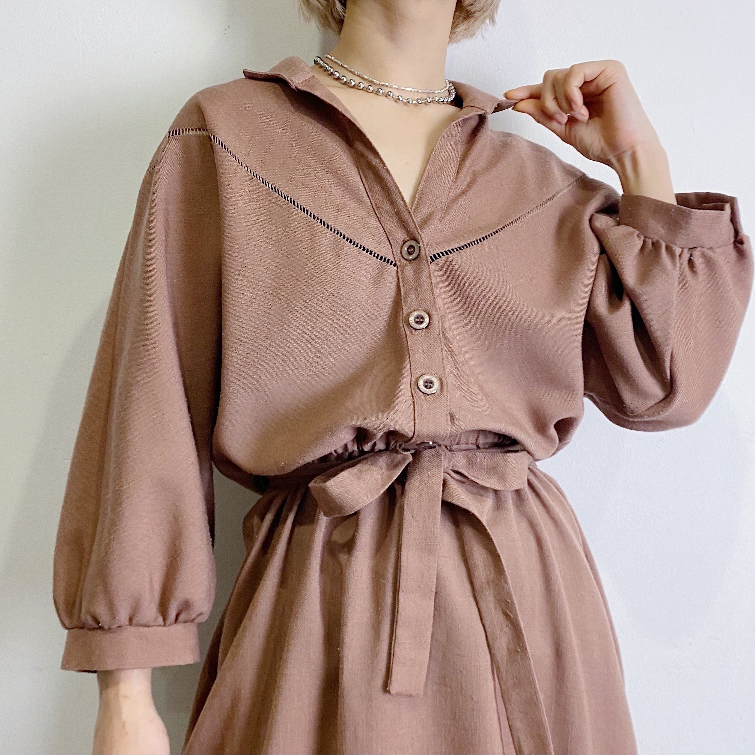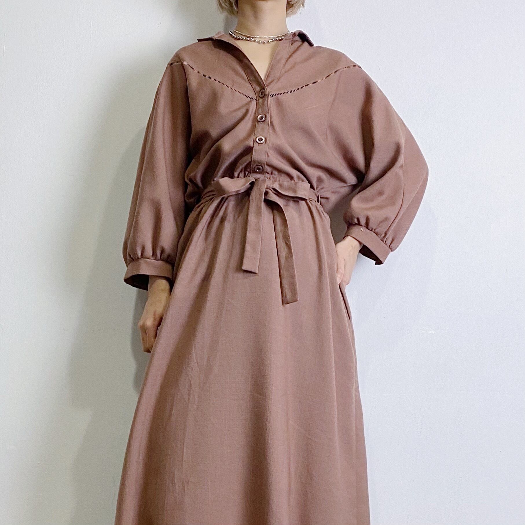 マロンブラウンの色合いにぽわっとしたお袖のシルエットが可愛いワンピースです。