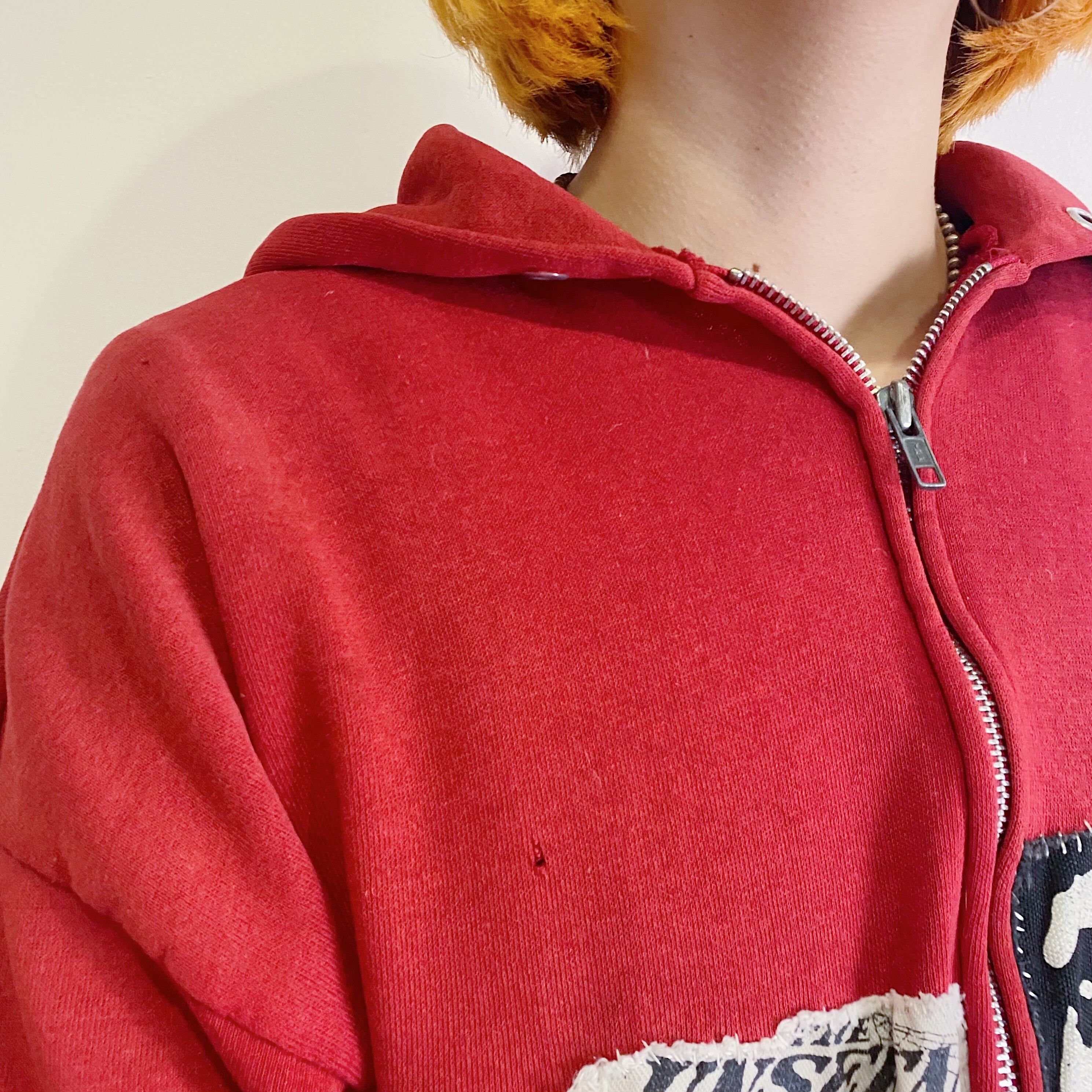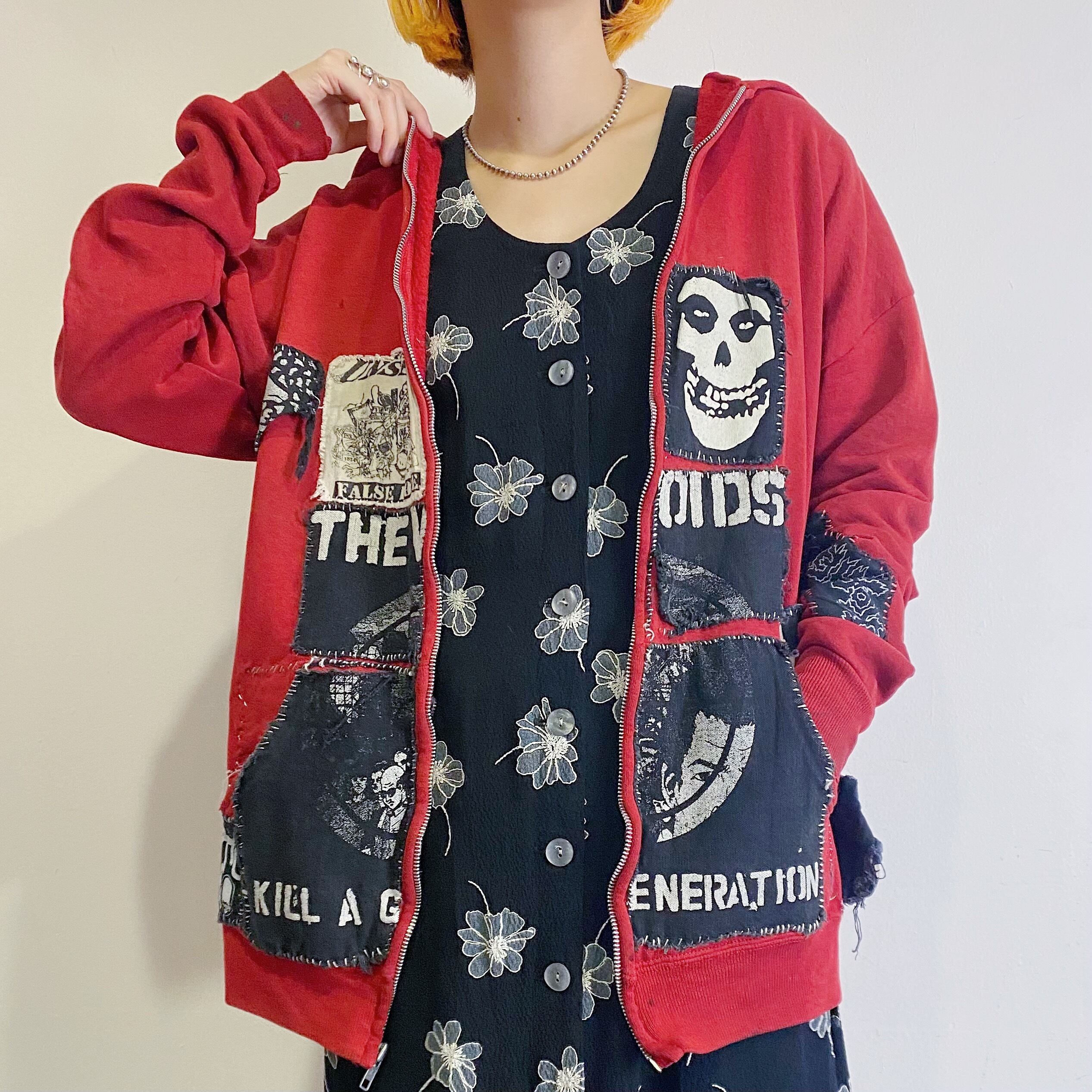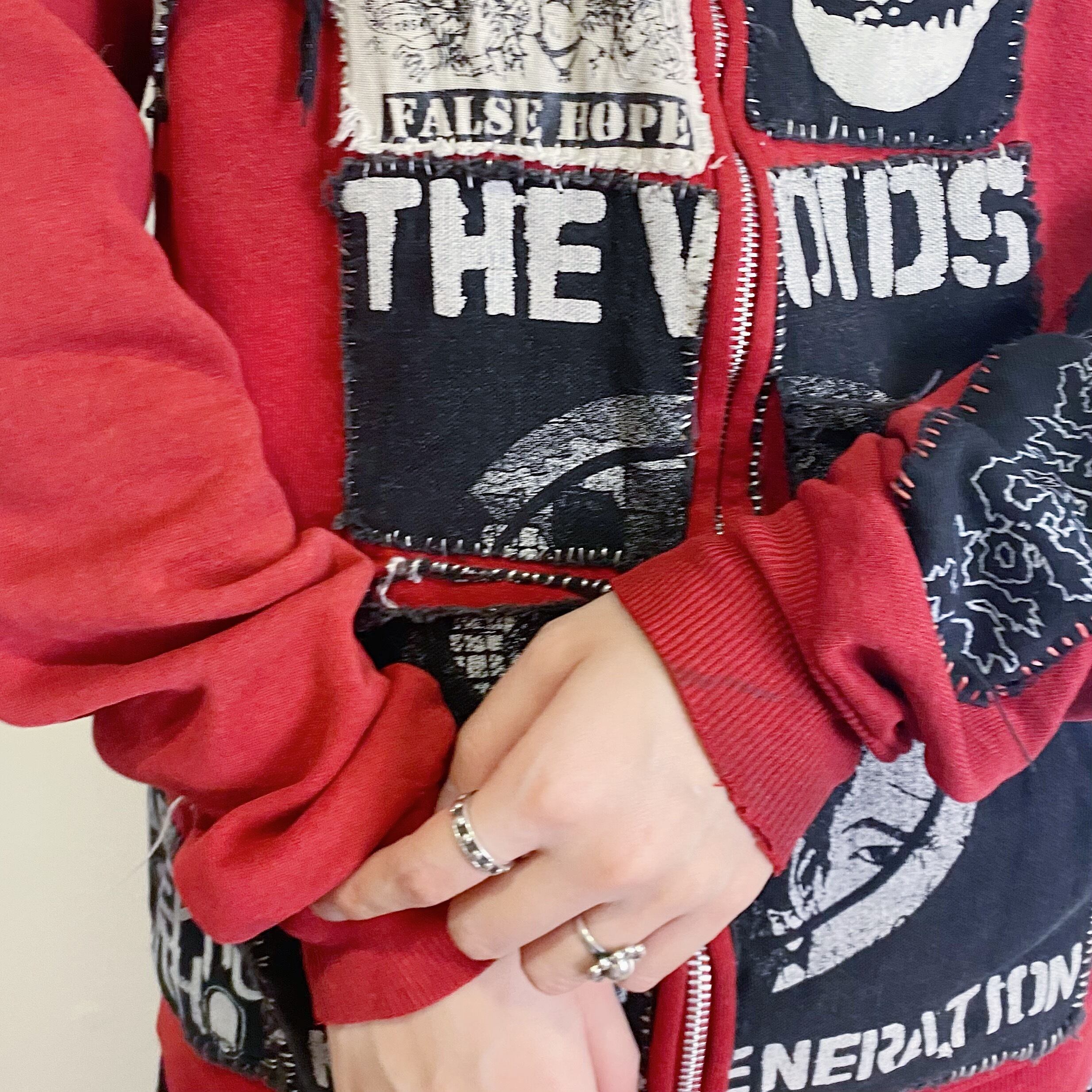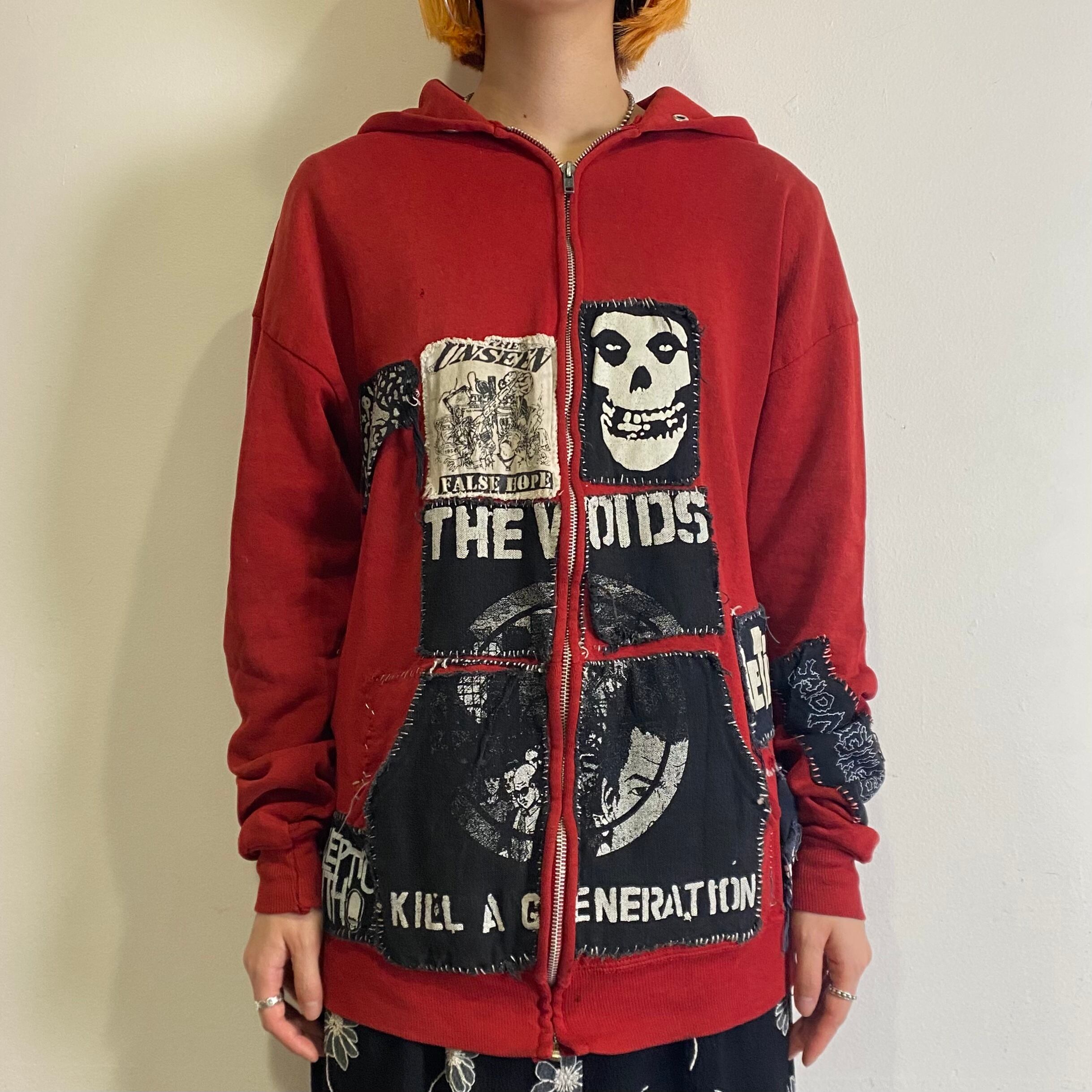 様々なハードコア、パンクバンドの布がパッチされたリメイクジップアップパーカーです。