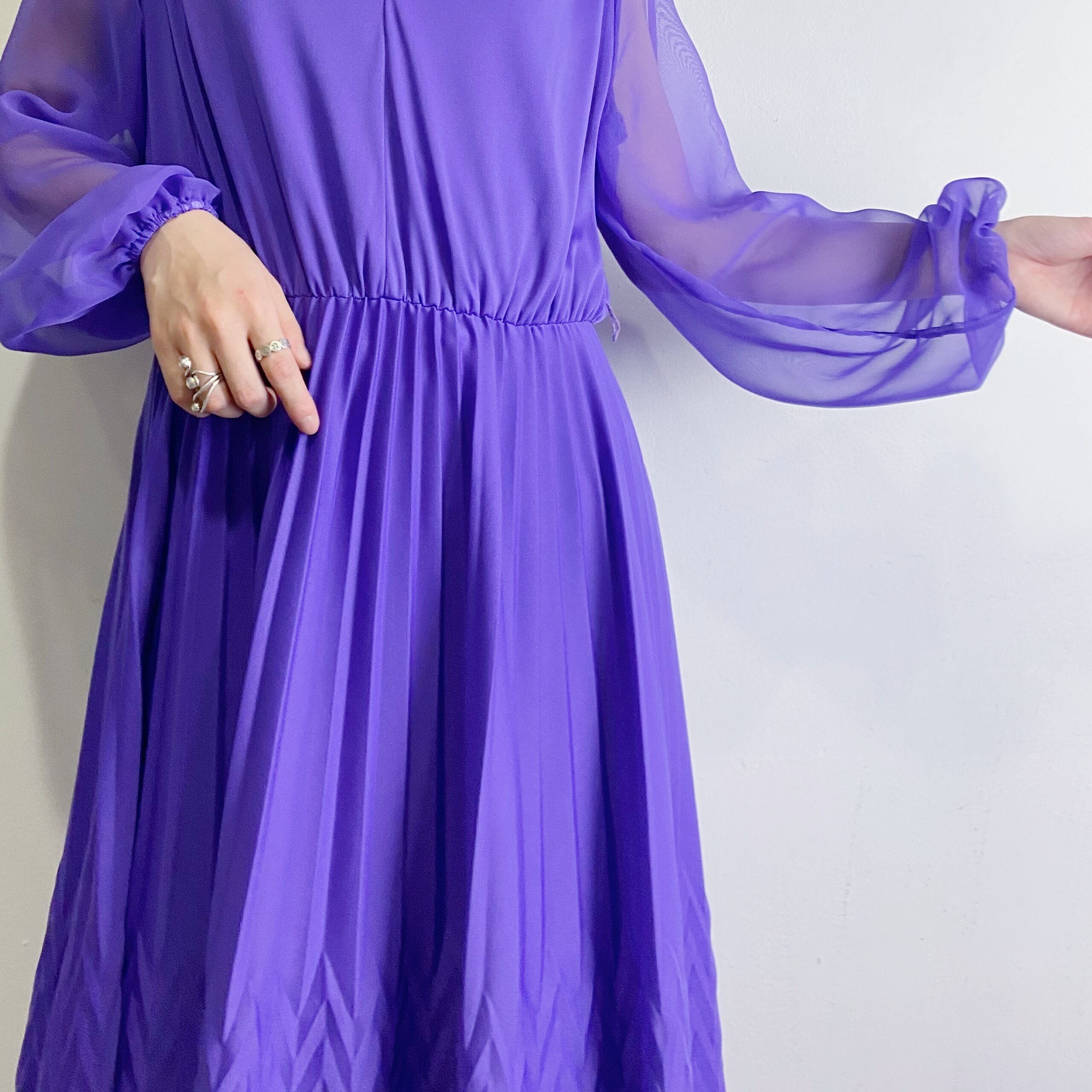 シースルー地のお袖にユニークなプレスで模様が施された紫色のワンピースです。