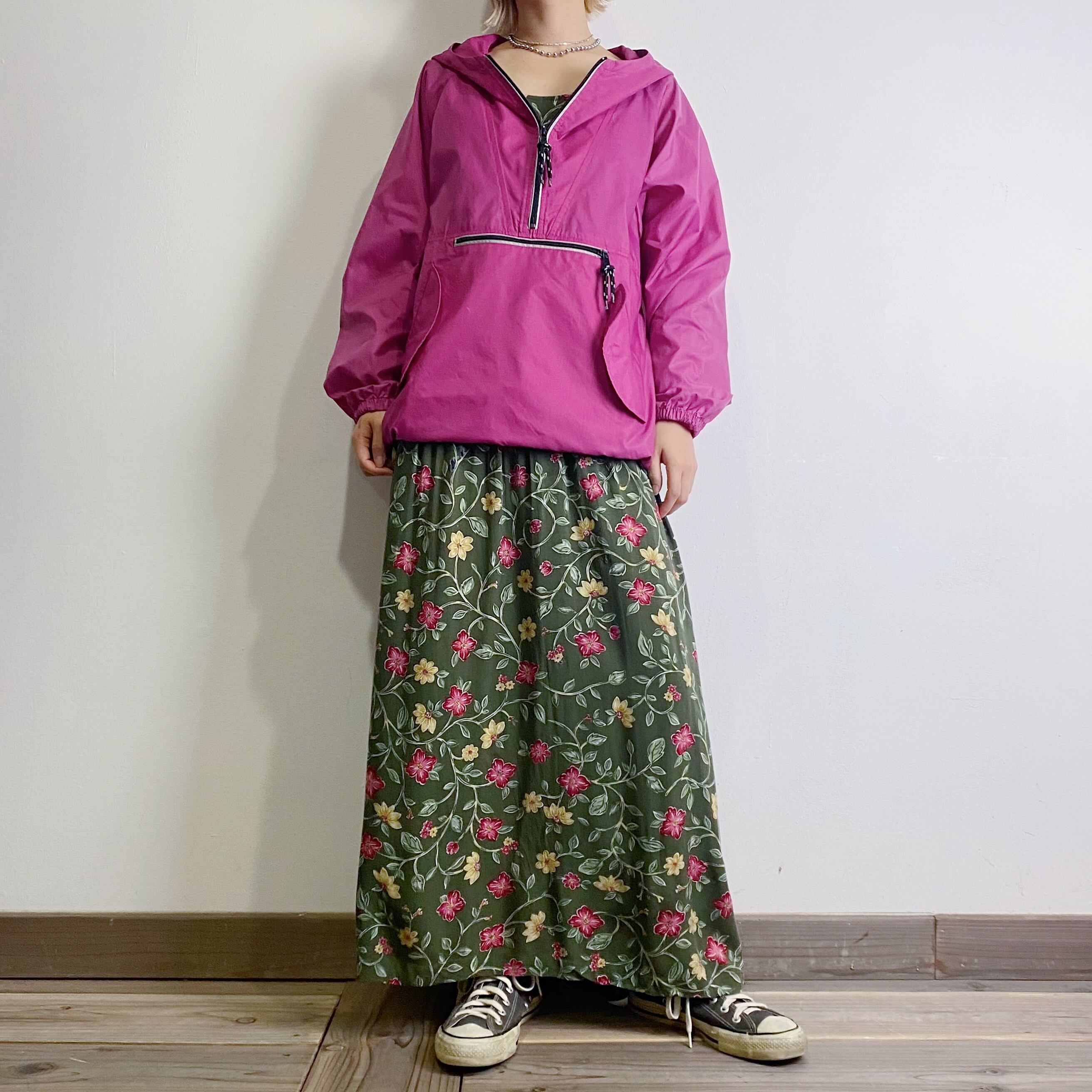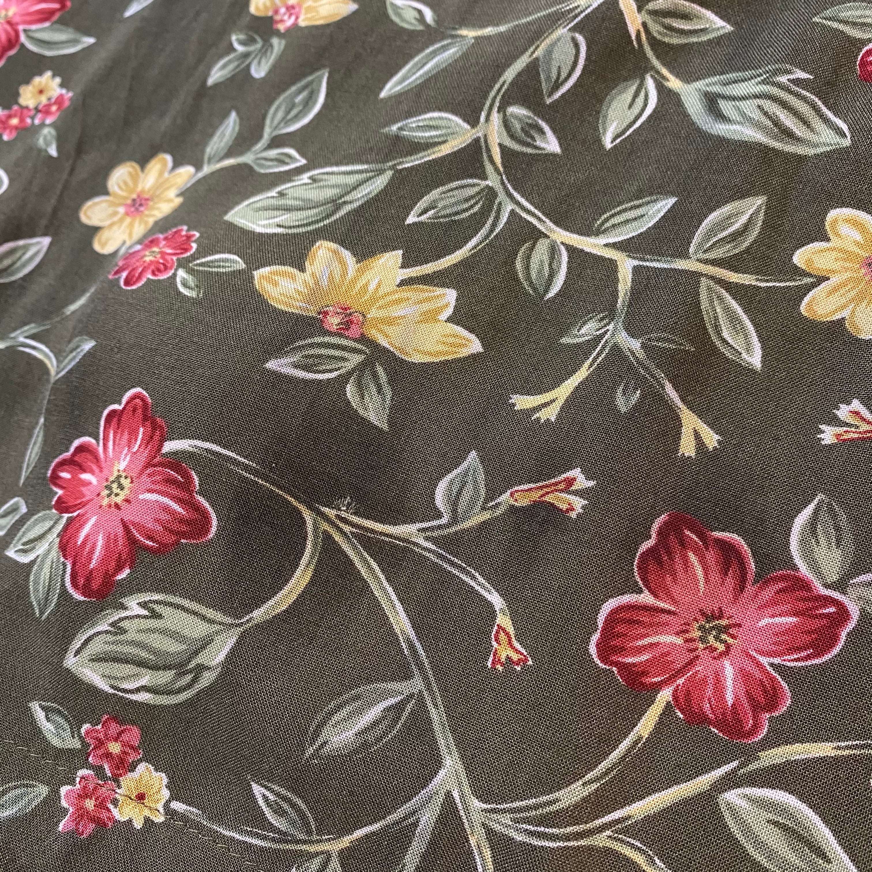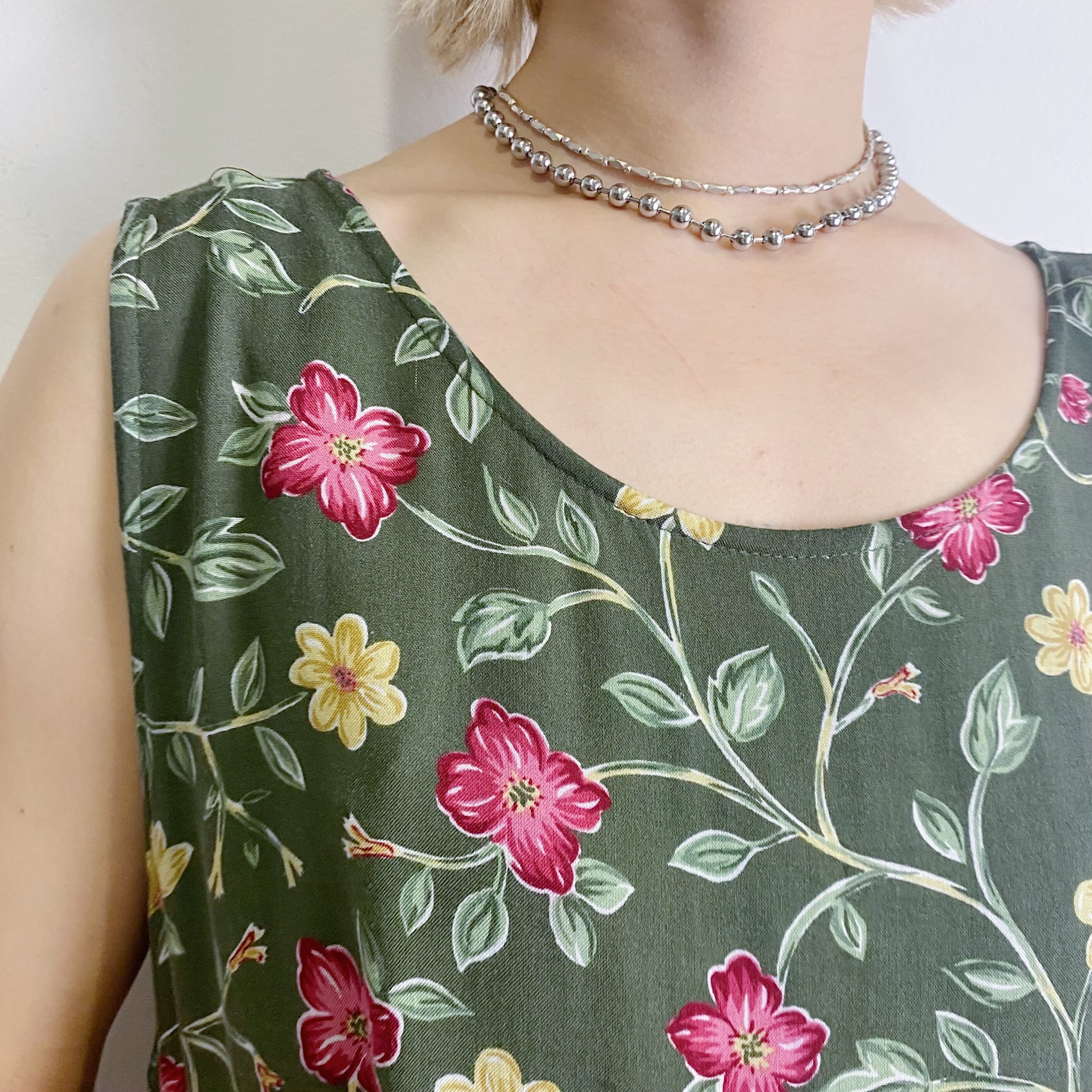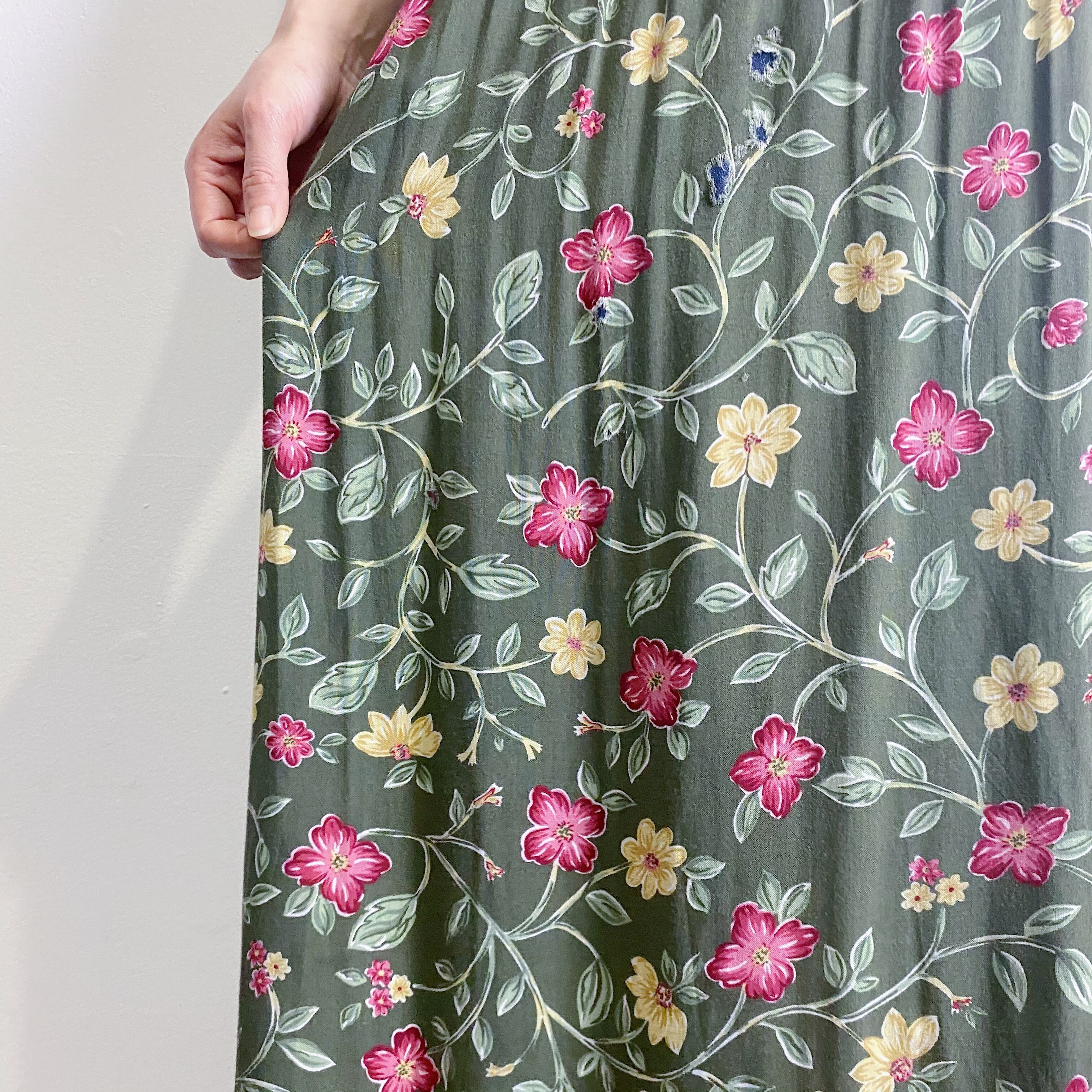 オリーブカラーが大人可愛い、花柄レーヨンワンピースです。