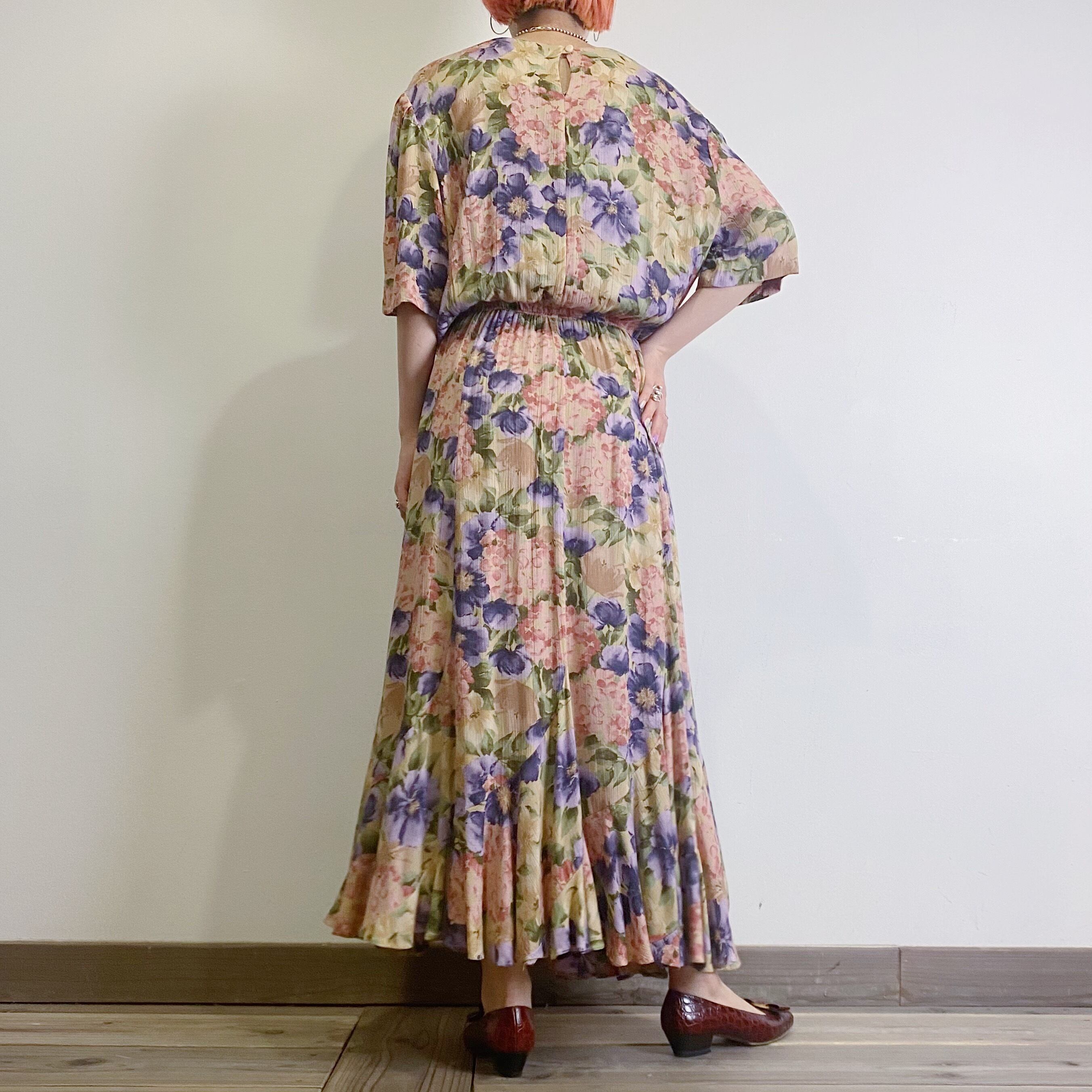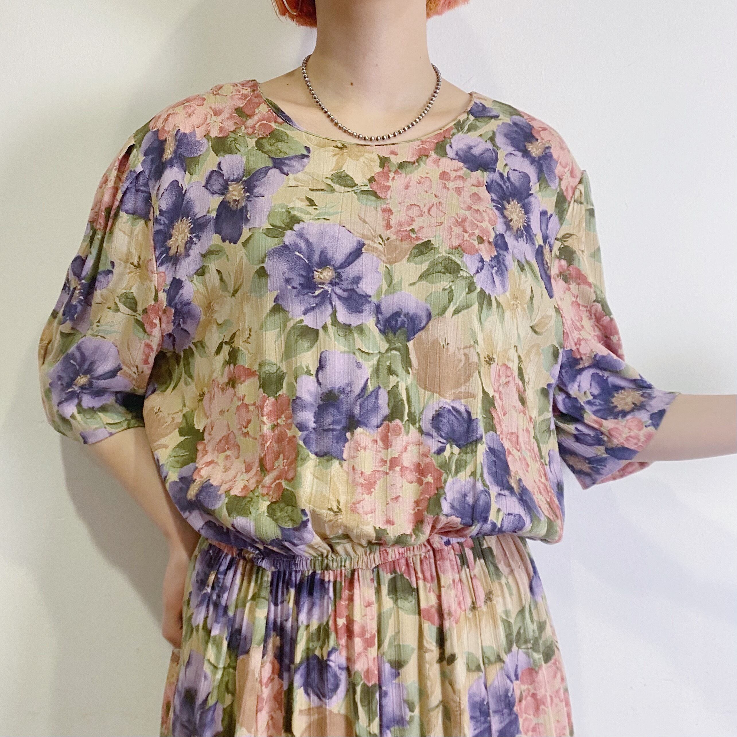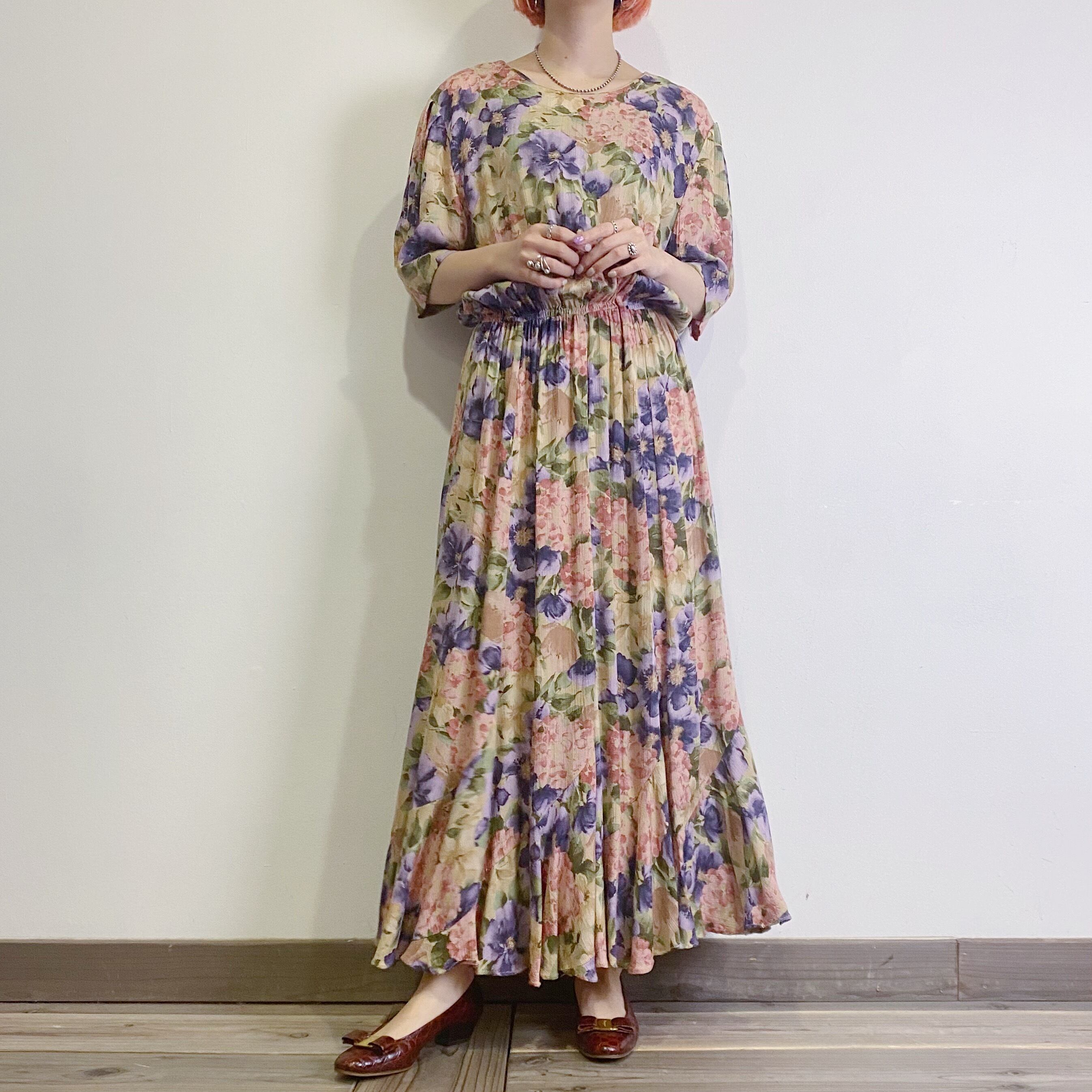 ベージュベースに紫やピンクのお花が可愛いレーヨンワンピースです。