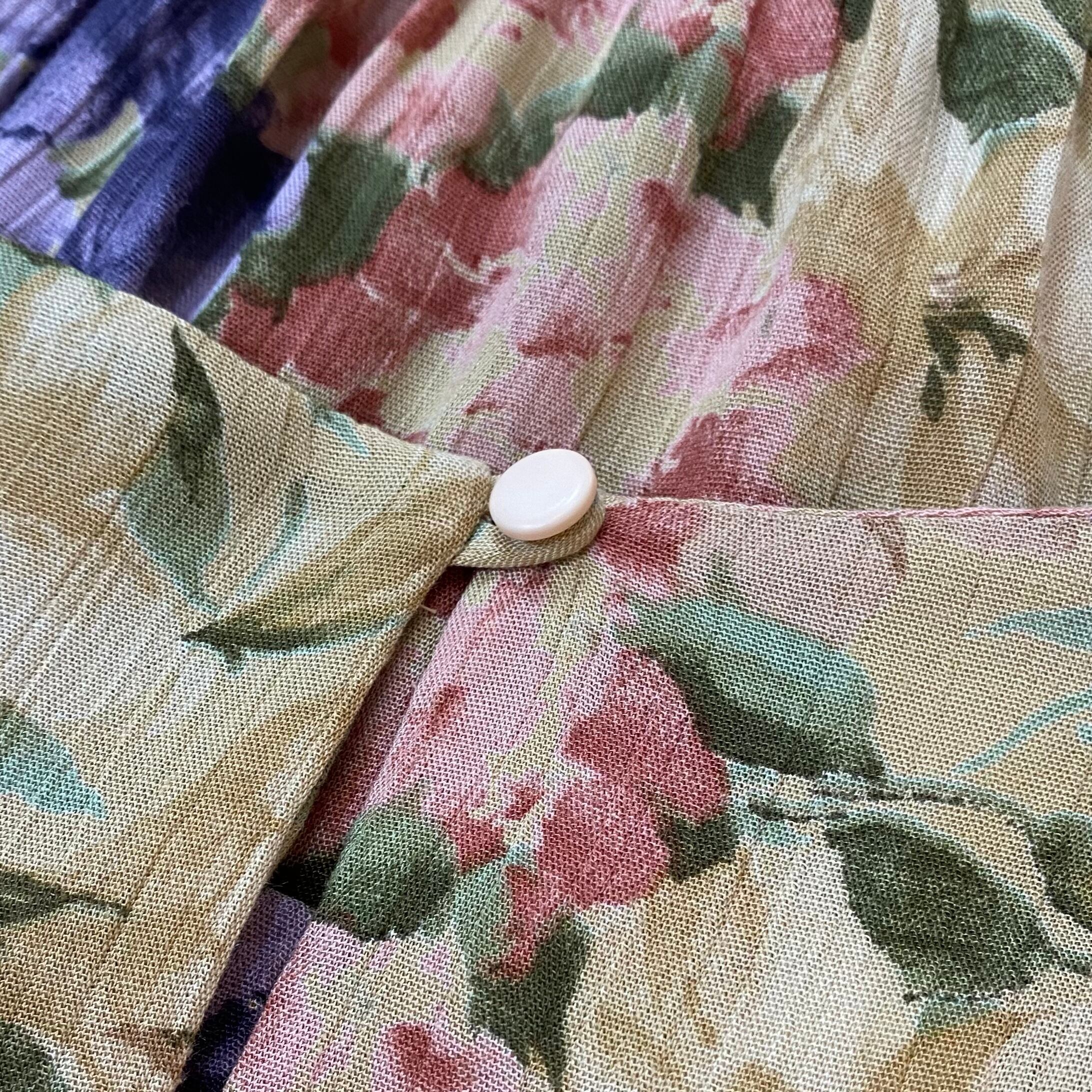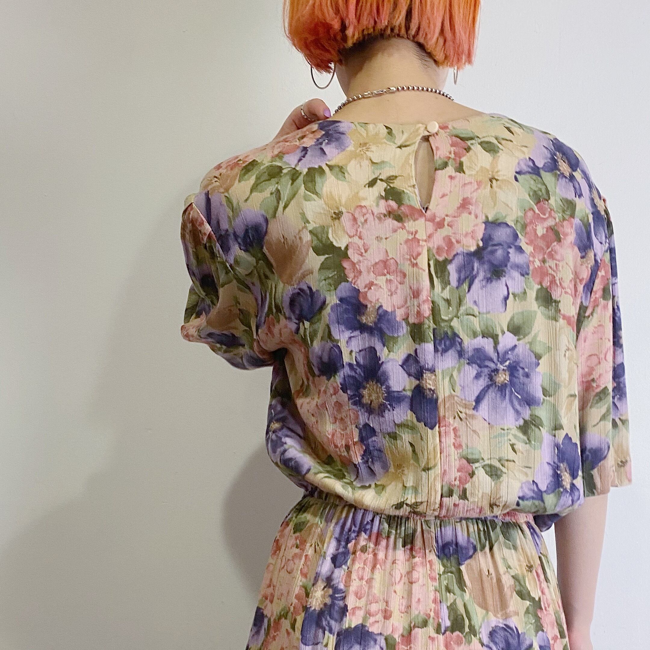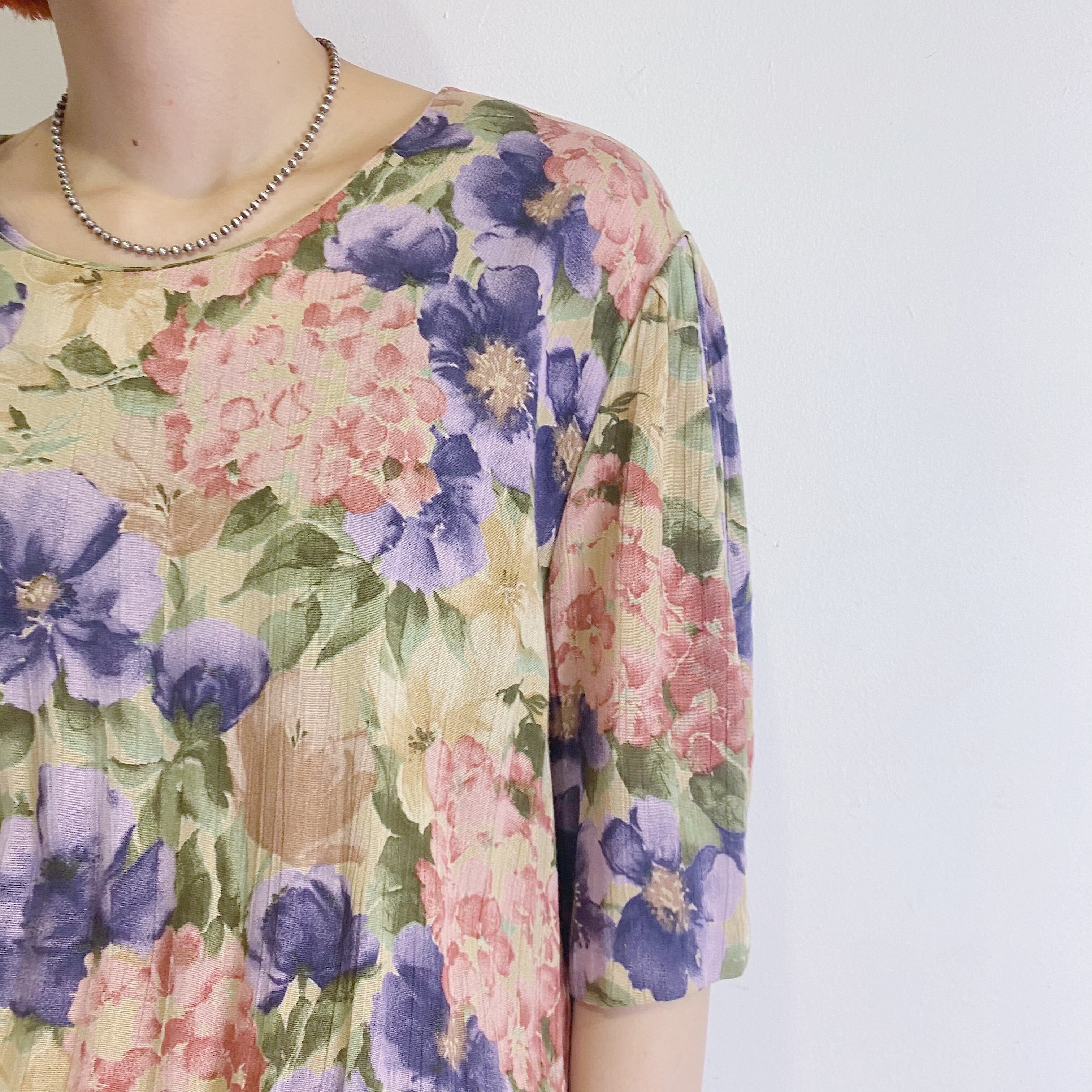 ベージュベースに紫やピンクのお花が可愛いレーヨンワンピースです。