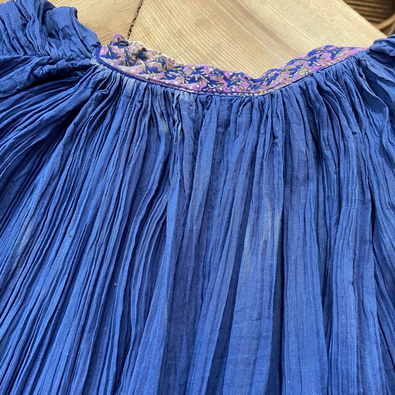 そもそもレアで希少価値があるインド綿ワンピースですが花柄のタイプが多く、こちらは無地に草花の切り替えといった、なかなかお見掛けできない一枚です。