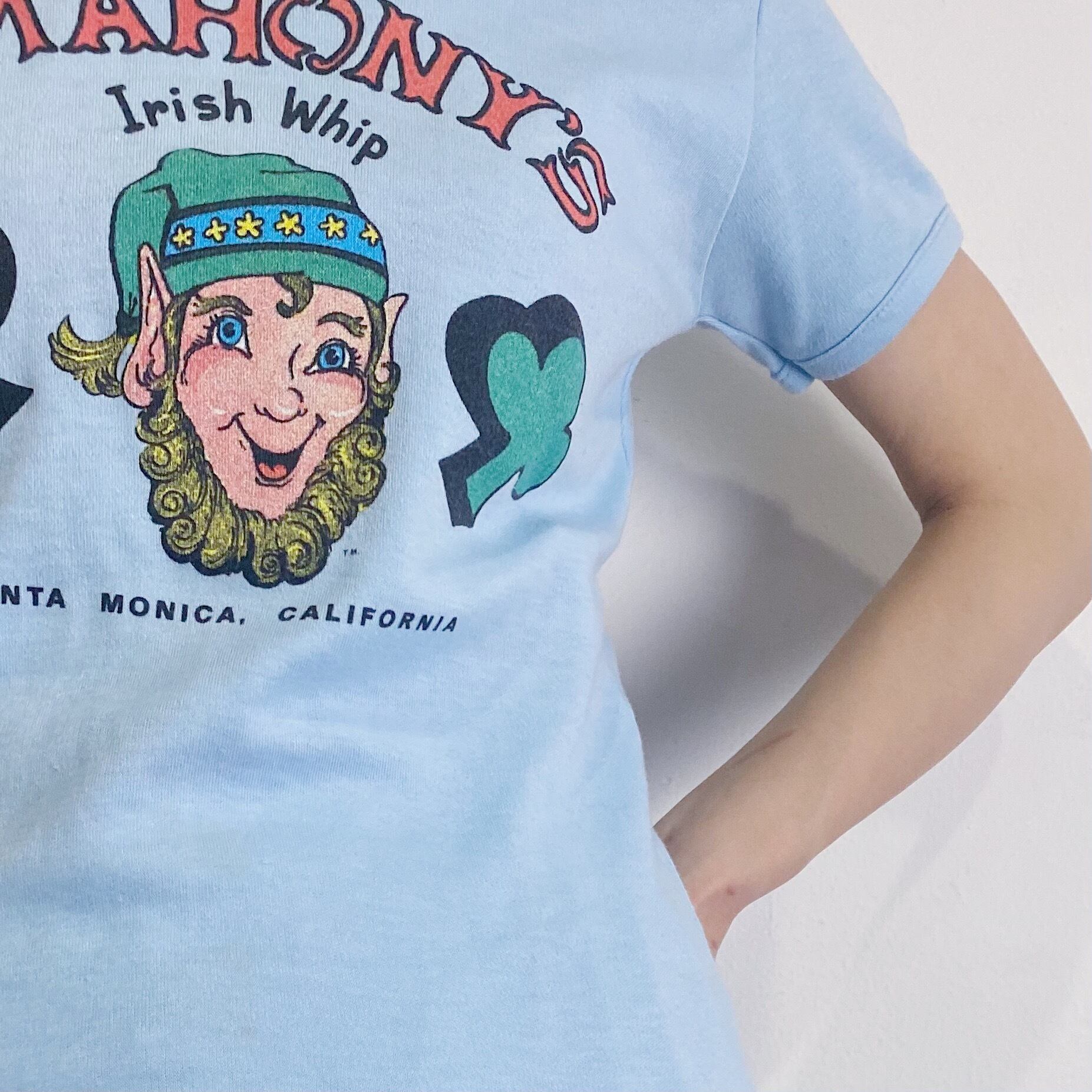 おそらくサンタモニカにあったレストランバーのTシャツで、水色ベースにオレンジやグリーンの配色プリントがイケてます。