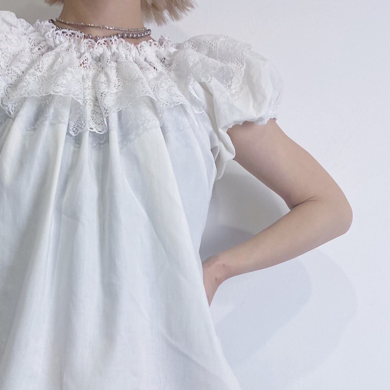 首周りのレースがポイントな70年代のチュニックトップです。