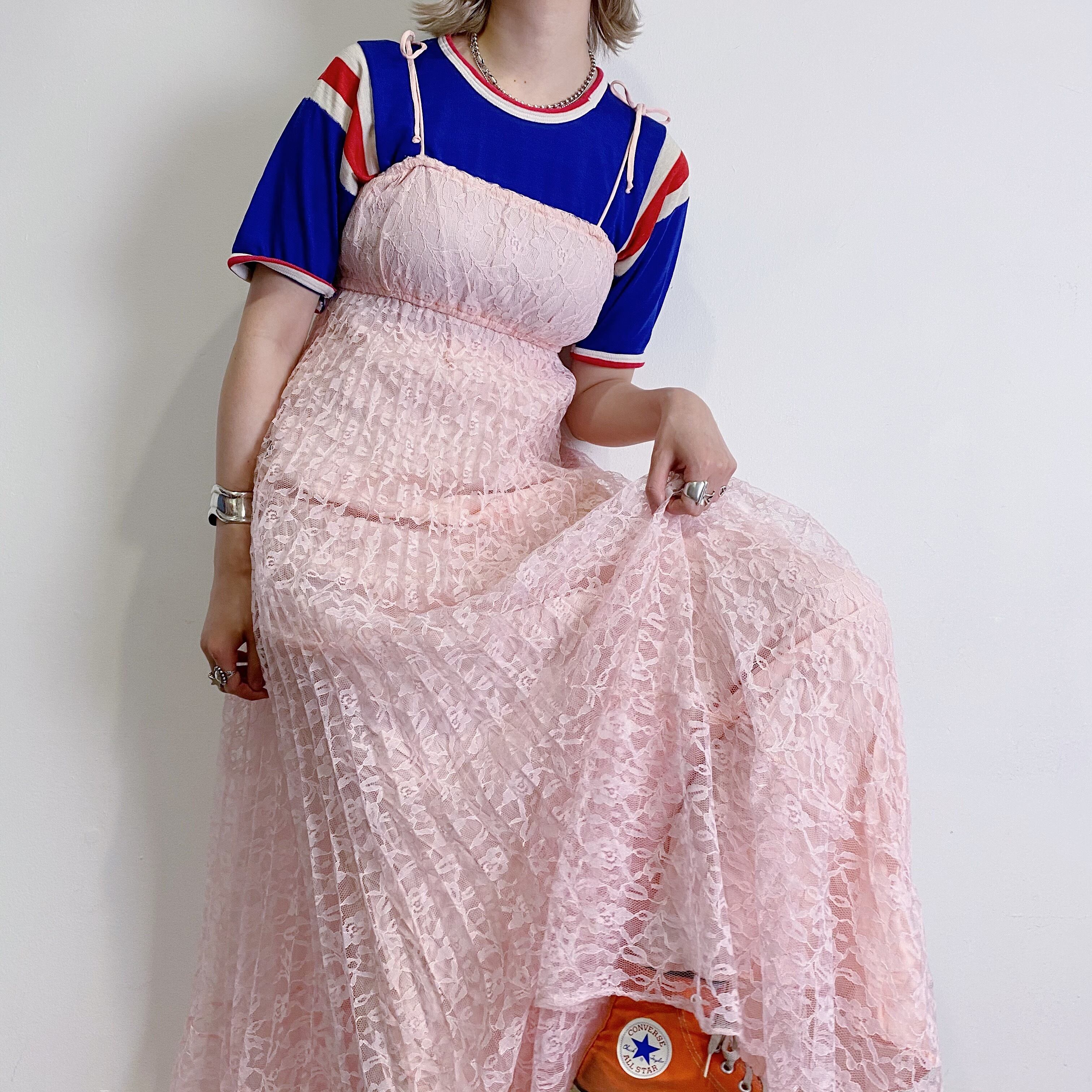 ベイビーピンクに総レースが可愛いロングキャミワンピースです。