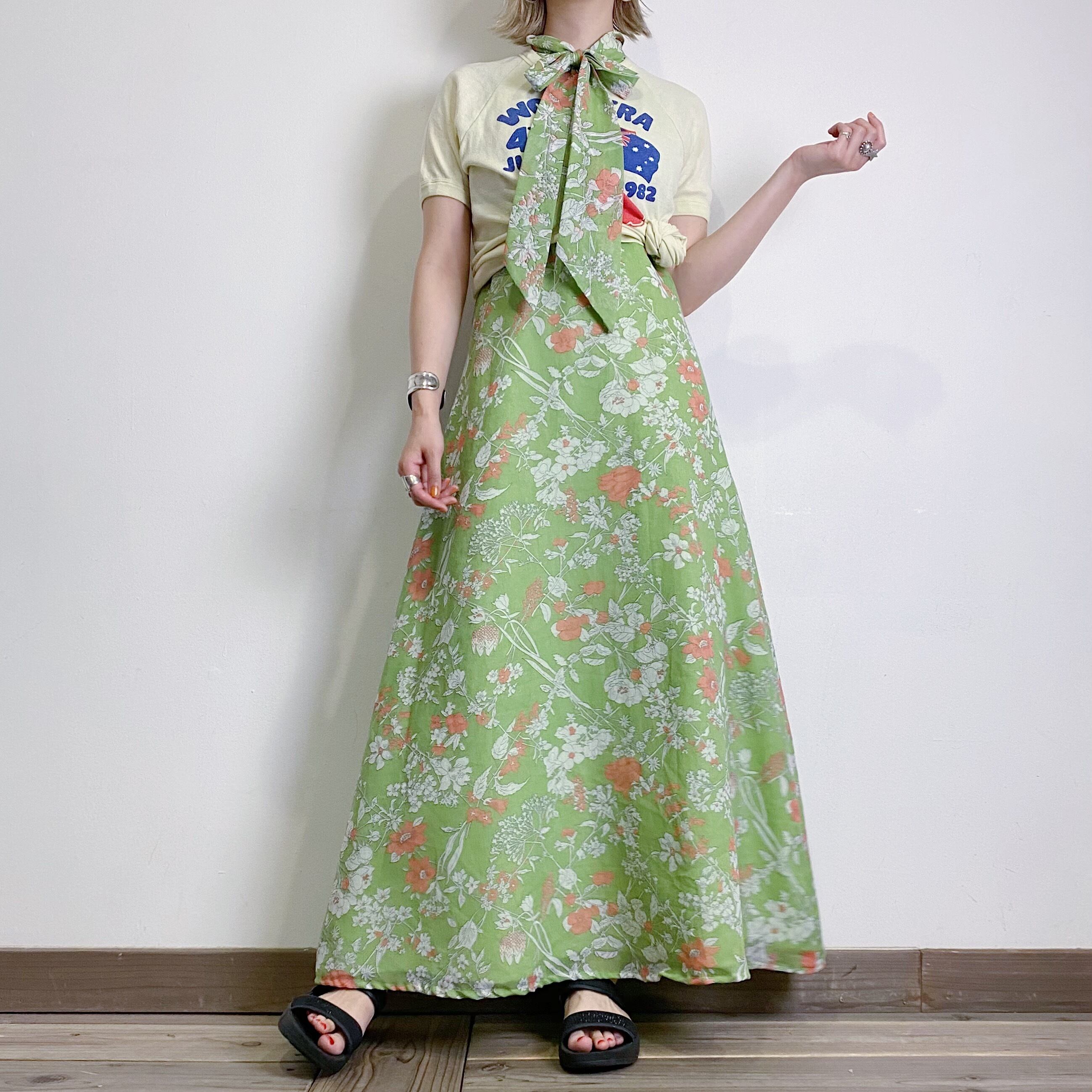 首元の大きなリボンがアクセントになった、70年代のロングワンピースです。