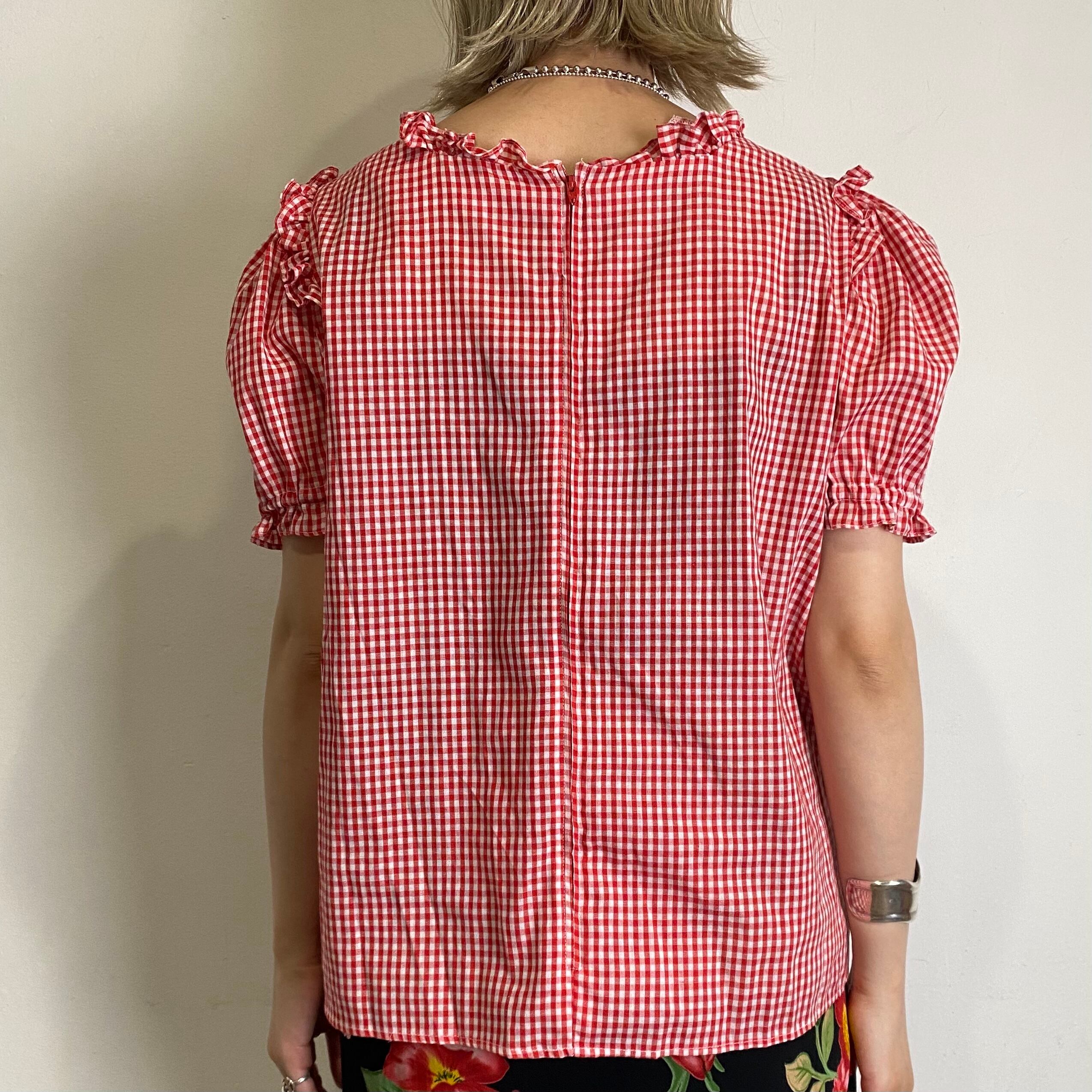 小さな縁のフリルや首元のリボン、程よいパフスリーブ加減が可愛いアイテム。