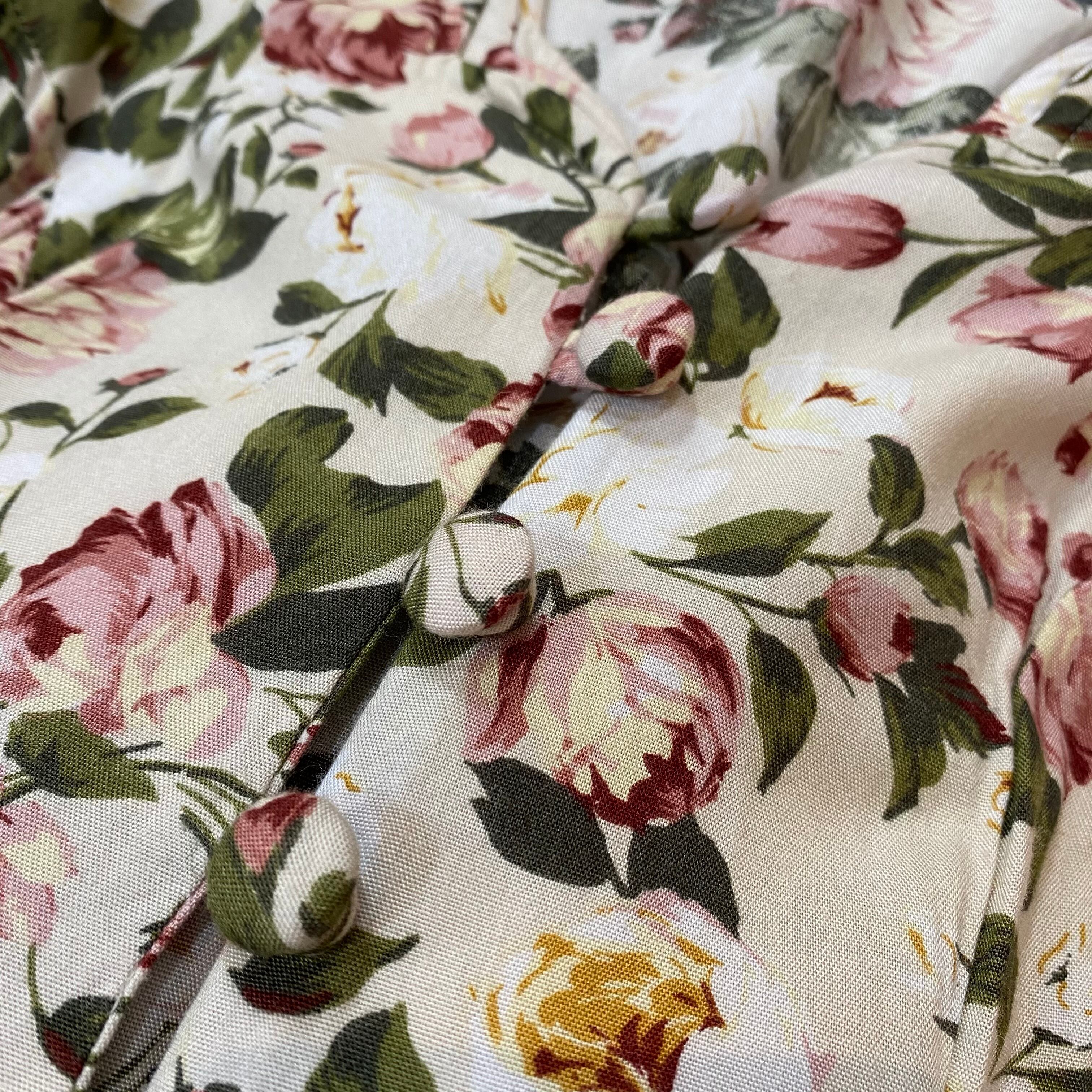 白地にお花が咲き乱れるデザインが可愛い、レーヨンワンピースです。