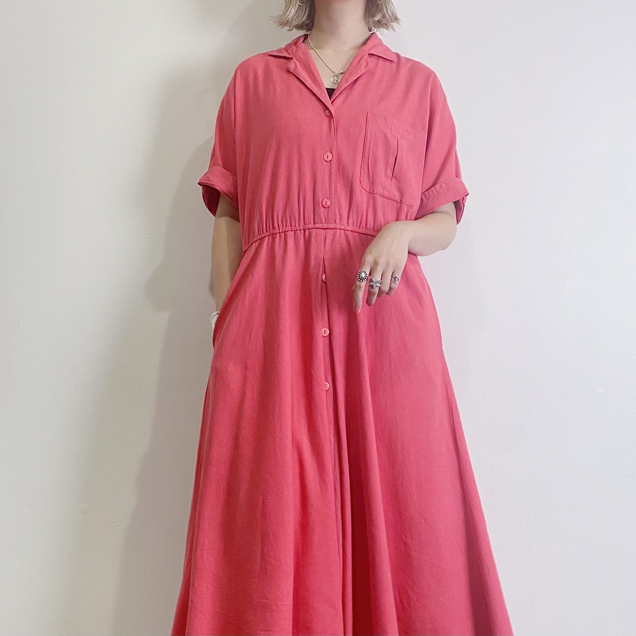 こっくりピンクに長めの丈感が可愛いシャツワンピースです。