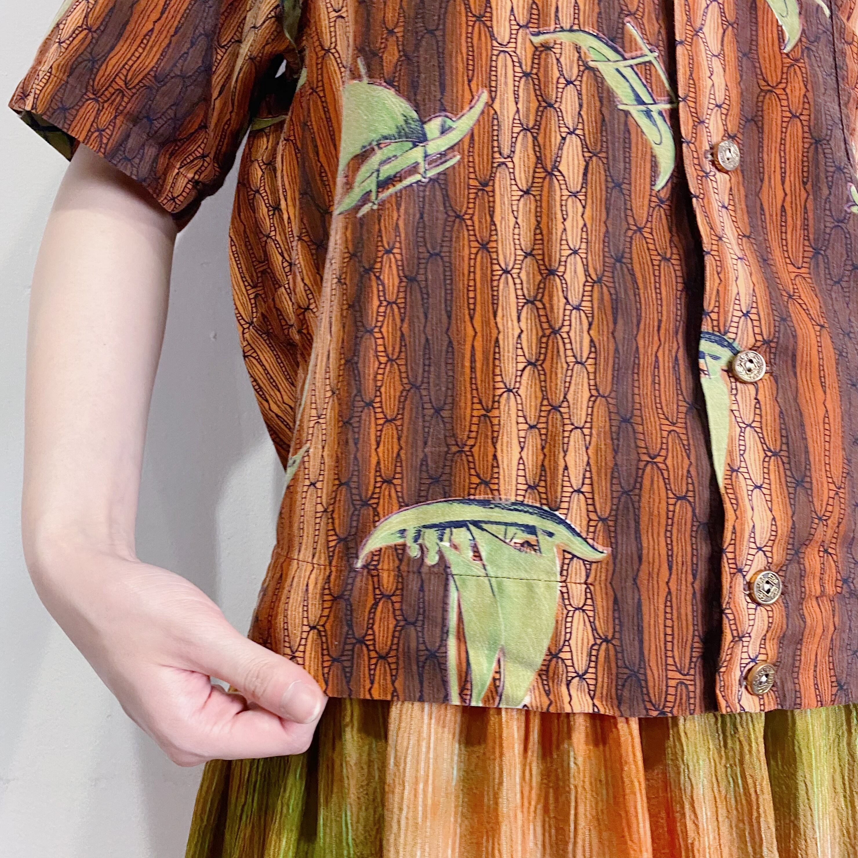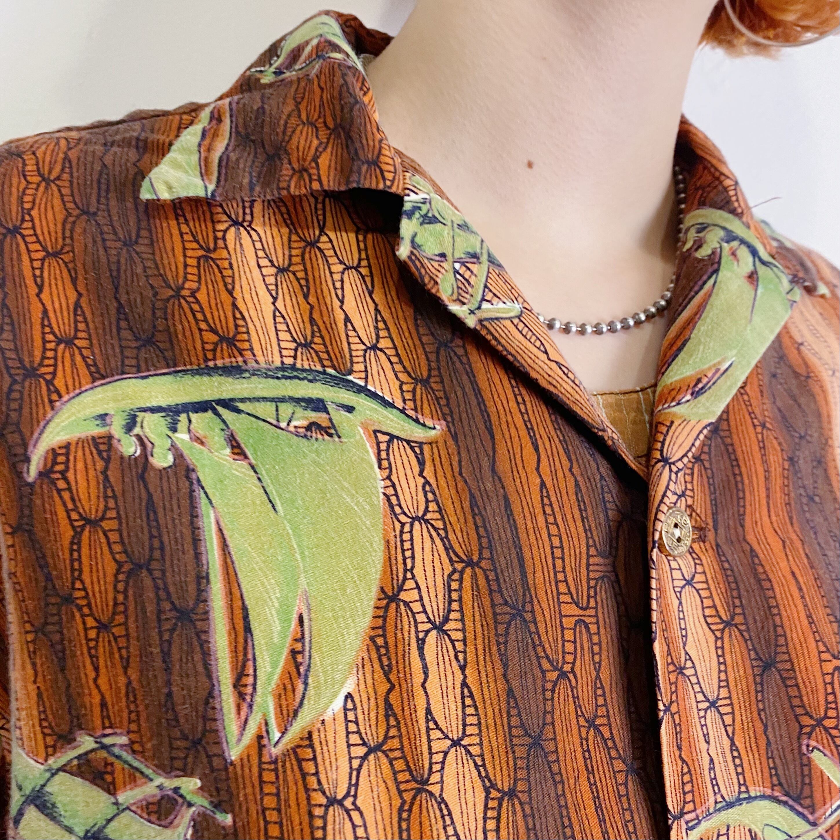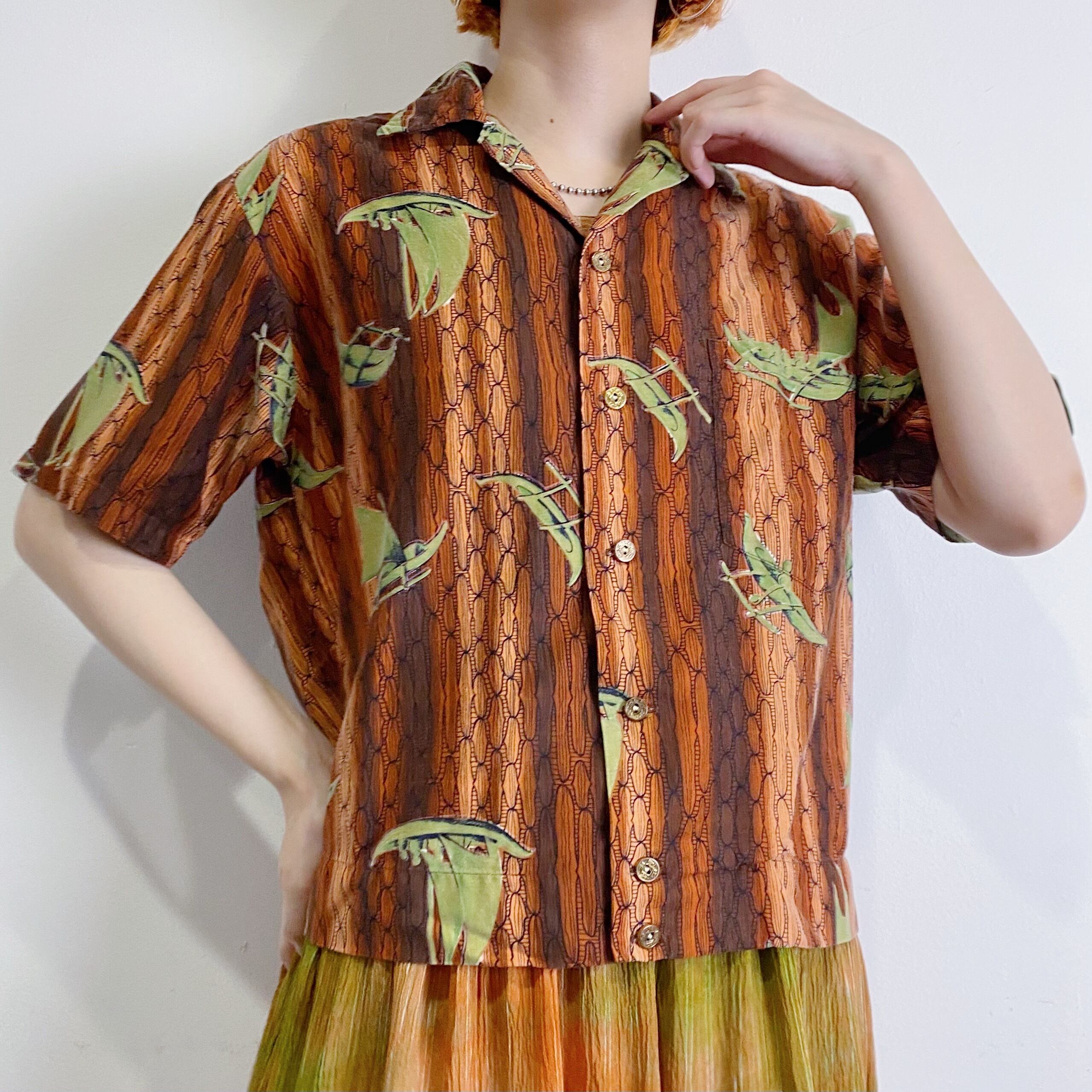 ブラウンとグリーンの色合いが着こなしやすそうな60年代頃の、古いハワイアンシャツです。