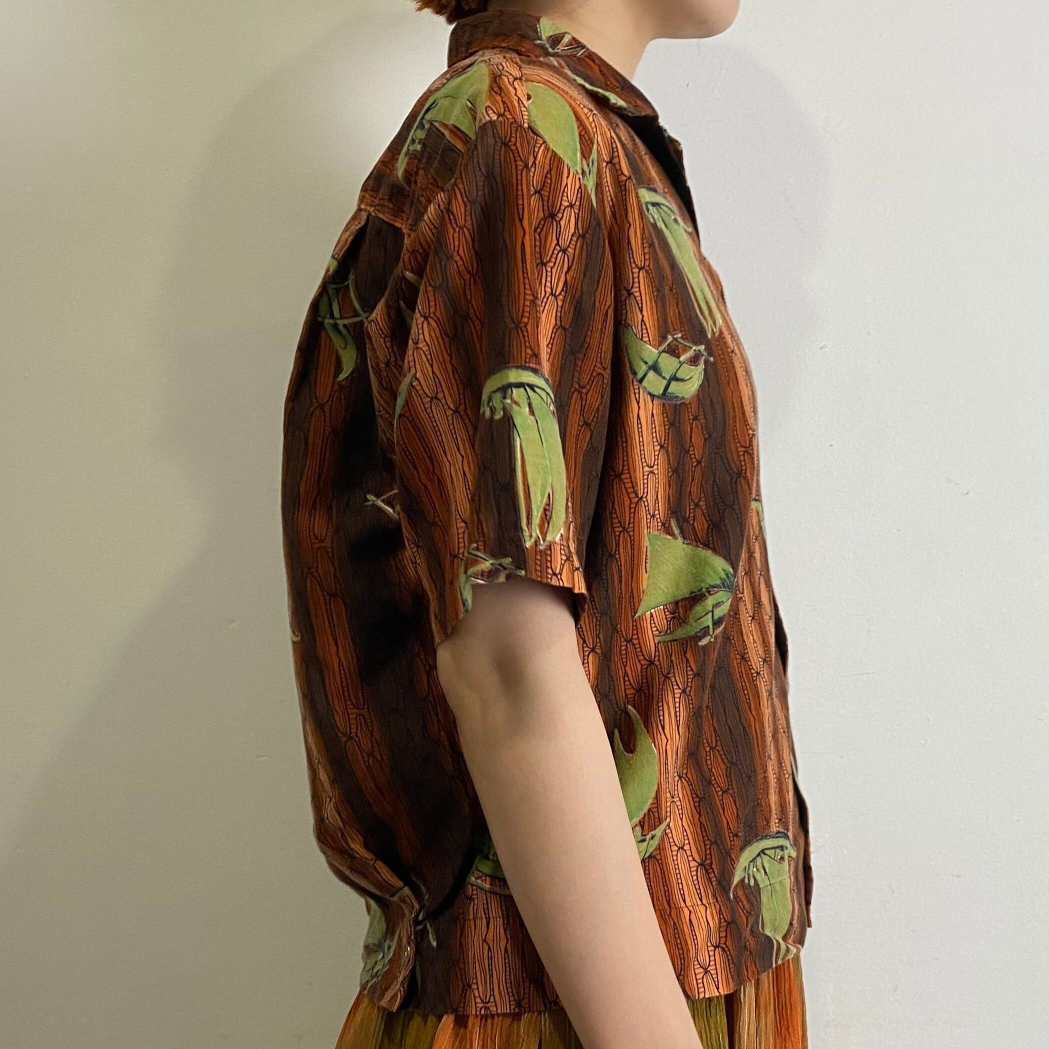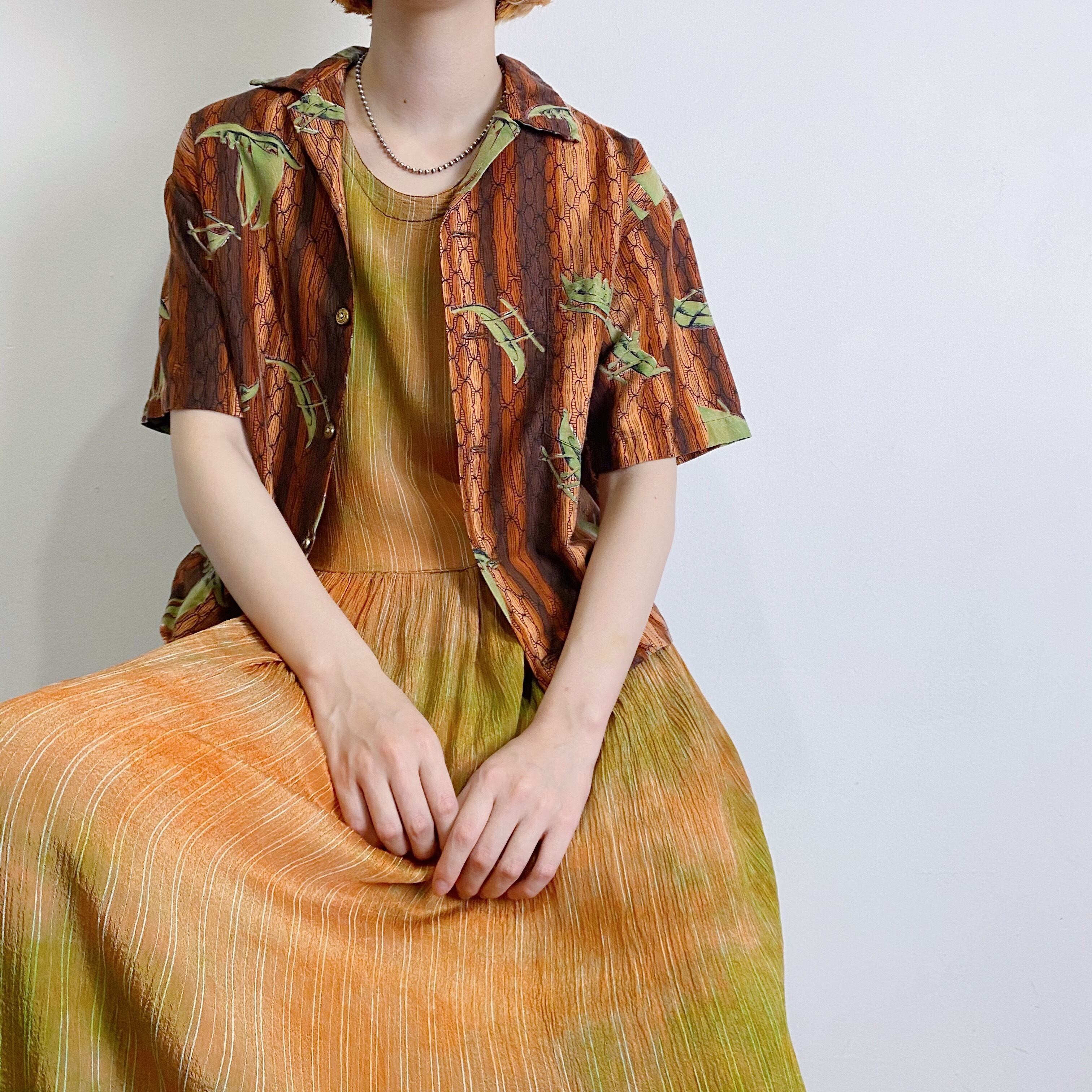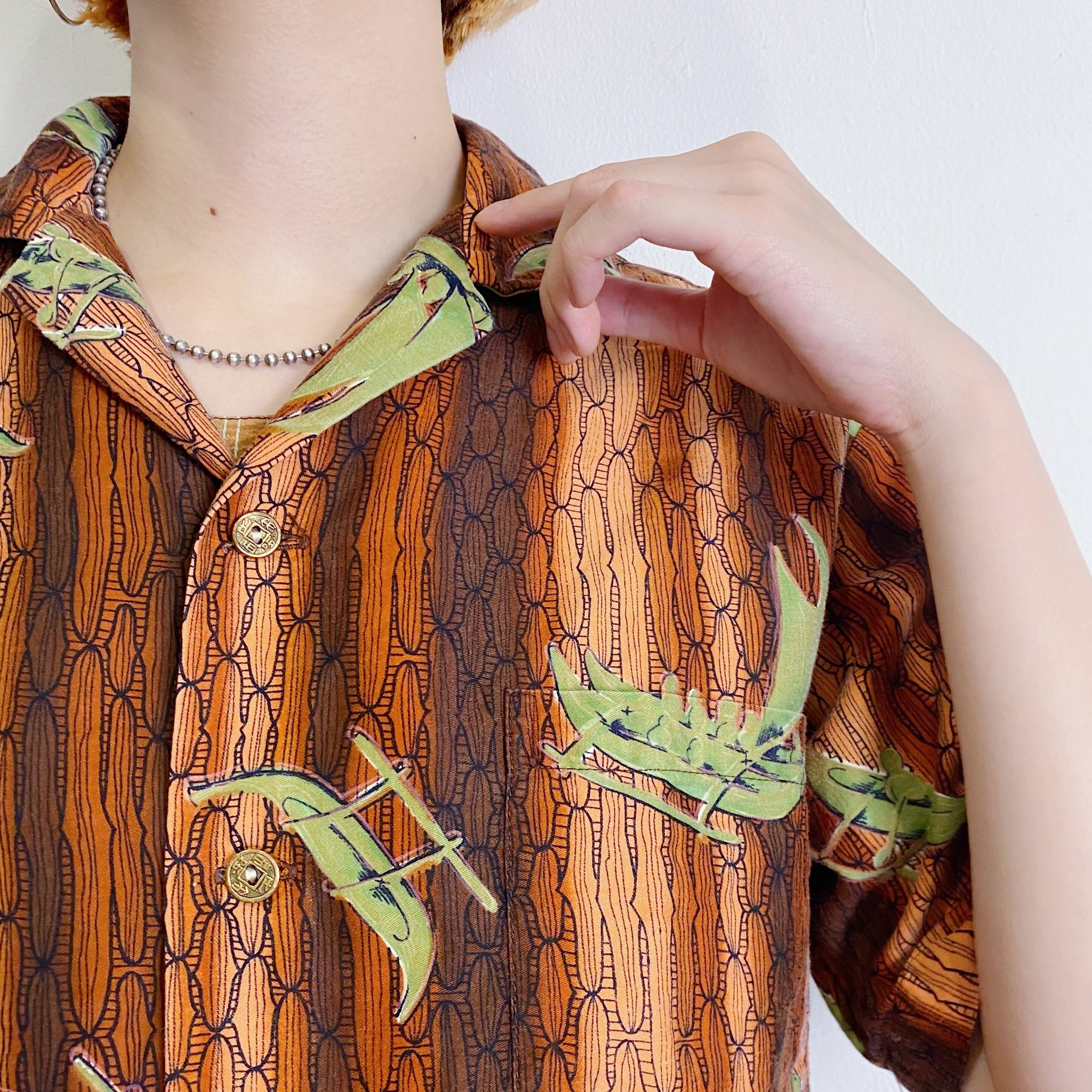 ブラウンとグリーンの色合いが着こなしやすそうな60年代頃の、古いハワイアンシャツです。