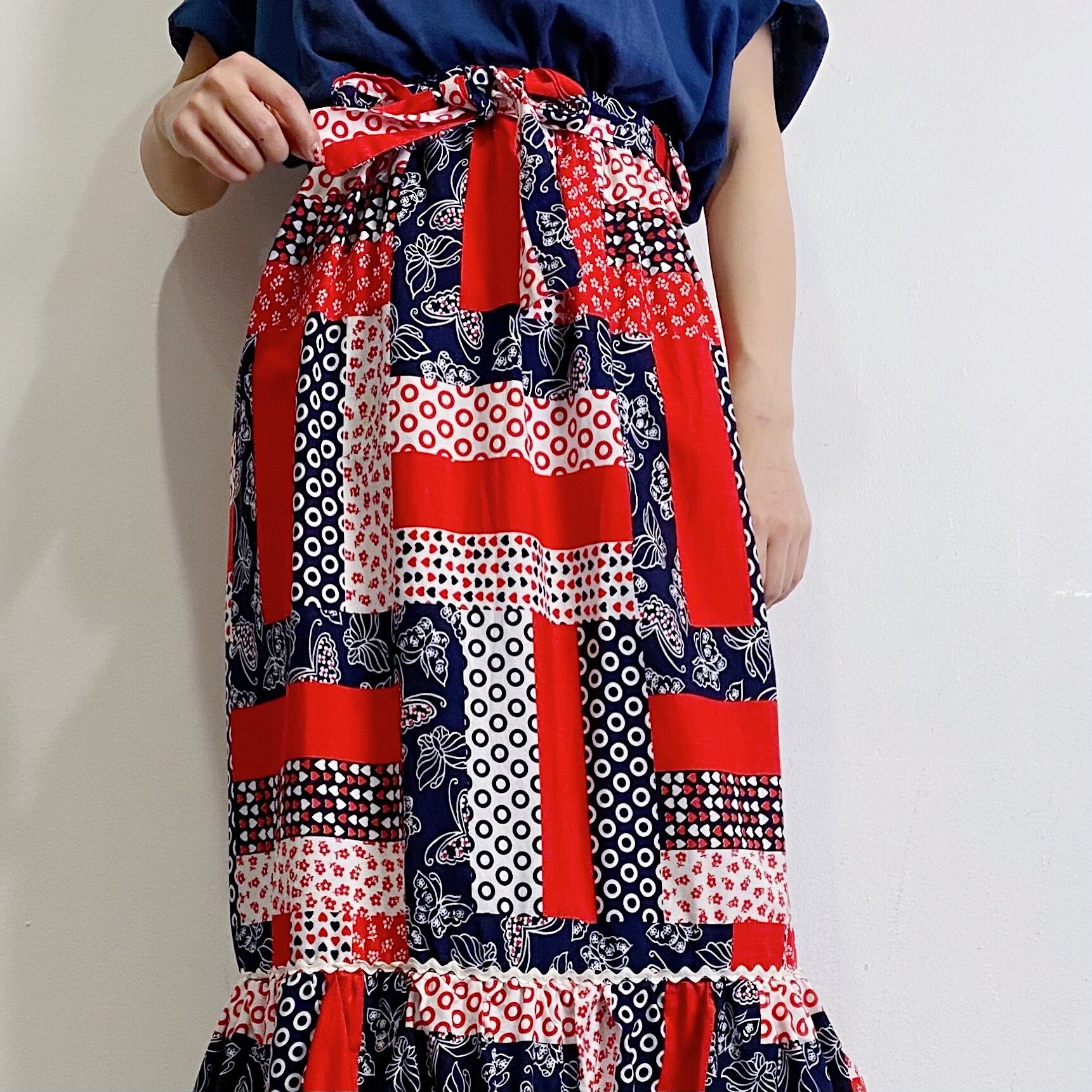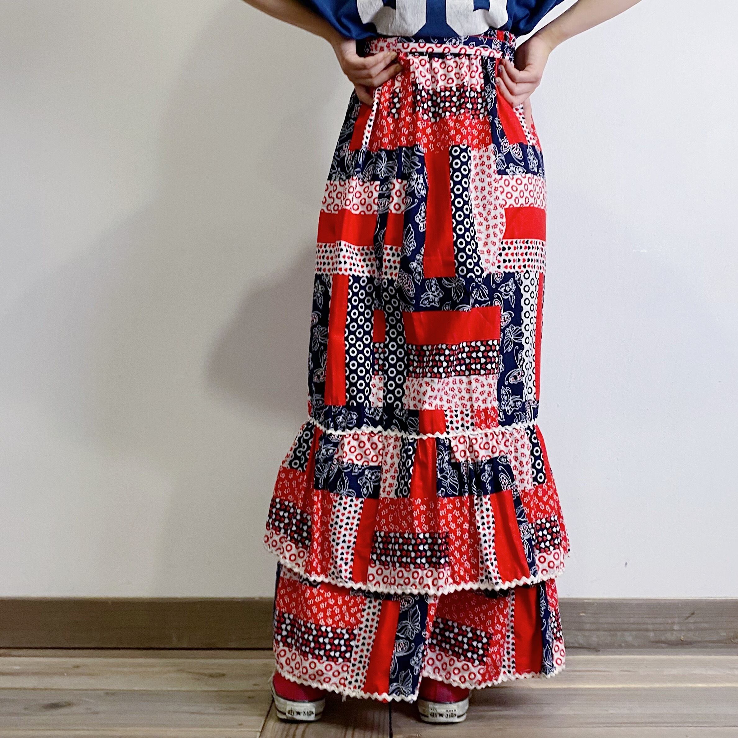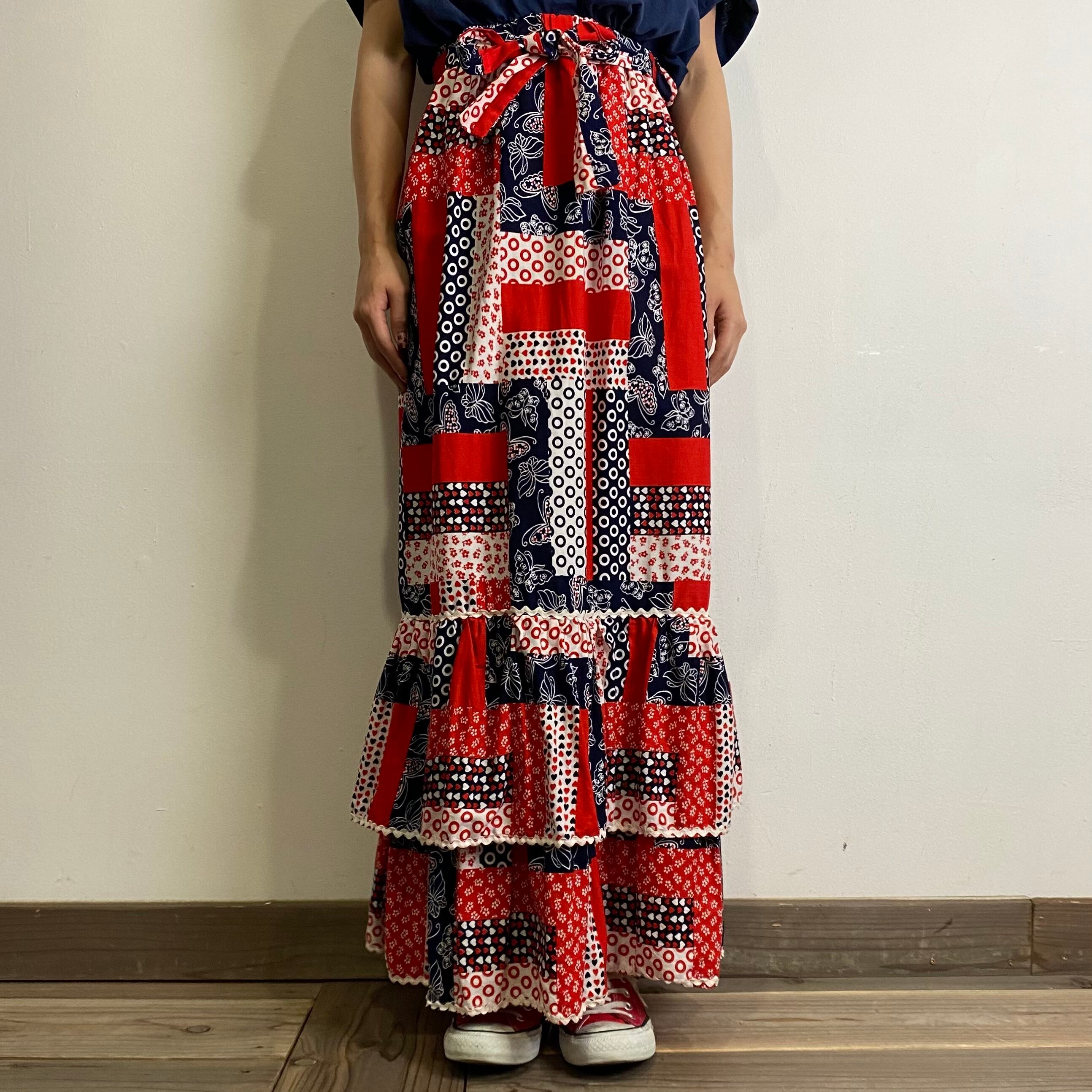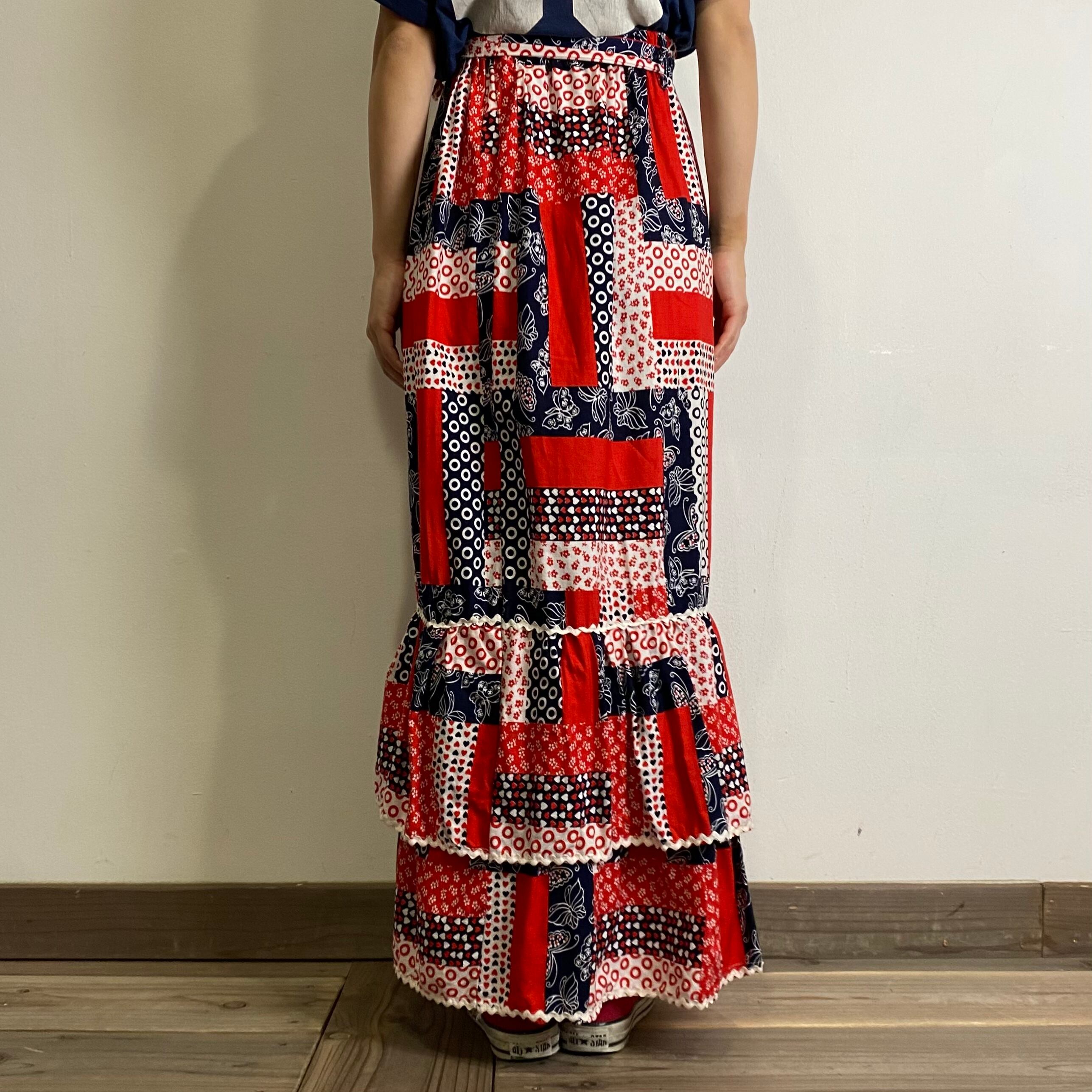 70年代のパッチワークプリントが可愛いロングスカートです。